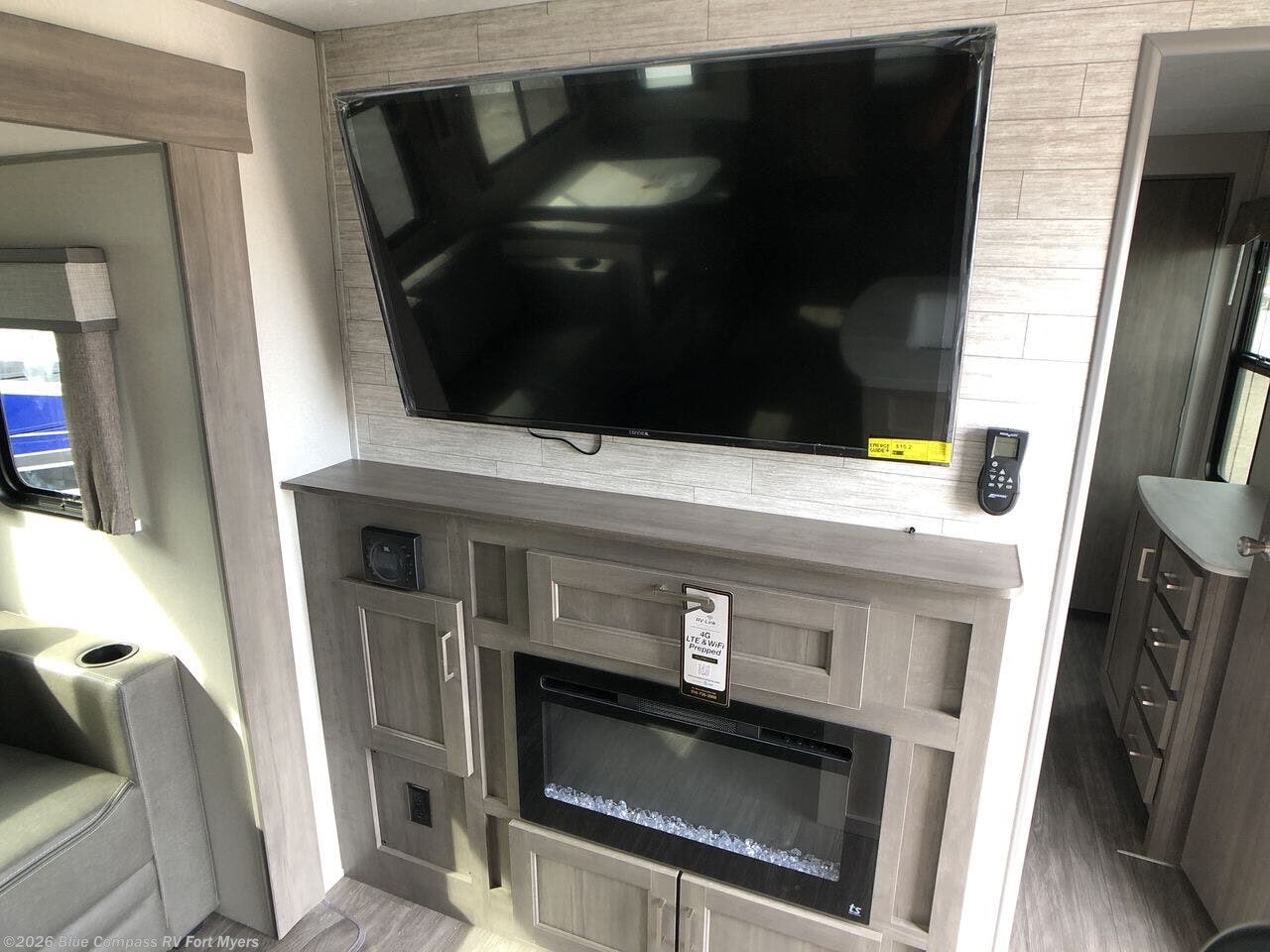 With two full bedrooms, everyone will have their own privacy in this travel trailer! The rear bedroom features a 60" x 74" queen bed slide across from a wardrobe and bed TV top with a cabinet, and the front bedroom features a 60" x 74" queen bed slide across from a dresser, plus a front closet that has an area with washer and dryer prep. You can prepare your best meals with the three-burner cooktop, enjoy them at the booth dinette, and store any leftovers in the 10.7 cu. ft. refrigerator. After a fun day outdoors, you can rinse off in the 34" x 34" radius shower pan with glass shower door in the full bathroom or relax on the 68" trundle sofa which has an arm rest with a cupholder and is next to the entertainment center with an optional fireplace!