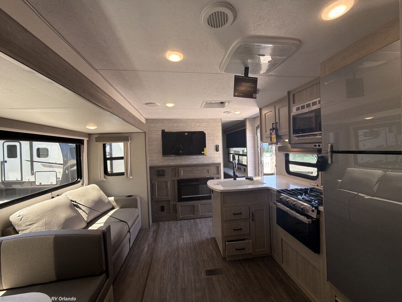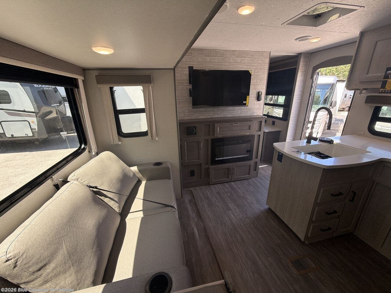 With two full bedrooms, everyone will have their own privacy in this travel trailer! The rear bedroom features a 60" x 74" queen bed slide across from a wardrobe and bed TV top with a cabinet, and the front bedroom features a 60" x 74" queen bed slide across from a dresser, plus a front closet that has an area with washer and dryer prep. You can prepare your best meals with the three-burner cooktop, enjoy them at the booth dinette, and store any leftovers in the 10.7 cu. ft. refrigerator. After a fun day outdoors, you can rinse off in the 34" x 34" radius shower pan with glass shower door in the full bathroom or relax on the 68" trundle sofa which has an arm rest with a cupholder and is next to the entertainment center with an optional fireplace!