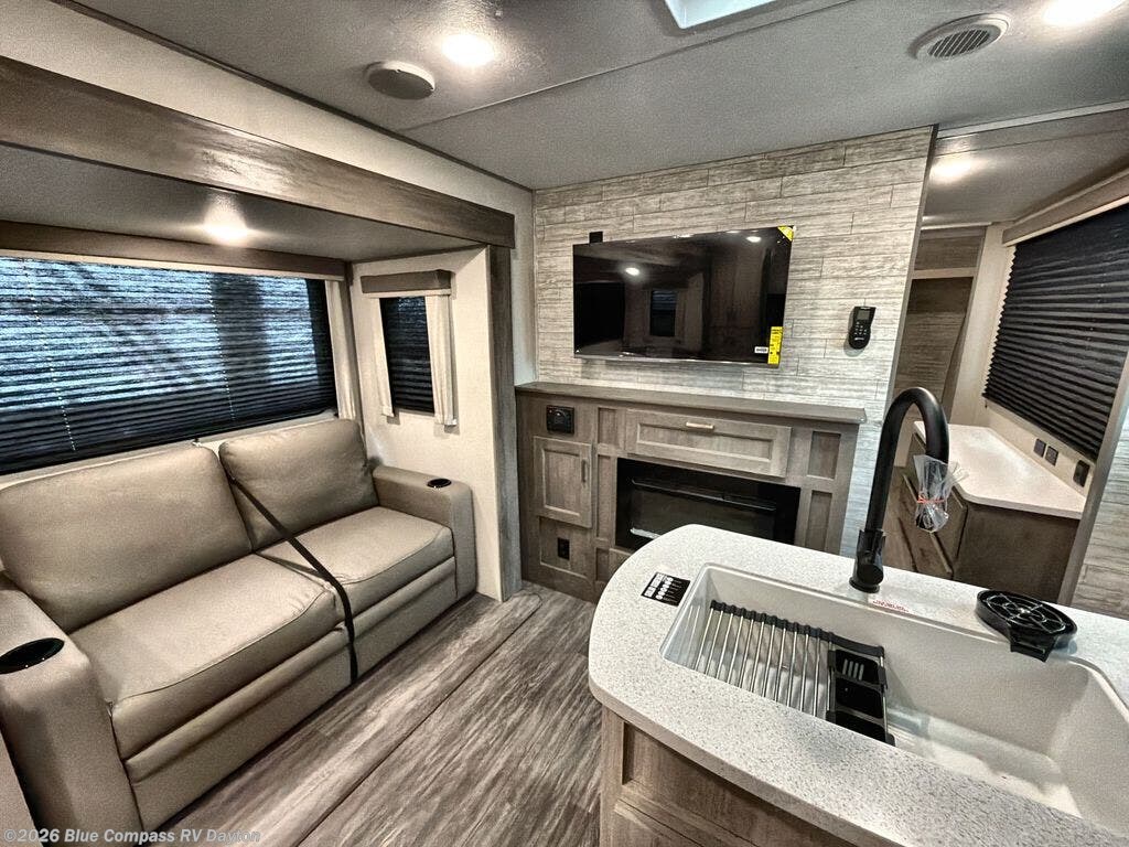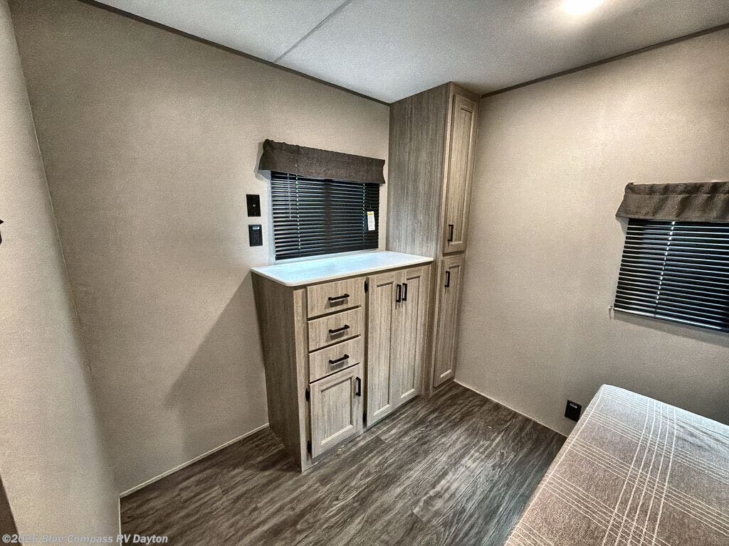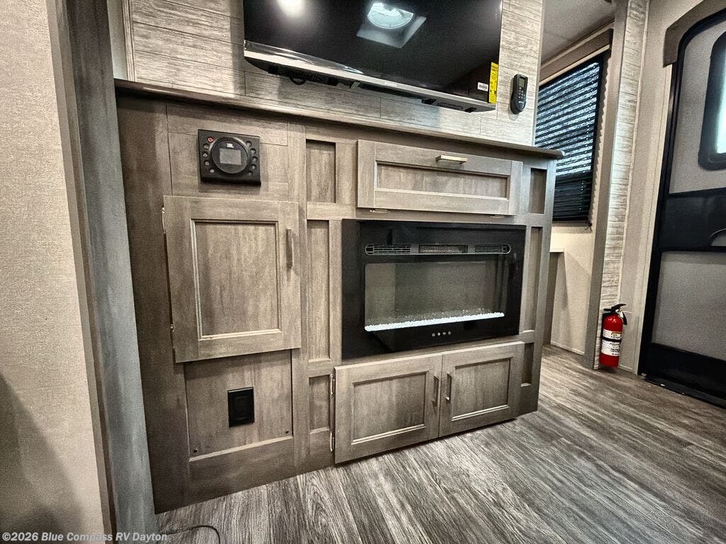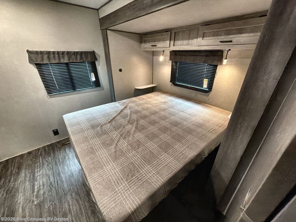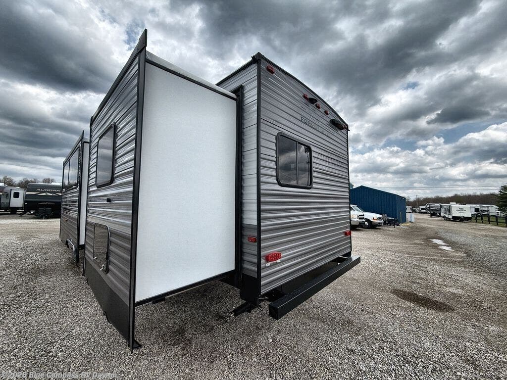 With two full bedrooms, everyone will have their own privacy in this travel trailer! The rear bedroom features a 60" x 74" queen bed slide across from a wardrobe and bed TV top with a cabinet, and the front bedroom features a 60" x 74" queen bed slide across from a dresser, plus a front closet that has an area with washer and dryer prep. You can prepare your best meals with the three-burner cooktop, enjoy them at the booth dinette, and store any leftovers in the 10.7 cu. ft. refrigerator. After a fun day outdoors, you can rinse off in the 34" x 34" radius shower pan with glass shower door in the full bathroom or relax on the 68" trundle sofa which has an arm rest with a cupholder and is next to the entertainment center with an optional fireplace!
