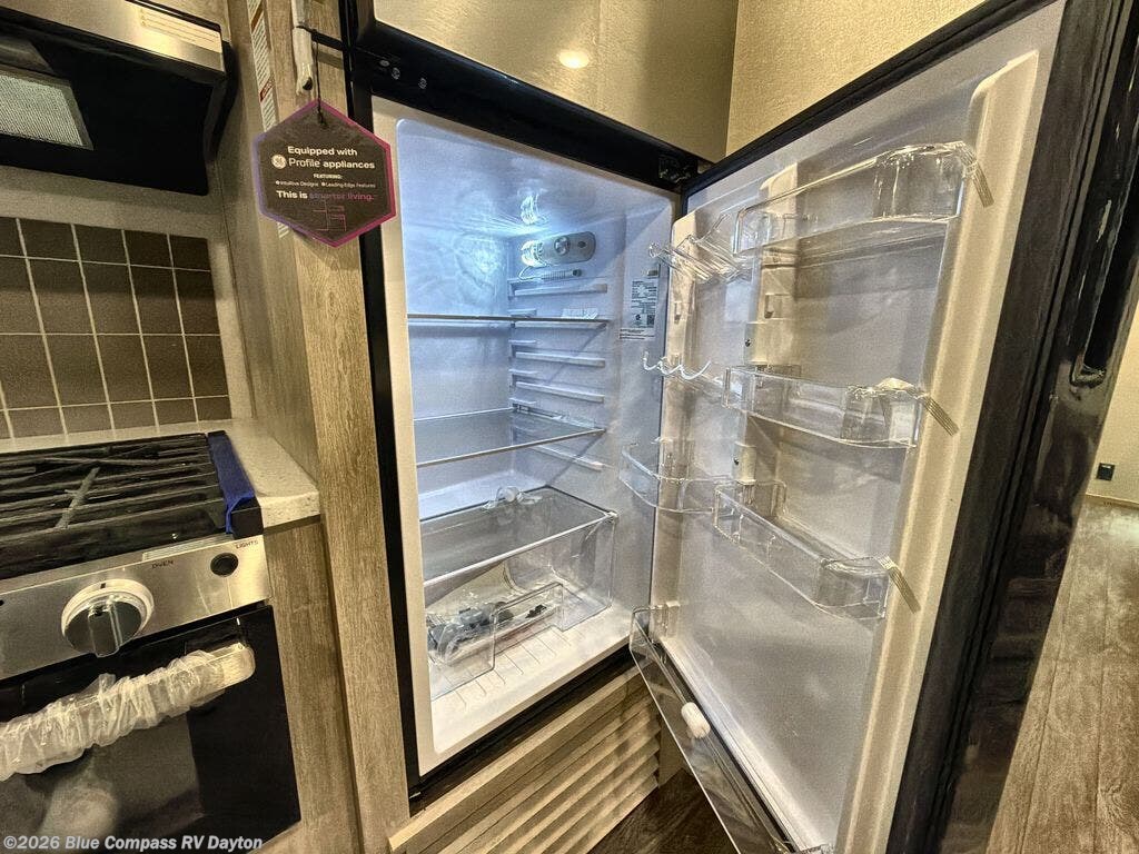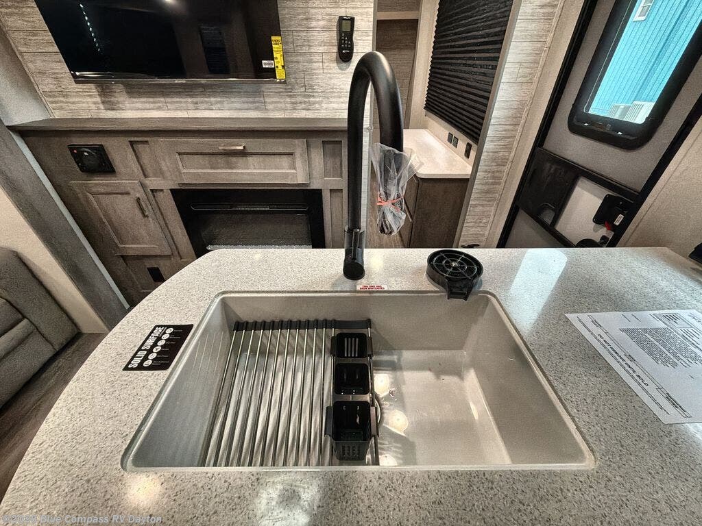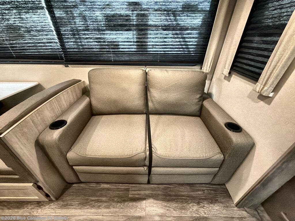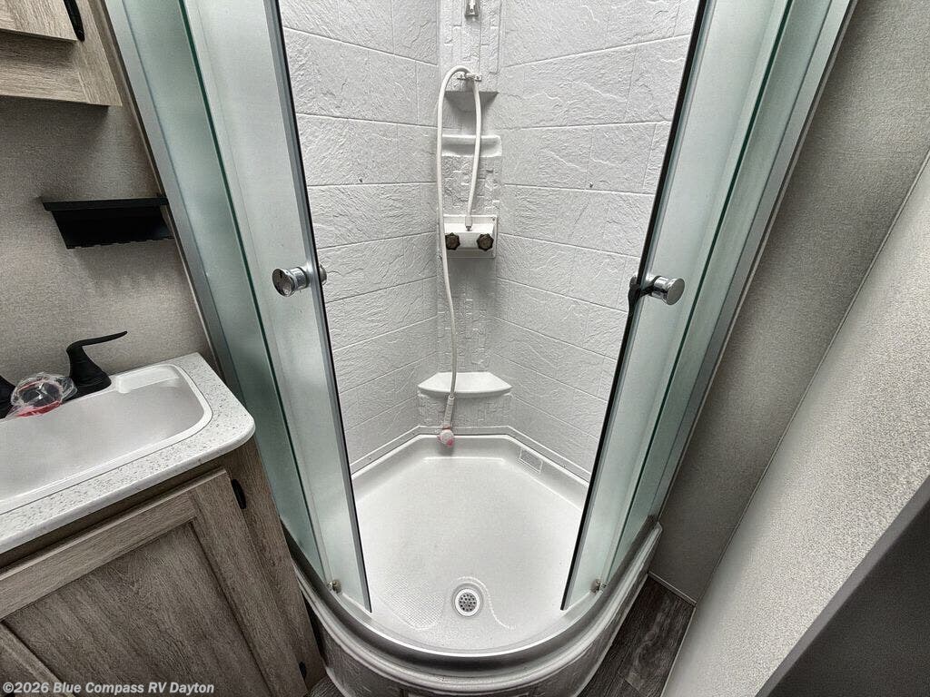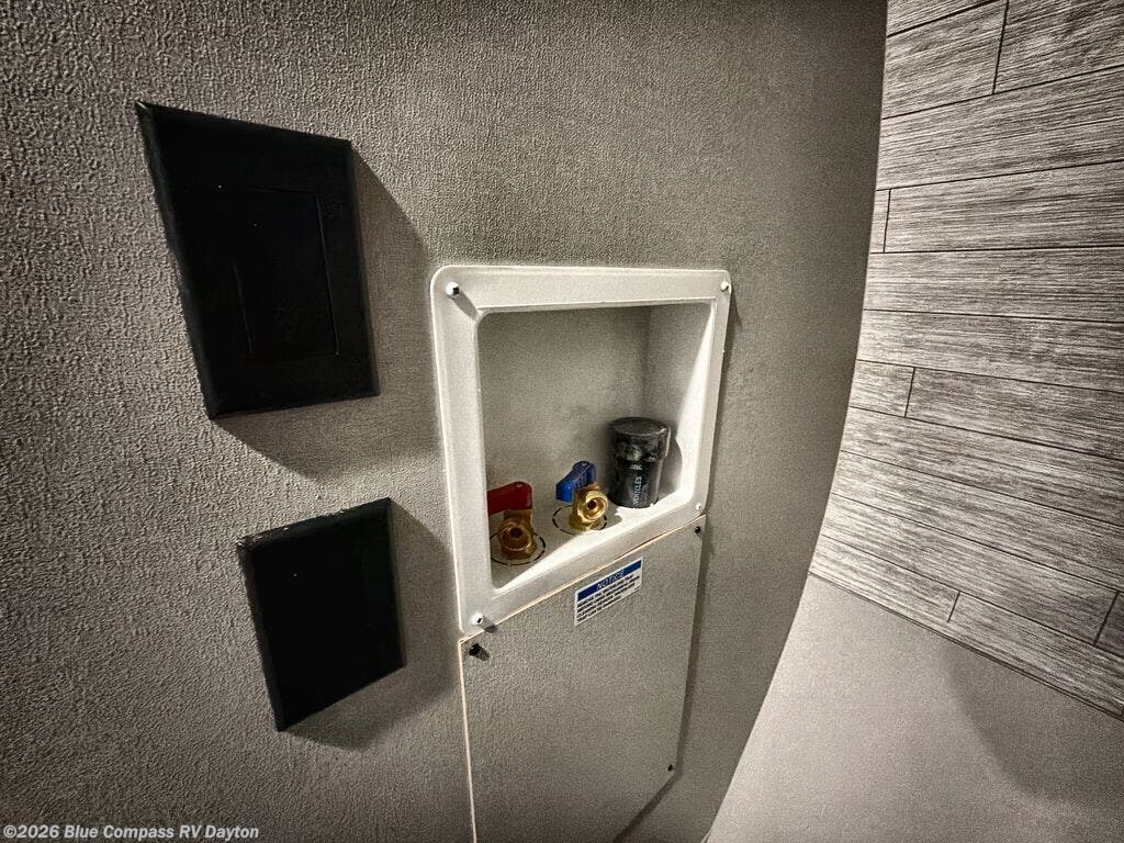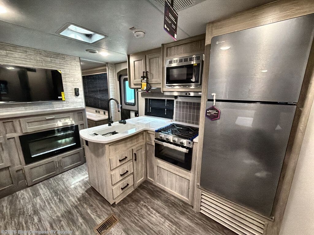 With two full bedrooms, everyone will have their own privacy in this travel trailer! The rear bedroom features a 60" x 74" queen bed slide across from a wardrobe and bed TV top with a cabinet, and the front bedroom features a 60" x 74" queen bed slide across from a dresser, plus a front closet that has an area with washer and dryer prep. You can prepare your best meals with the three-burner cooktop, enjoy them at the booth dinette, and store any leftovers in the 10.7 cu. ft. refrigerator. After a fun day outdoors, you can rinse off in the 34" x 34" radius shower pan with glass shower door in the full bathroom or relax on the 68" trundle sofa which has an arm rest with a cupholder and is next to the entertainment center with an optional fireplace!