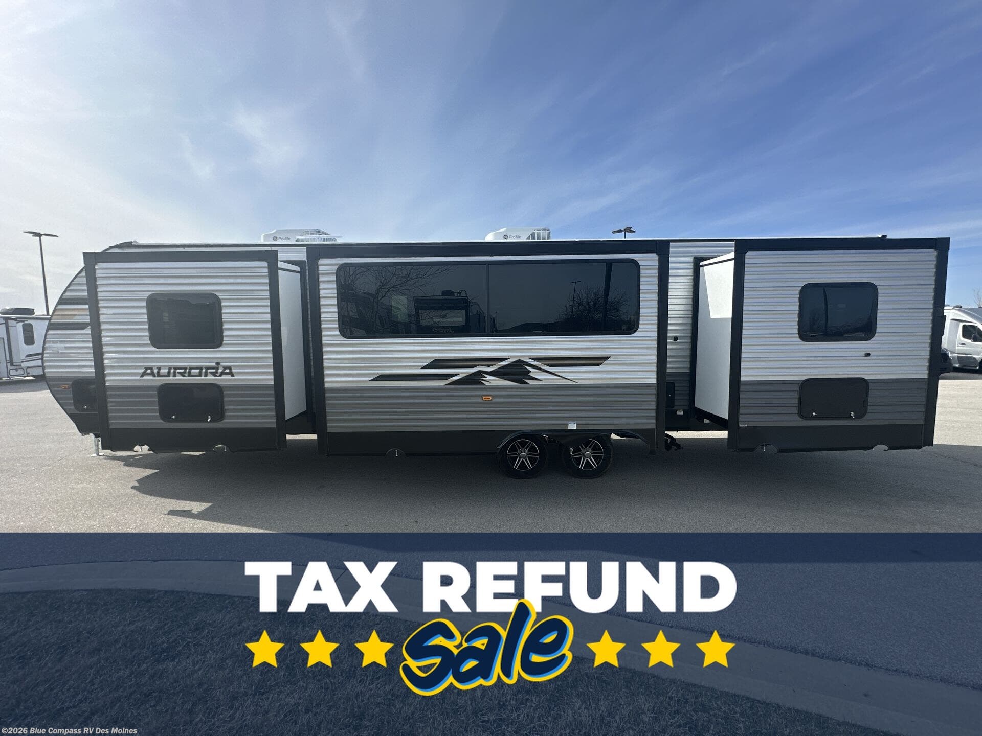 Request More Info on this 2026 Forest River Aurora 34BHTS (2 Queen Beds) Offered for sale by Blue Compass RV Des Moines