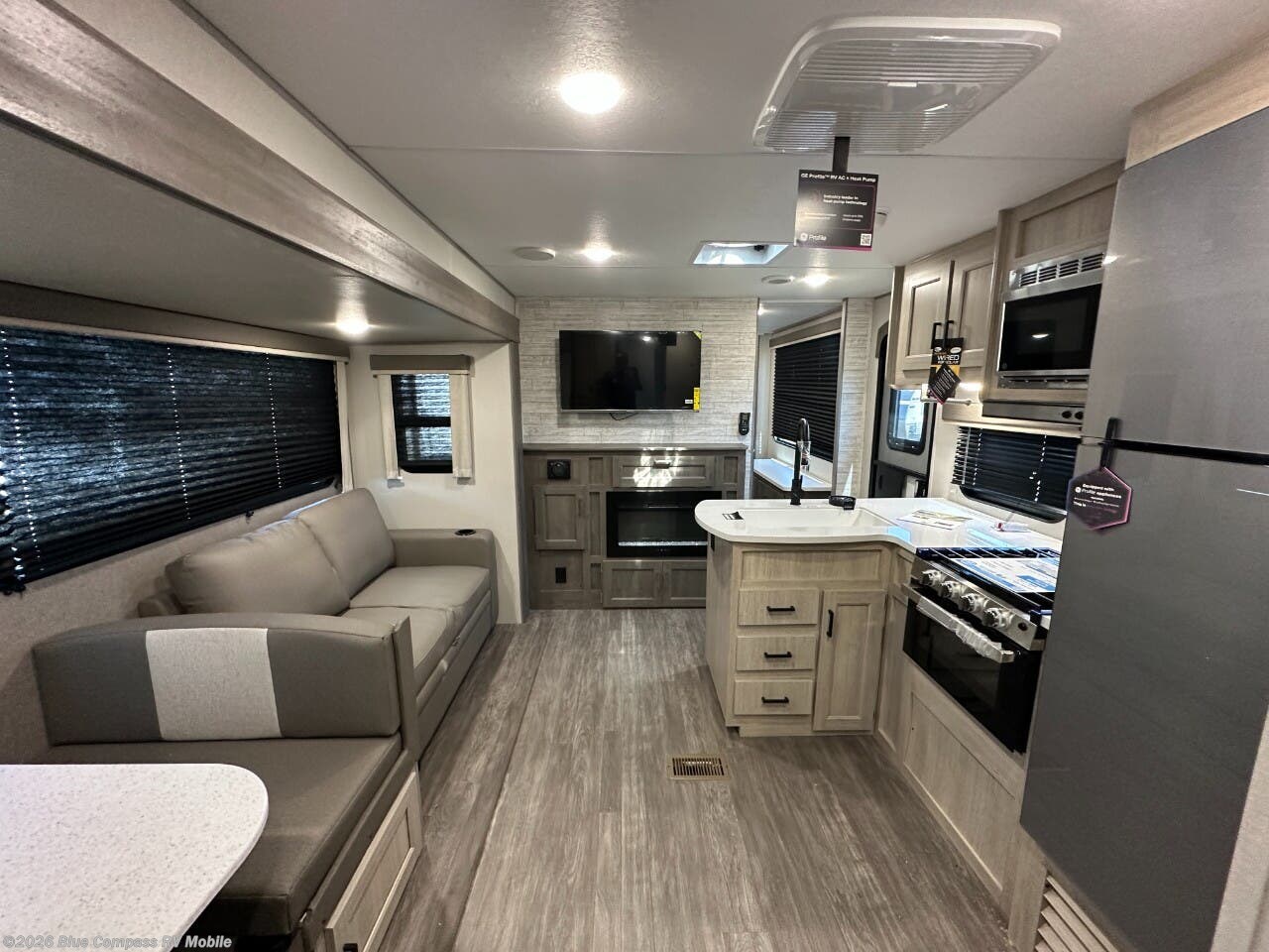 With two full bedrooms, everyone will have their own privacy in this travel trailer! The rear bedroom features a 60" x 74" queen bed slide across from a wardrobe and bed TV top with a cabinet, and the front bedroom features a 60" x 74" queen bed slide across from a dresser, plus a front closet that has an area with washer and dryer prep. You can prepare your best meals with the three burner cooktop, enjoy them at the booth dinette, and store any leftovers in the 10.7 cu. ft. refrigerator. After a fun day outdoors, you can rinse off in the 34" x 34" radius shower pan with glass shower door in the full bathroom or relax on the 68" sofa which has an arm rest with a cupholder and is next to the entertainment center with an optional fireplace!