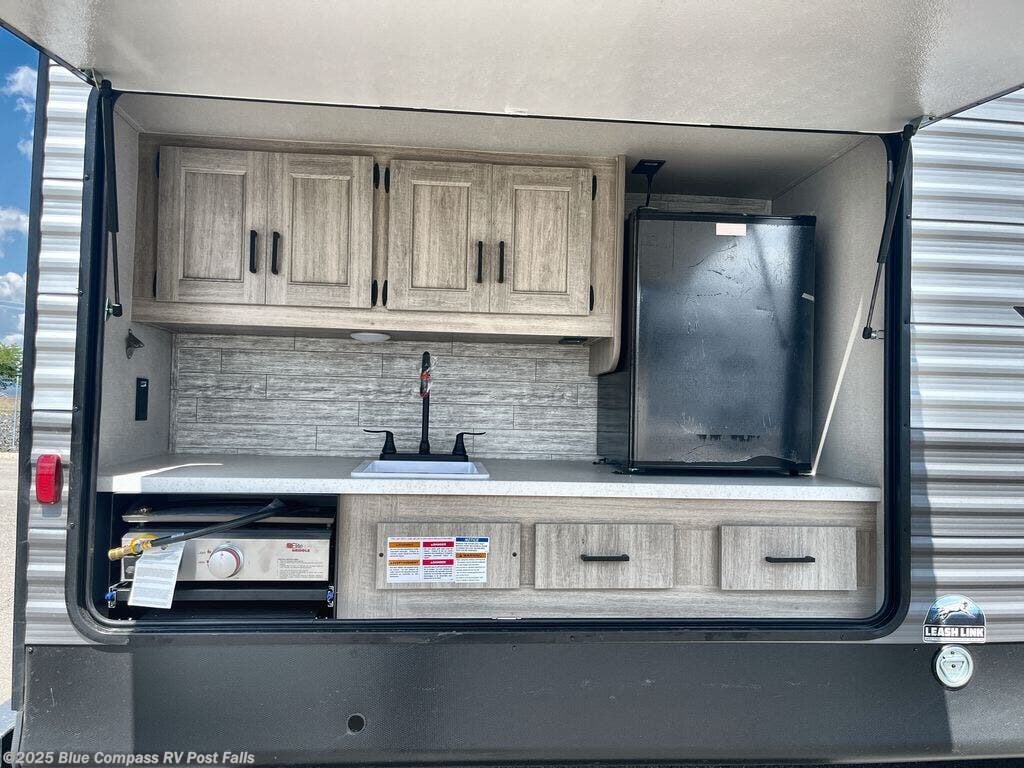 The whole gang will have a good time camping in this travel trailer! There is a place for everyone to sleep between the rear private bunkhouse with a 40" x 74" loft bed and a flip up bunk bed above a jackknife sofa, and the front private bedroom has a 60" x 74" queen bed slide, plus the booth dinette and 60" sofa in the main living area can provide extra sleeping spaces. You could even choose to switch out the bunk and sofa for an optional queen bed instead. The bedroom also has a dresser and a front closet that is big enough for your clothes and an area with washer and dryer prep. The chef can choose to either cook indoors with the three burner cooktop or breathe in some fresh air while cooking at the outside camp kitchen with a refrigerator, a sink, overhead cabinets, and a grill with drawers next to it for your cooking utensils!