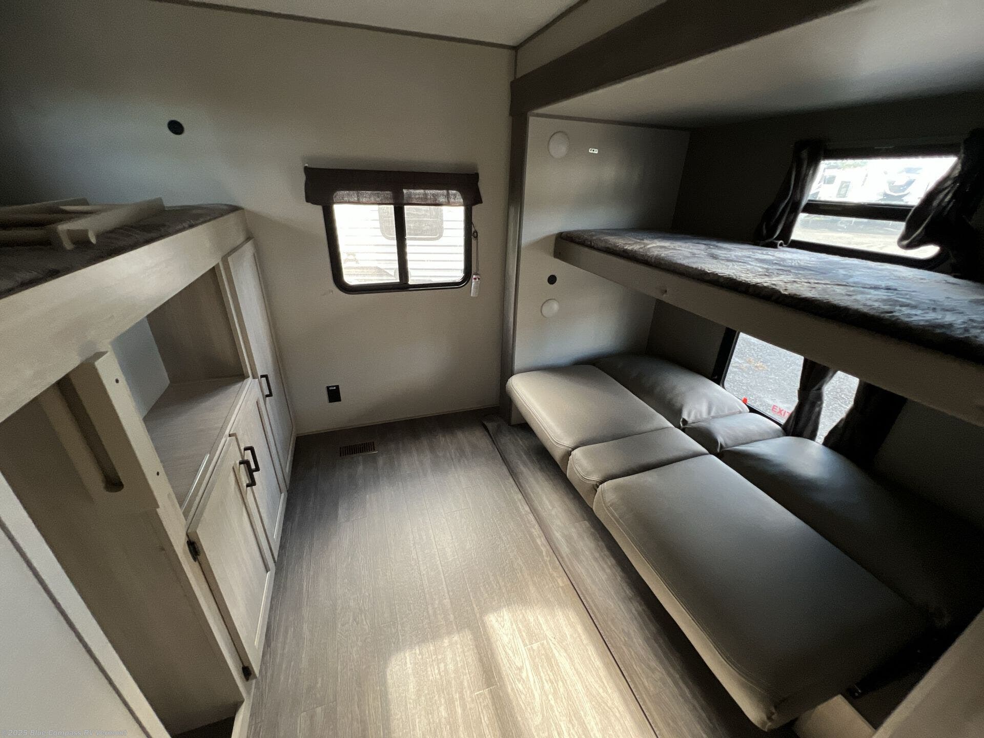 The whole gang will have a good time camping in this travel trailer! There is a place for everyone to sleep between the rear private bunkhouse with a 40" x 74" loft bed and a flip up bunk bed above a jackknife sofa, and the front private bedroom has a 60" x 74" queen bed slide, plus the booth dinette and 60" sofa in the main living area can provide extra sleeping spaces. You could even choose to switch out the bunk and sofa for an optional queen bed instead. The bedroom also has a dresser and a front closet that is big enough for your clothes and an area with washer and dryer prep. The chef can choose to either cook indoors with the three burner cooktop or breathe in some fresh air while cooking at the outside camp kitchen with a refrigerator, a sink, overhead cabinets, and a grill with drawers next to it for your cooking utensils!