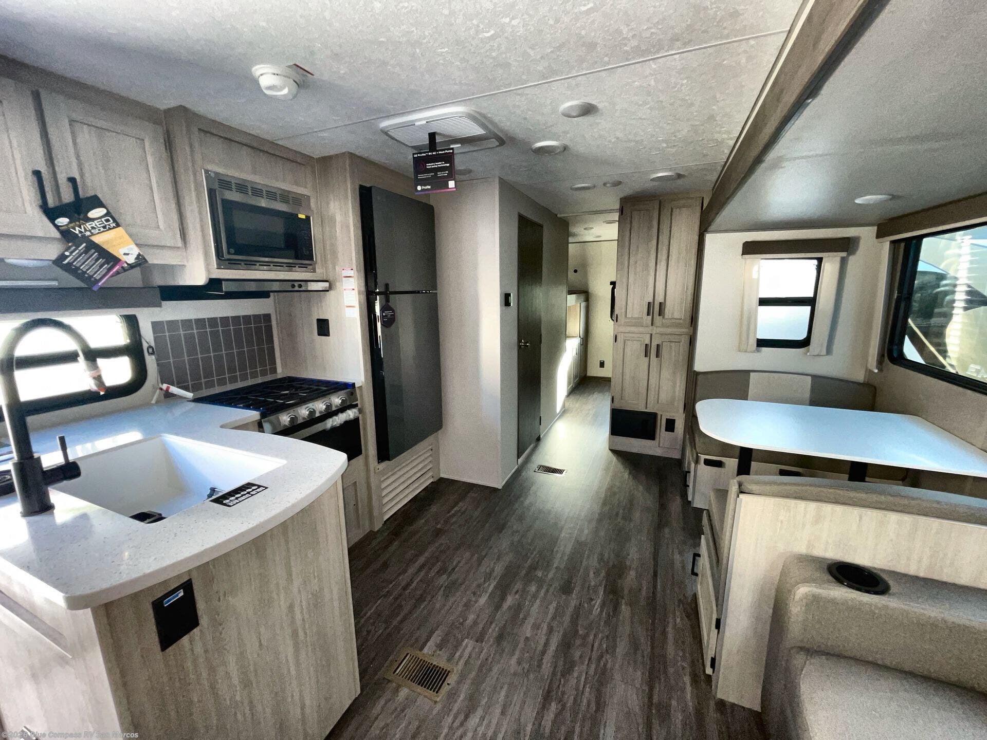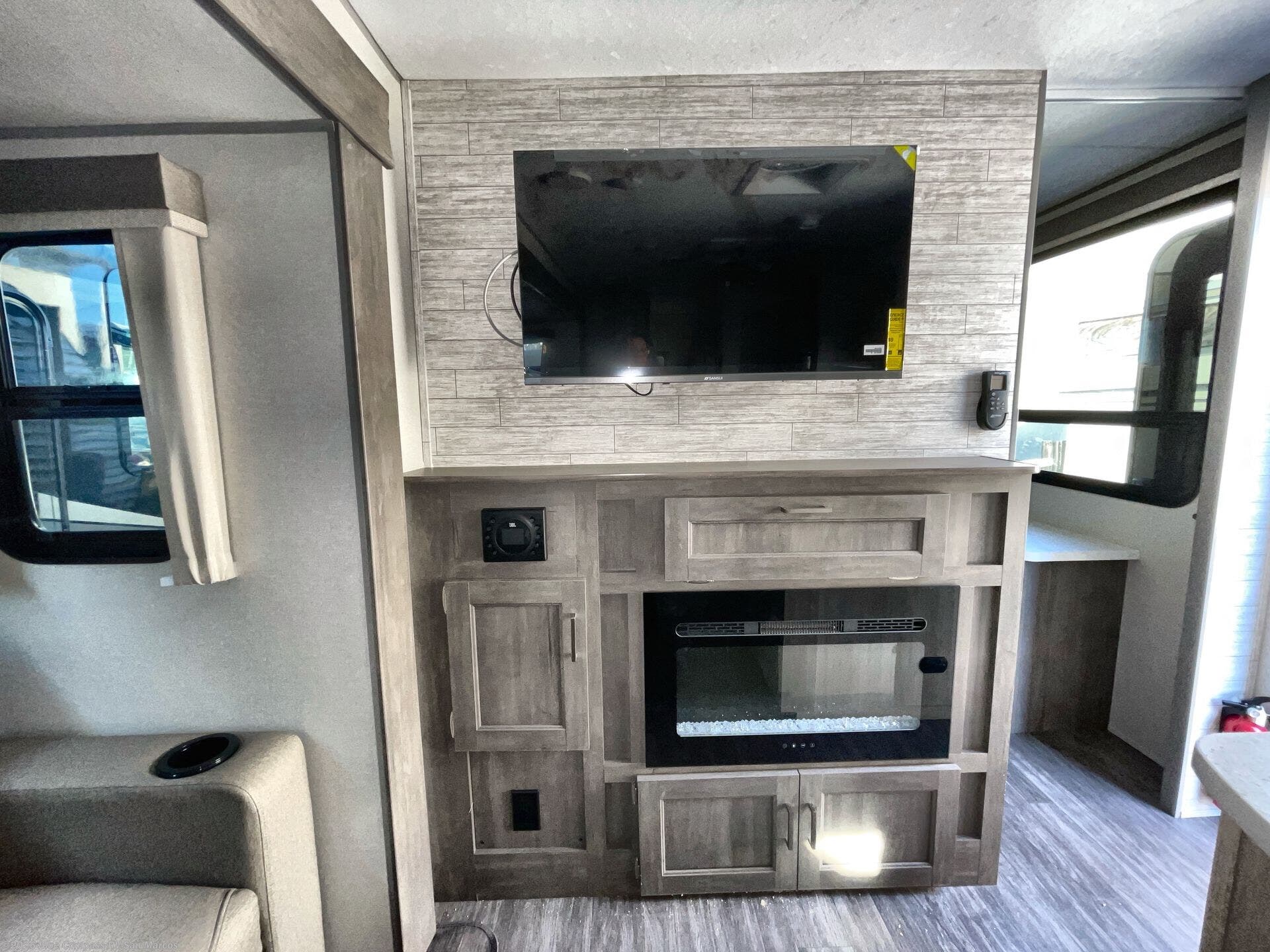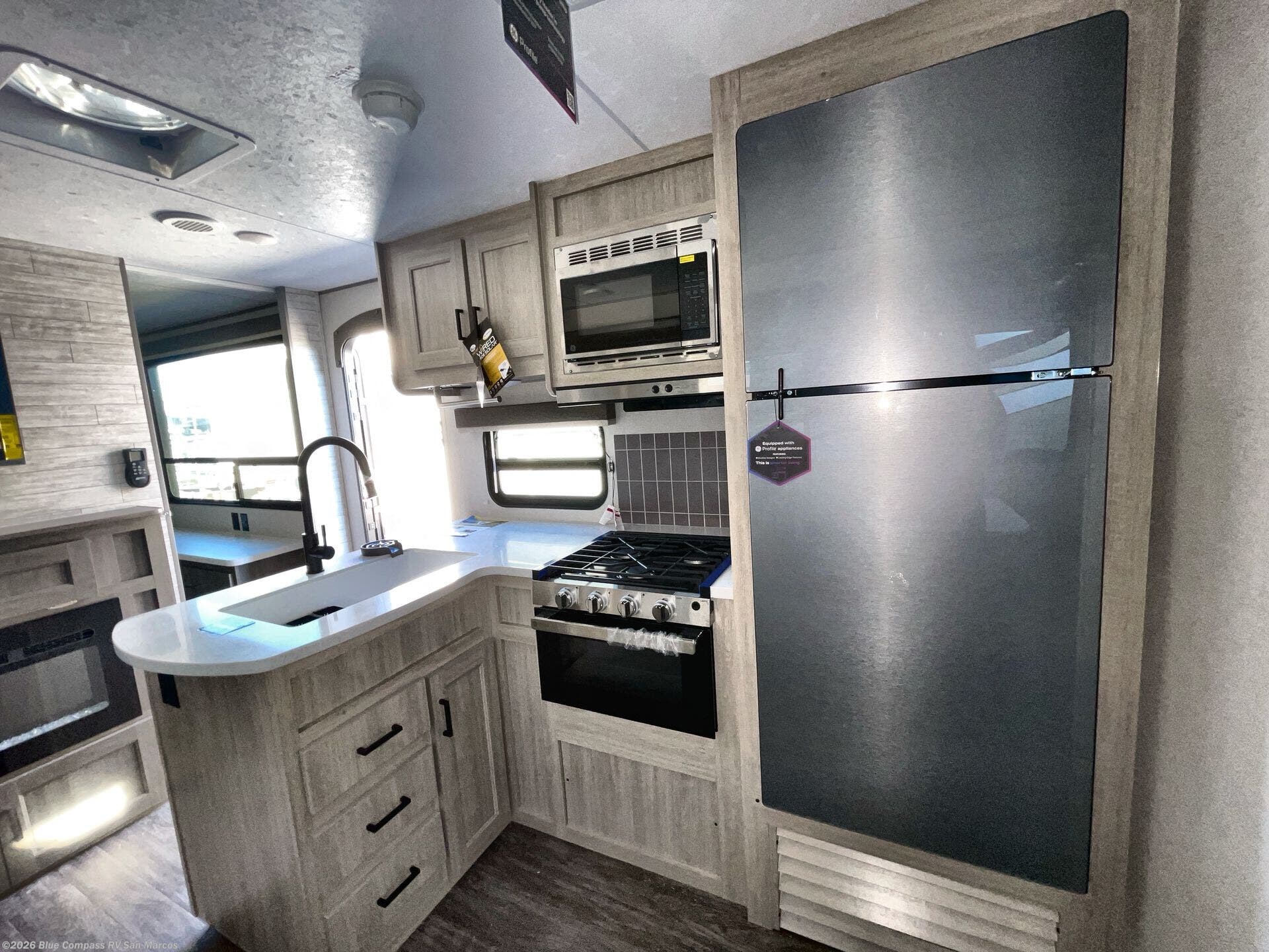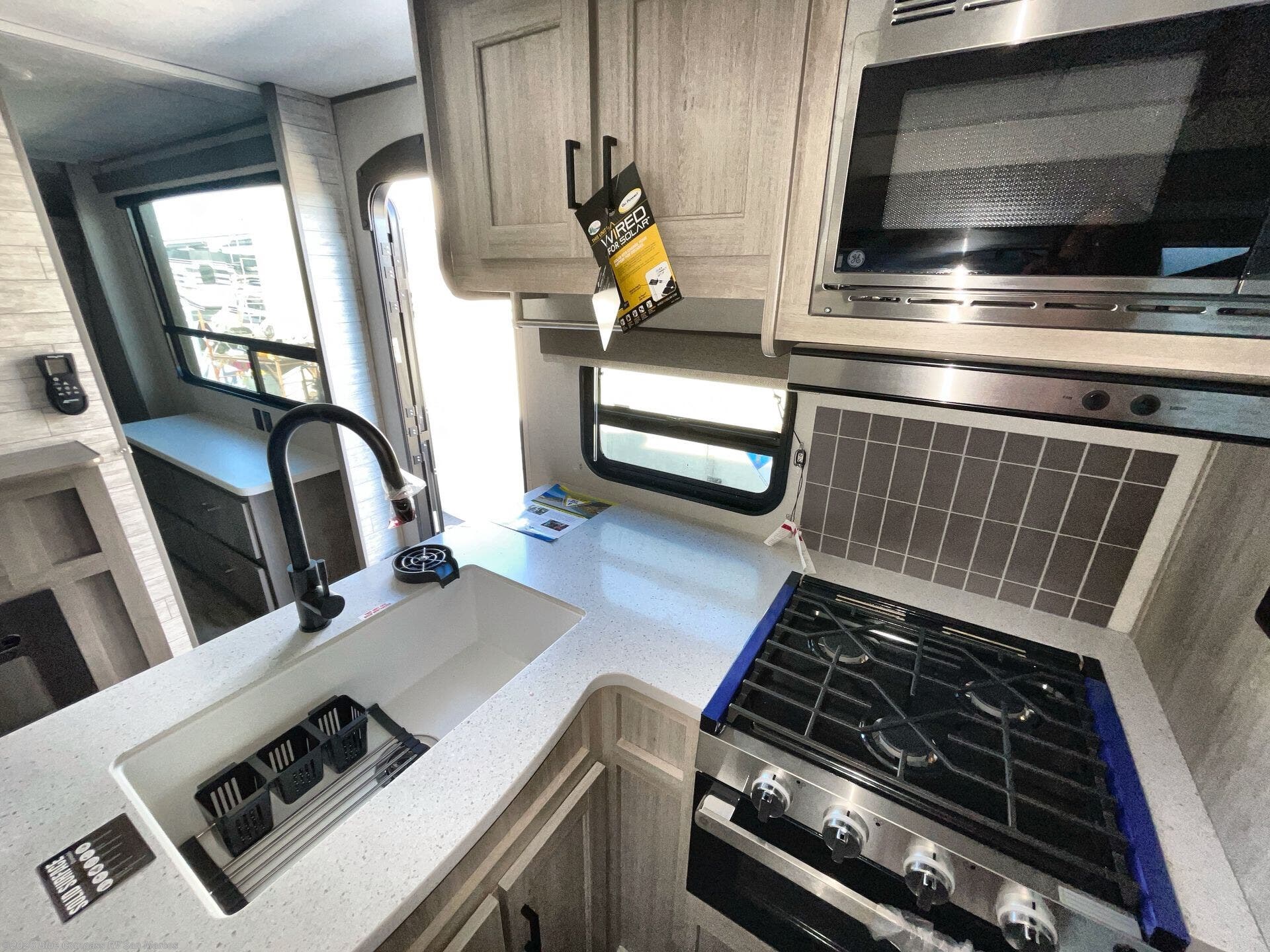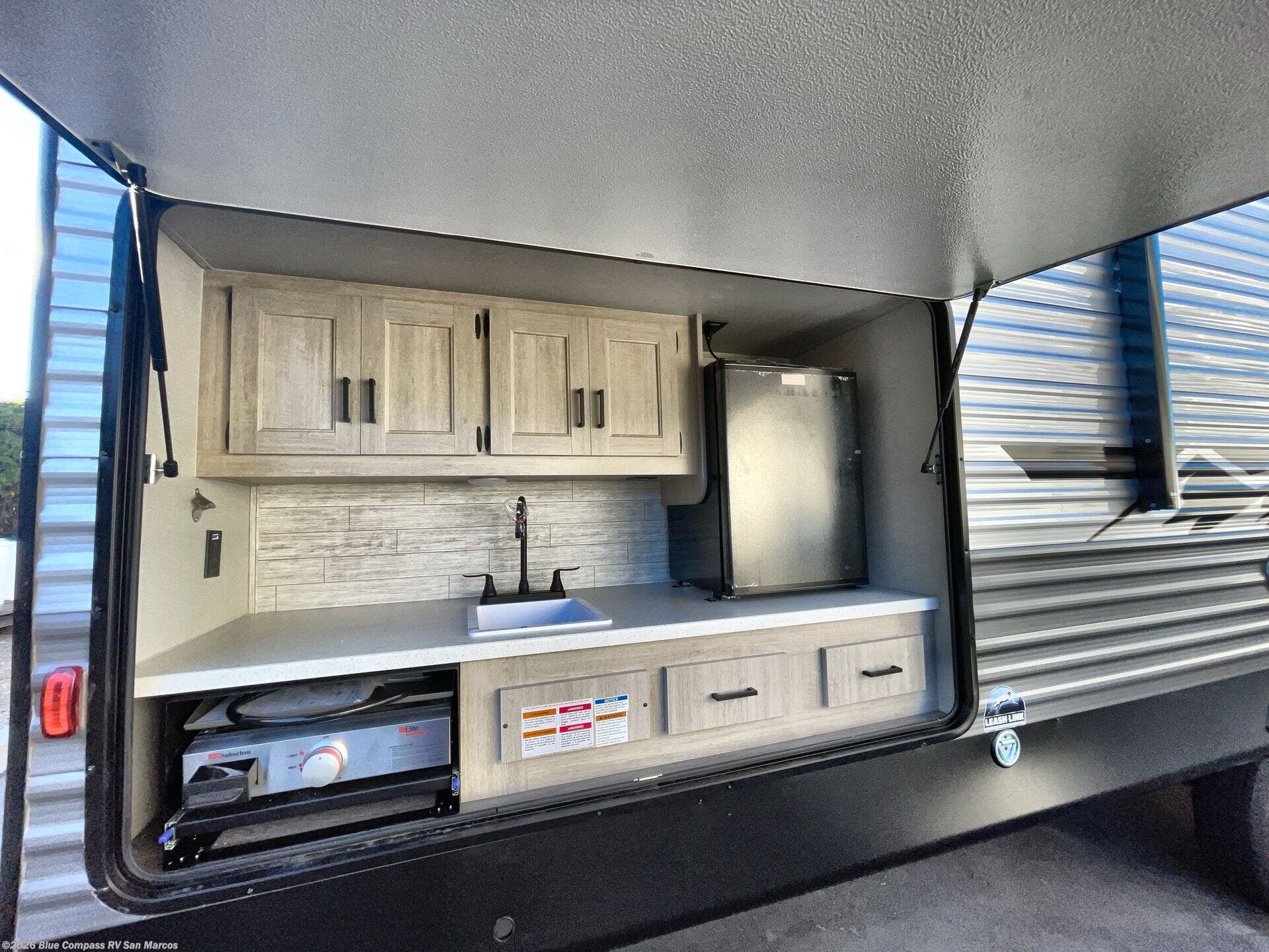 The whole gang will have a good time camping in this travel trailer! There is a place for everyone to sleep between the rear private bunkhouse with a 40" x 74" loft bed and a flip up bunk bed above a jackknife sofa, and the front private bedroom has a 60" x 74" queen bed slide, plus the booth dinette and 60" sofa in the main living area can provide extra sleeping spaces. You could even choose to switch out the bunk and sofa for an optional queen bed instead. The bedroom also has a dresser and a front closet that is big enough for your clothes and an area with washer and dryer prep. The chef can choose to either cook indoors with the three burner cooktop or breathe in some fresh air while cooking at the outside camp kitchen with a refrigerator, a sink, overhead cabinets, and a grill with drawers next to it for your cooking utensils!