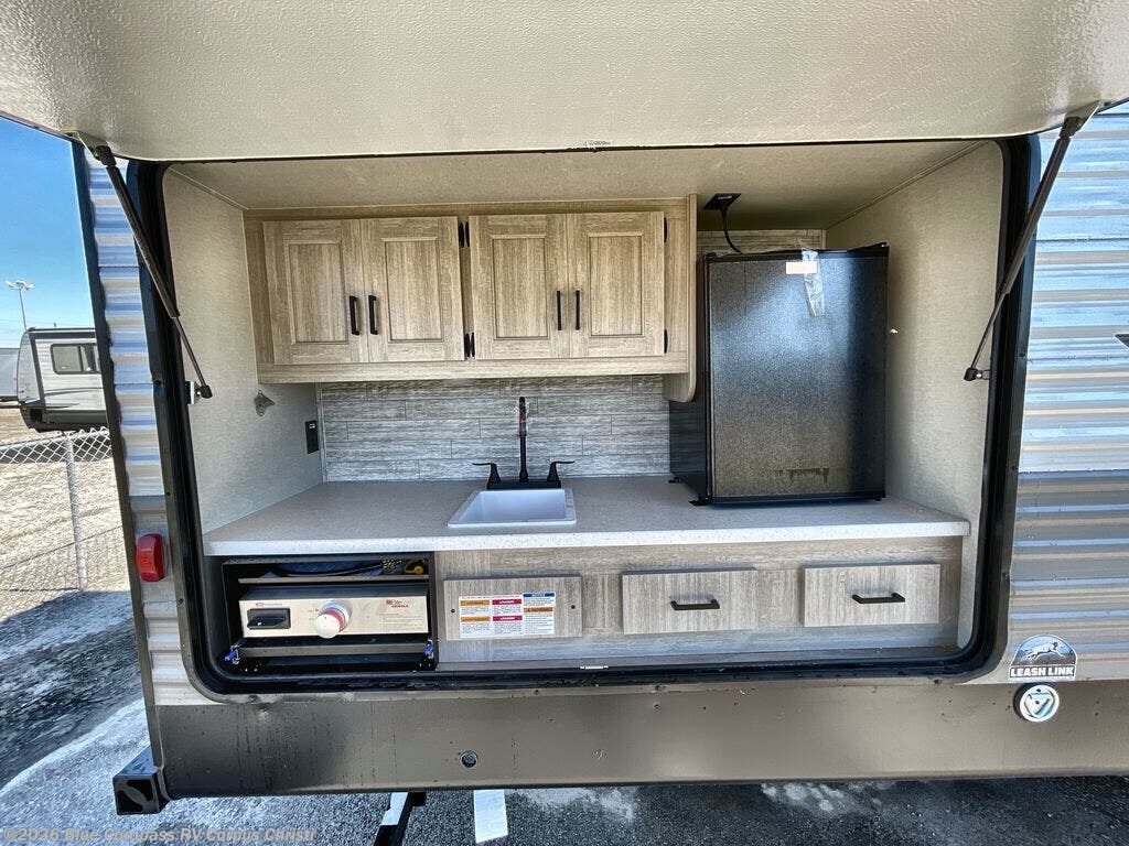 The whole gang will have a good time camping in this travel trailer! There is a place for everyone to sleep between the rear private bunkhouse with a 40" x 74" loft bed and a flip up bunk bed above a jackknife sofa, and the front private bedroom has a 60" x 74" queen bed slide, plus the booth dinette and 60" sofa in the main living area can provide extra sleeping spaces. You could even choose to switch out the bunk and sofa for an optional queen bed instead. The bedroom also has a dresser and a front closet that is big enough for your clothes and an area with washer and dryer prep. The chef can choose to either cook indoors with the three burner cooktop or breathe in some fresh air while cooking at the outside camp kitchen with a refrigerator, a sink, overhead cabinets, and a grill with drawers next to it for your cooking utensils!