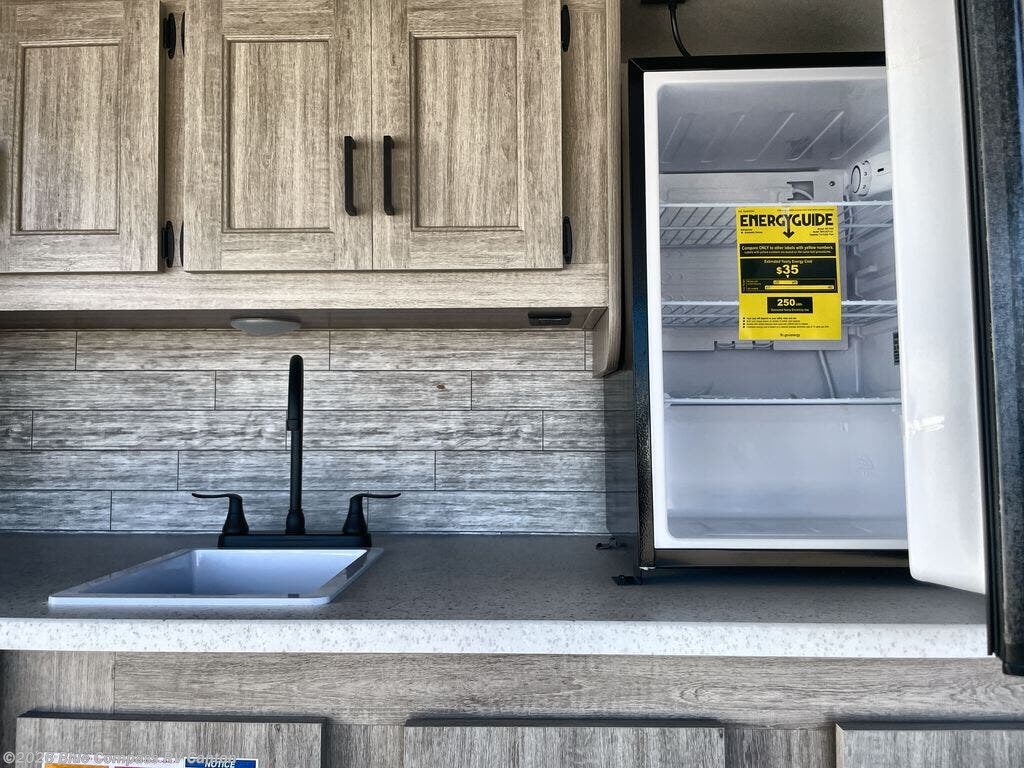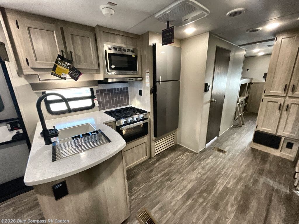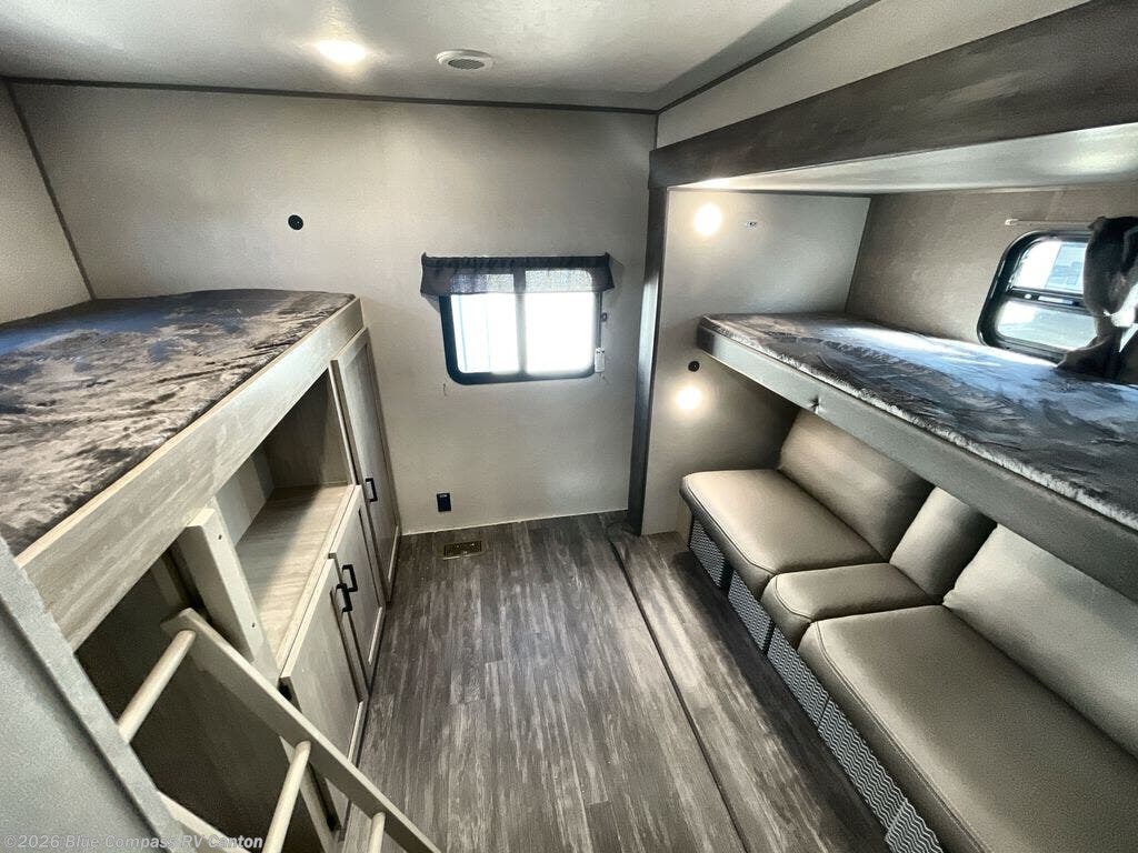 The whole gang will have a good time camping in this travel trailer! There is a place for everyone to sleep between the rear private bunkhouse with a 40" x 74" loft bed and a flip up bunk bed above a jackknife sofa, and the front private bedroom has a 60" x 74" queen bed slide, plus the booth dinette and 60" sofa in the main living area can provide extra sleeping spaces. You could even choose to switch out the bunk and sofa for an optional queen bed instead. The bedroom also has a dresser and a front closet that is big enough for your clothes and an area with washer and dryer prep. The chef can choose to either cook indoors with the three burner cooktop or breathe in some fresh air while cooking at the outside camp kitchen with a refrigerator, a sink, overhead cabinets, and a grill with drawers next to it for your cooking utensils!