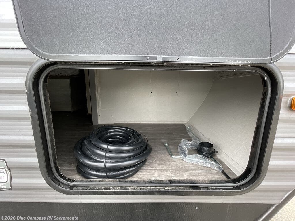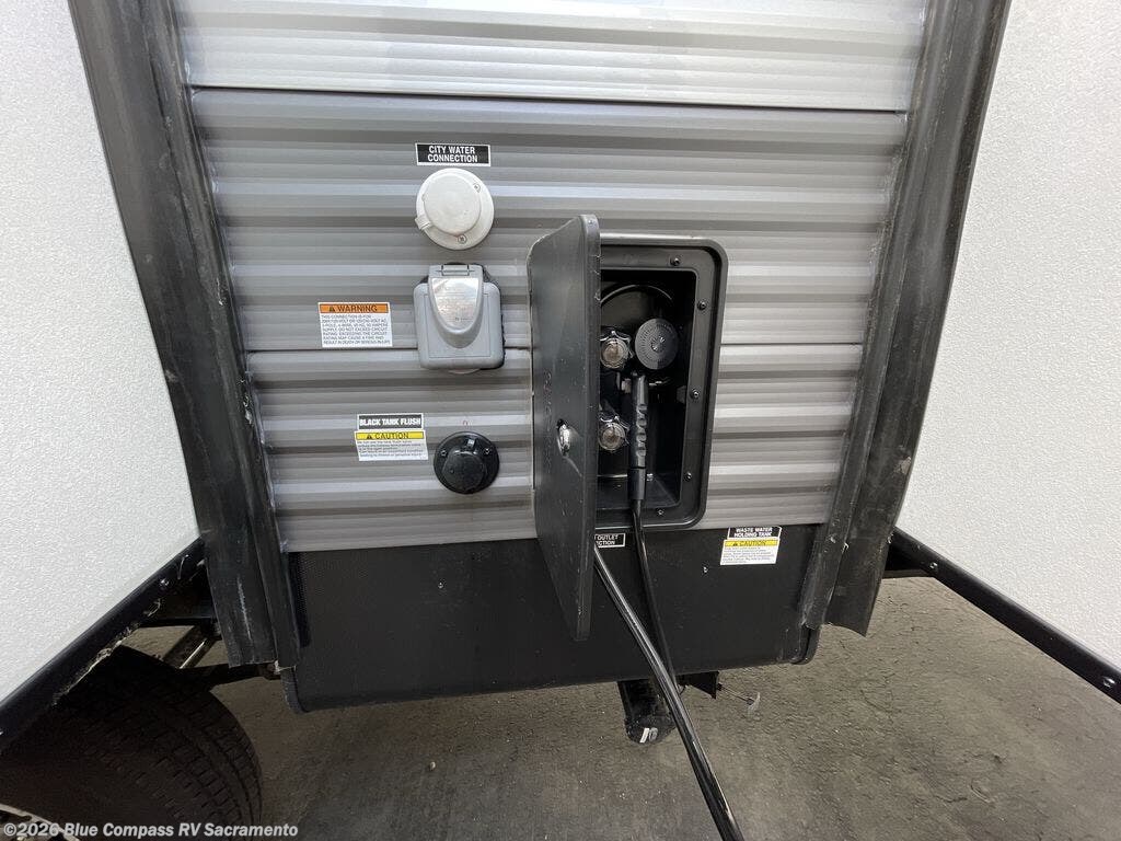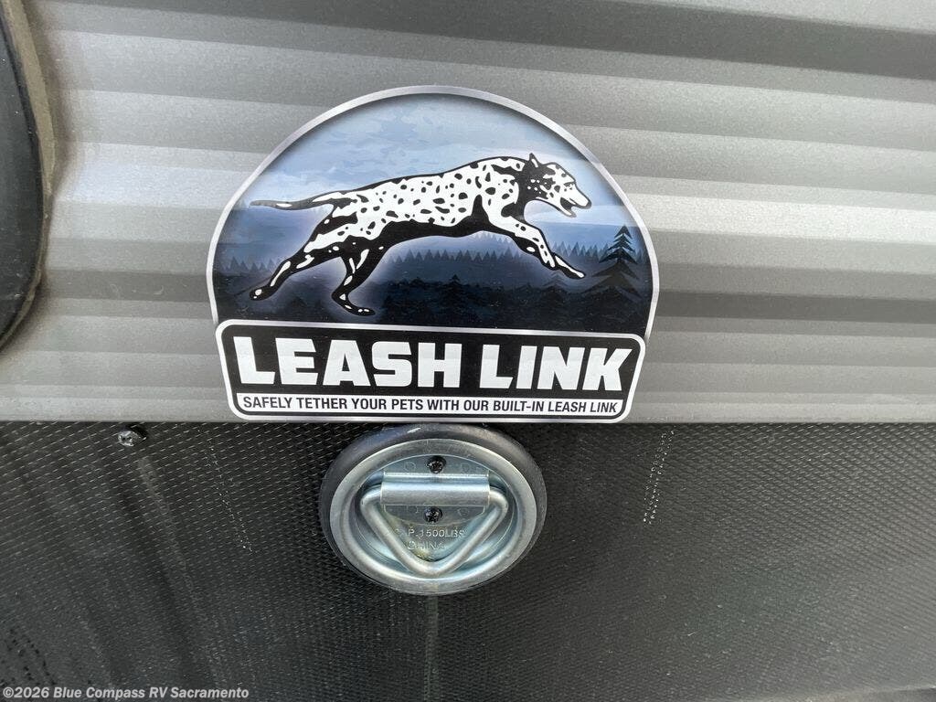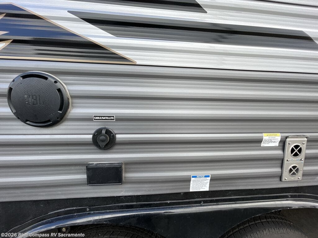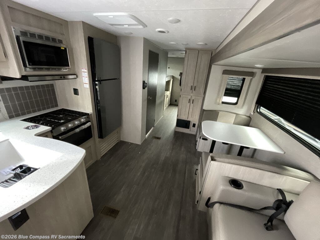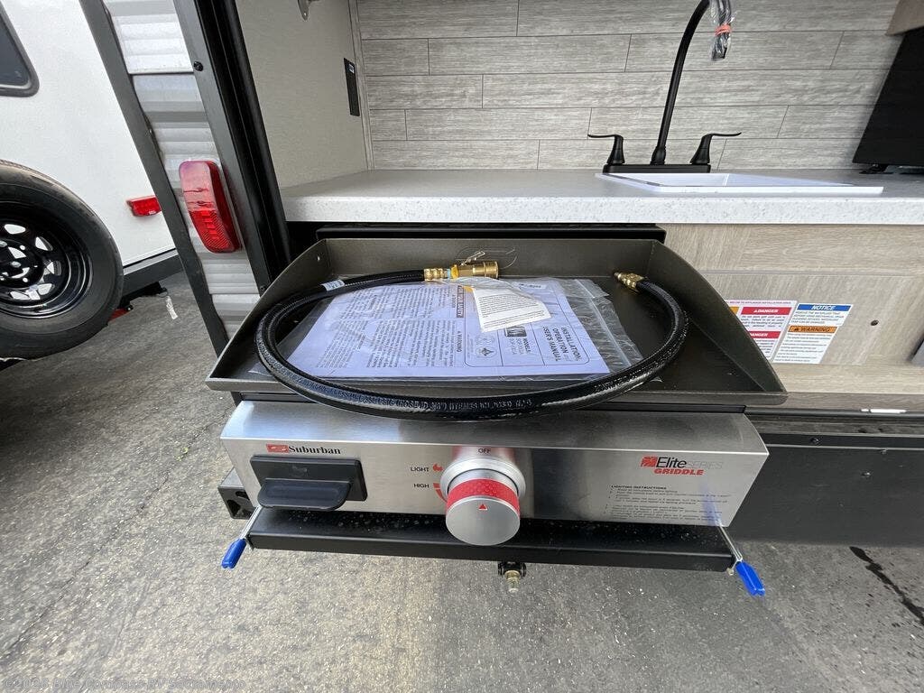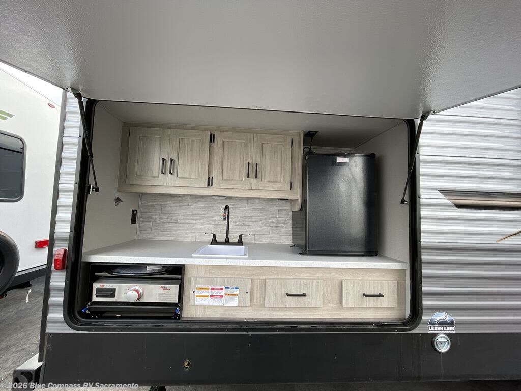 The whole gang will have a good time camping in this travel trailer! There is a place for everyone to sleep between the rear private bunkhouse with a 40" x 74" loft bed and a flip up bunk bed above a jackknife sofa, and the front private bedroom has a 60" x 74" queen bed slide, plus the booth dinette and 60" sofa in the main living area can provide extra sleeping spaces. You could even choose to switch out the bunk and sofa for an optional queen bed instead. The bedroom also has a dresser and a front closet that is big enough for your clothes and an area with washer and dryer prep. The chef can choose to either cook indoors with the three burner cooktop or breathe in some fresh air while cooking at the outside camp kitchen with a refrigerator, a sink, overhead cabinets, and a grill with drawers next to it for your cooking utensils!
