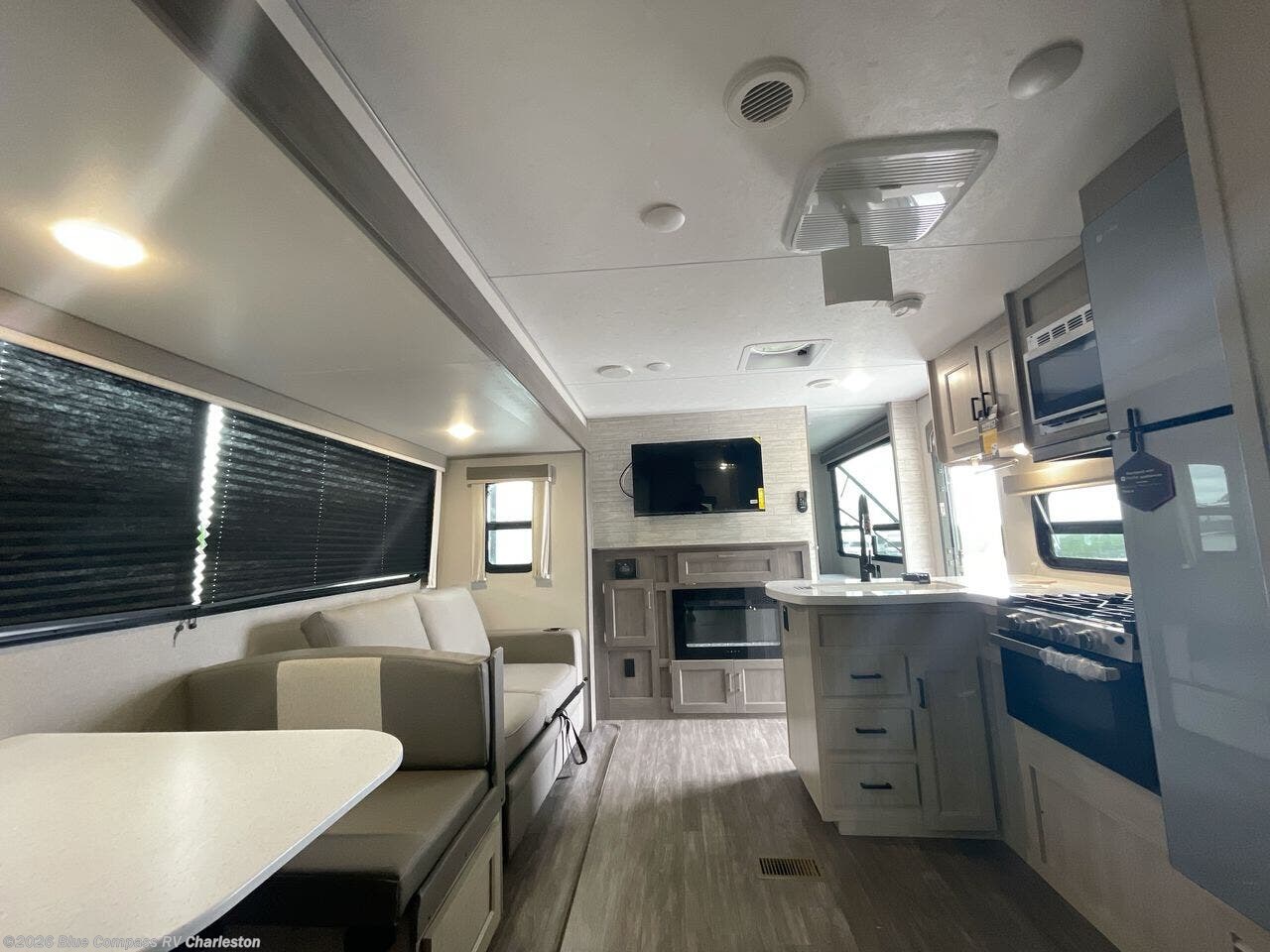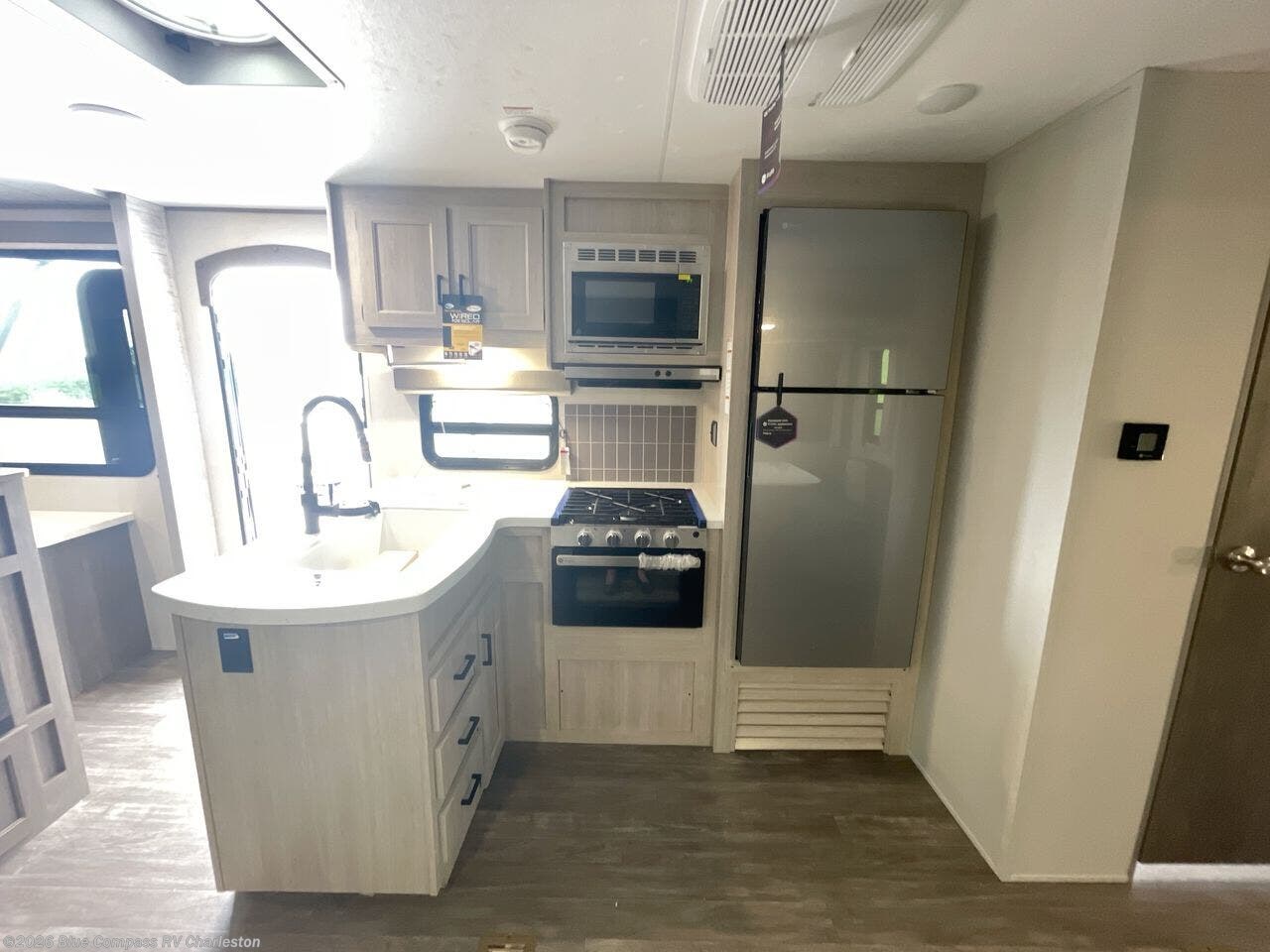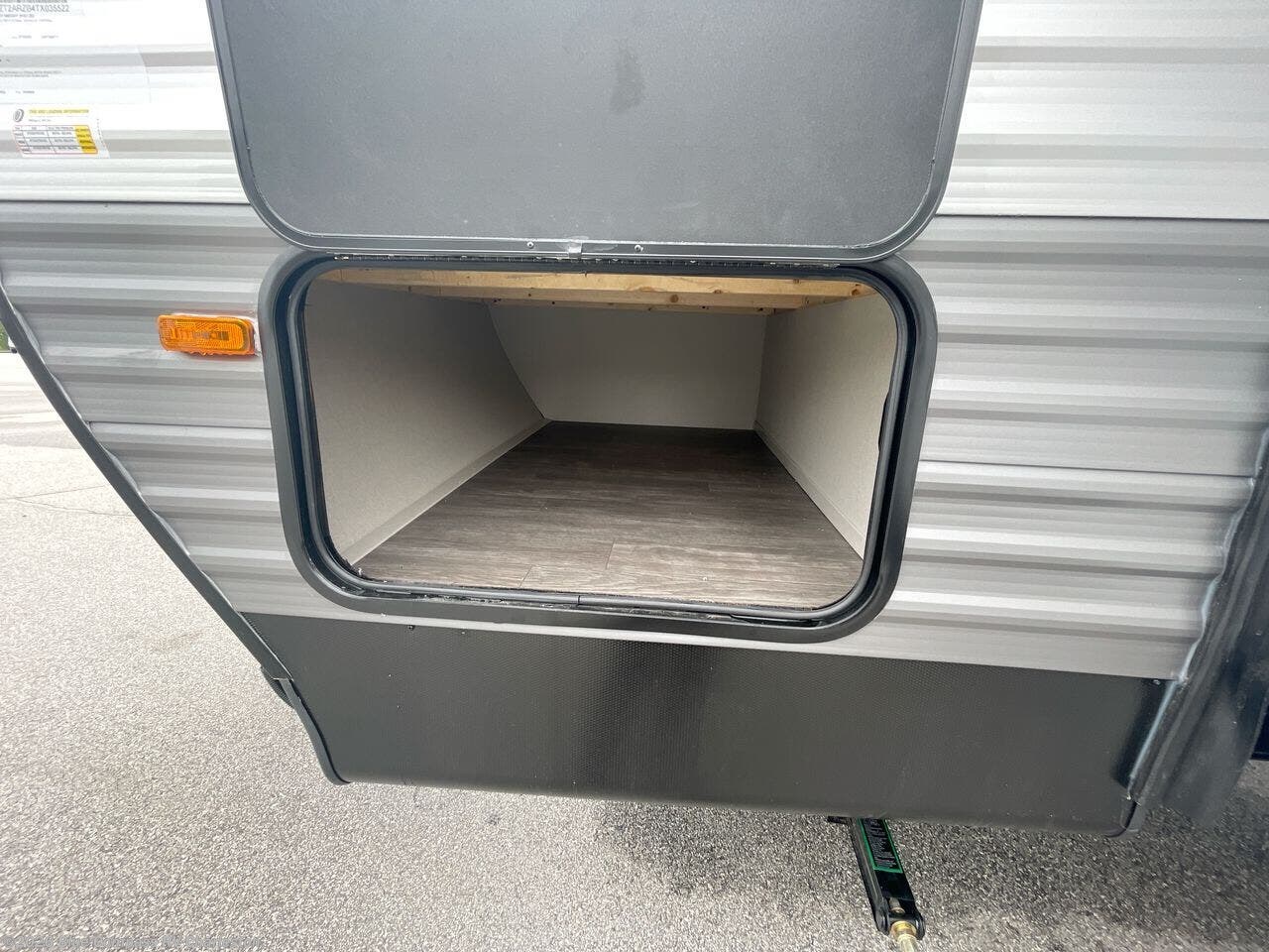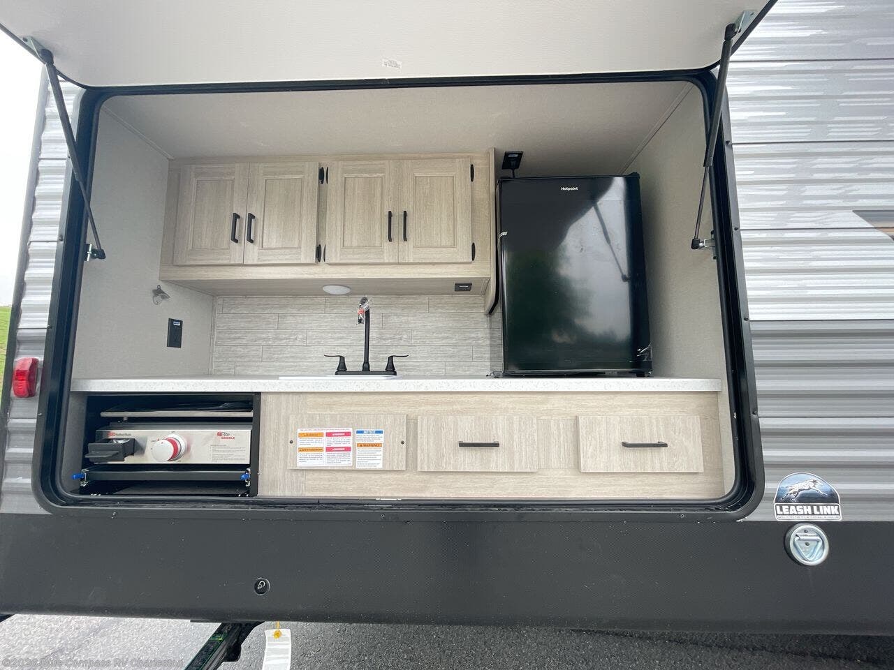 The whole gang will have a good time camping in this travel trailer! There is a place for everyone to sleep between the rear private bunkhouse with a 40" x 74" loft bed and a flip up bunk bed above a jackknife sofa, and the front private bedroom has a 60" x 74" queen bed slide, plus the booth dinette and 60" sofa in the main living area can provide extra sleeping spaces. You could even choose to switch out the bunk and sofa for an optional queen bed instead. The bedroom also has a dresser and a front closet that is big enough for your clothes and an area with washer and dryer prep. The chef can choose to either cook indoors with the three burner cooktop or breathe in some fresh air while cooking at the outside camp kitchen with a refrigerator, a sink, overhead cabinets, and a grill with drawers next to it for your cooking utensils!