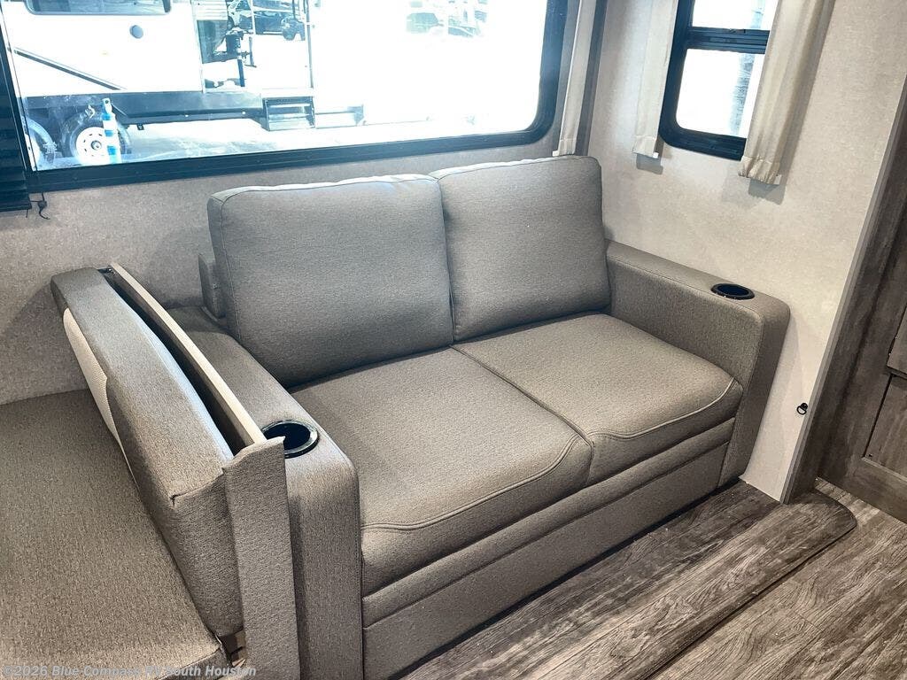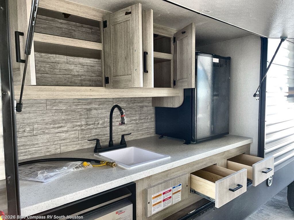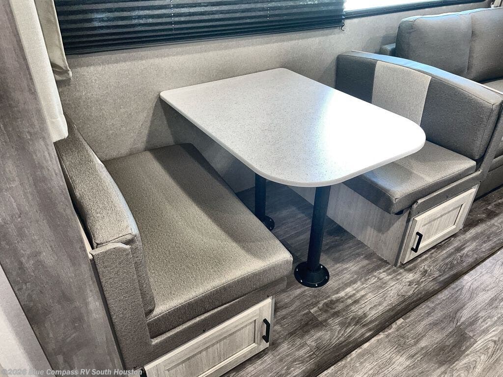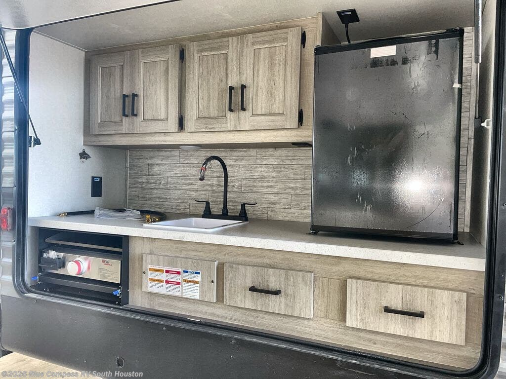 The whole gang will have a good time camping in this travel trailer! There is a place for everyone to sleep between the rear private bunkhouse with a 40" x 74" loft bed and a flip up bunk bed above a jackknife sofa, and the front private bedroom has a 60" x 74" queen bed slide, plus the booth dinette and 60" sofa in the main living area can provide extra sleeping spaces. You could even choose to switch out the bunk and sofa for an optional queen bed instead. The bedroom also has a dresser and a front closet that is big enough for your clothes and an area with washer and dryer prep. The chef can choose to either cook indoors with the three burner cooktop or breathe in some fresh air while cooking at the outside camp kitchen with a refrigerator, a sink, overhead cabinets, and a grill with drawers next to it for your cooking utensils!
