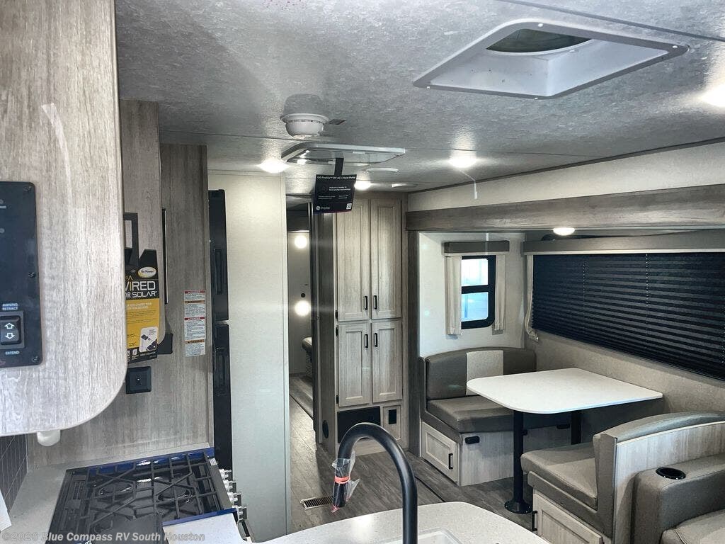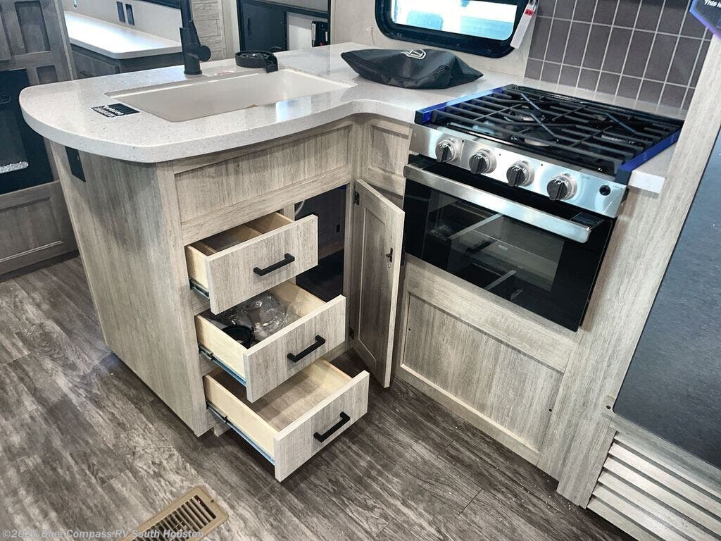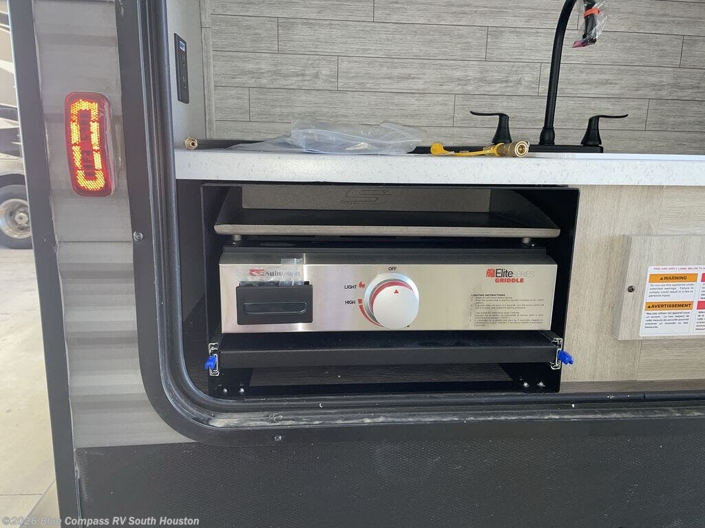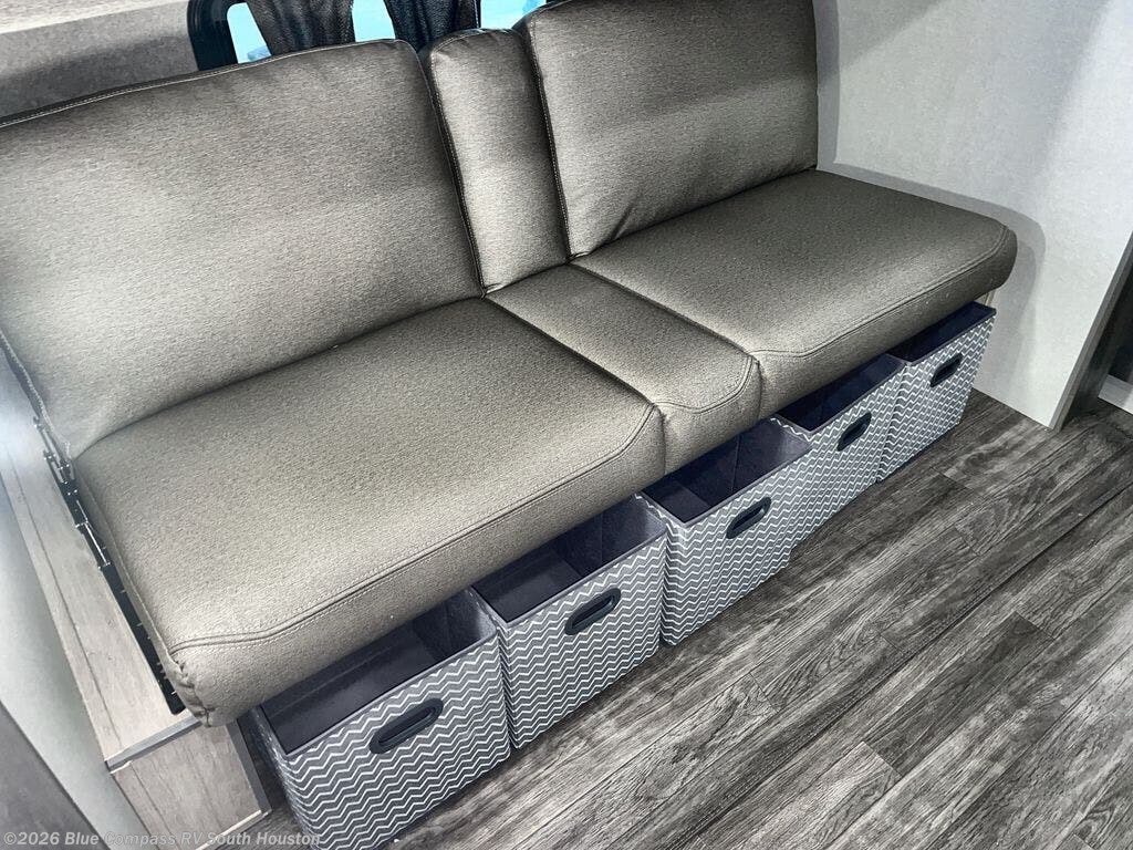 The whole gang will have a good time camping in this travel trailer! There is a place for everyone to sleep between the rear private bunkhouse with a 40" x 74" loft bed and a flip up bunk bed above a jackknife sofa, and the front private bedroom has a 60" x 74" queen bed slide, plus the booth dinette and 60" sofa in the main living area can provide extra sleeping spaces. You could even choose to switch out the bunk and sofa for an optional queen bed instead. The bedroom also has a dresser and a front closet that is big enough for your clothes and an area with washer and dryer prep. The chef can choose to either cook indoors with the three burner cooktop or breathe in some fresh air while cooking at the outside camp kitchen with a refrigerator, a sink, overhead cabinets, and a grill with drawers next to it for your cooking utensils!