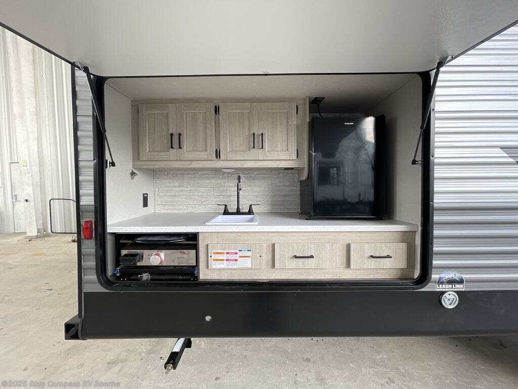 The whole gang will have a good time camping in this travel trailer! There is a place for everyone to sleep between the rear private bunkhouse with a 40" x 74" loft bed and a flip up bunk bed above a jackknife sofa, and the front private bedroom has a 60" x 74" queen bed slide, plus the booth dinette and 60" sofa in the main living area can provide extra sleeping spaces. You could even choose to switch out the bunk and sofa for an optional queen bed instead. The bedroom also has a dresser and a front closet that is big enough for your clothes and an area with washer and dryer prep. The chef can choose to either cook indoors with the three burner cooktop or breathe in some fresh air while cooking at the outside camp kitchen with a refrigerator, a sink, overhead cabinets, and a grill with drawers next to it for your cooking utensils!
