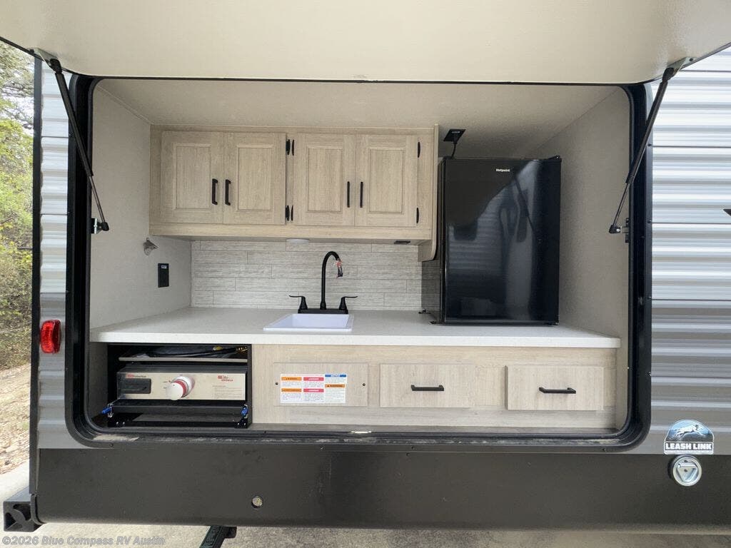 The whole gang will have a good time camping in this travel trailer! There is a place for everyone to sleep between the rear private bunkhouse with a 40" x 74" loft bed and a flip up bunk bed above a jackknife sofa, and the front private bedroom has a 60" x 74" queen bed slide, plus the booth dinette and 60" sofa in the main living area can provide extra sleeping spaces. You could even choose to switch out the bunk and sofa for an optional queen bed instead. The bedroom also has a dresser and a front closet that is big enough for your clothes and an area with washer and dryer prep. The chef can choose to either cook indoors with the three burner cooktop or breathe in some fresh air while cooking at the outside camp kitchen with a refrigerator, a sink, overhead cabinets, and a grill with drawers next to it for your cooking utensils!