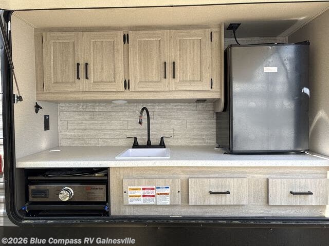 The whole gang will have a good time camping in this travel trailer! There is a place for everyone to sleep between the rear private bunkhouse with a 40" x 74" loft bed and a flip up bunk bed above a jackknife sofa, the 60" x 74" queen bed slide in the bedroom, plus the booth dinette and 60" trundle sofa in the main living area. The bedroom also has a dresser and a front closet that is big enough for your clothes and an area with washer and dryer prep. The chef can choose to either cook indoors with the three-burner cooktop or breathe in some fresh air while cooking at the outside camp kitchen with a refrigerator, a sink, overhead cabinets, and a grill with drawers next to it for your cooking utensils!