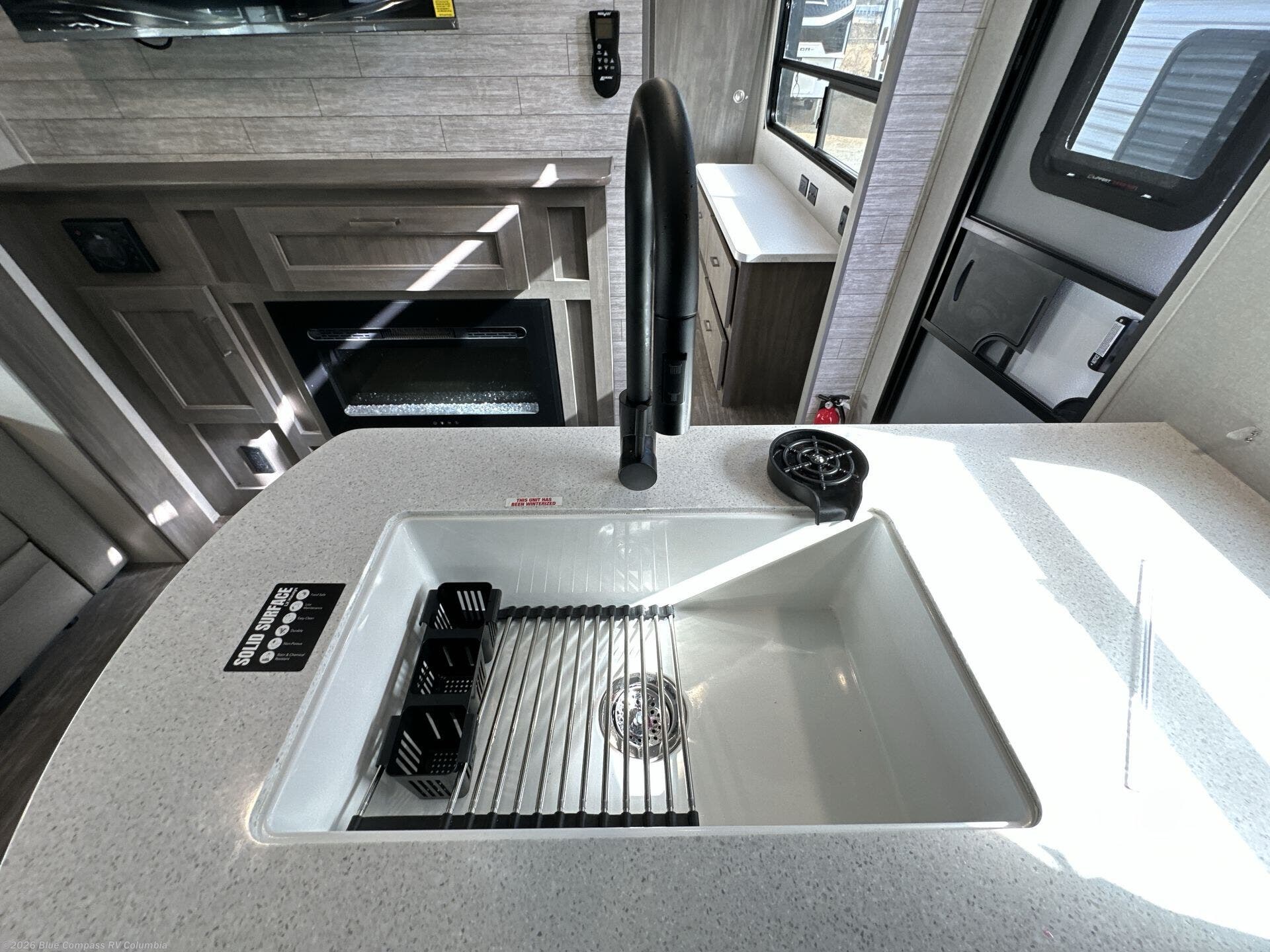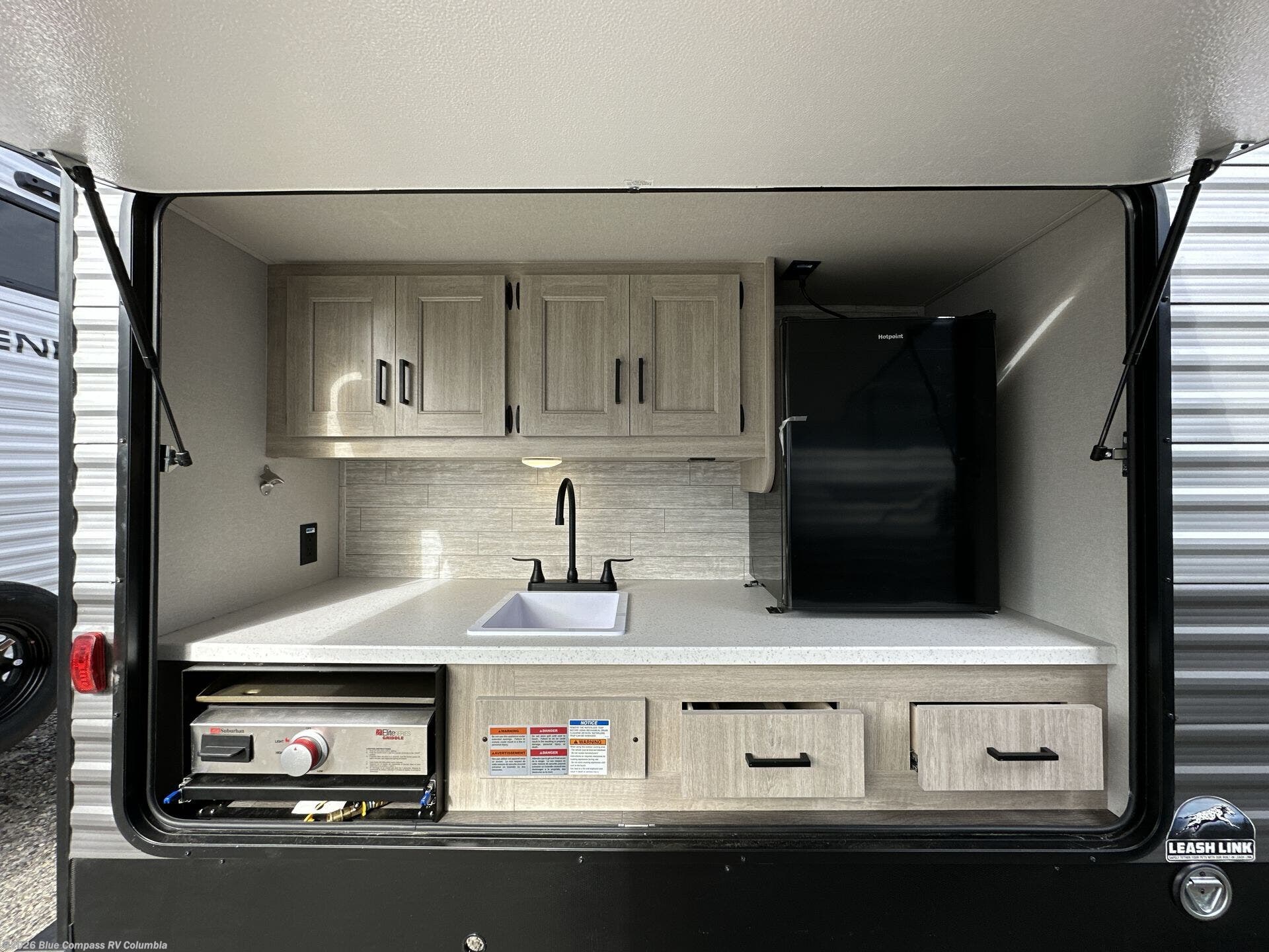 The whole gang will have a good time camping in this travel trailer! There is a place for everyone to sleep between the rear private bunkhouse with a 40" x 74" loft bed and a flip up bunk bed above a jackknife sofa, and the front private bedroom has a 60" x 74" queen bed slide, plus the booth dinette and 60" sofa in the main living area can provide extra sleeping spaces. You could even choose to switch out the bunk and sofa for an optional queen bed instead. The bedroom also has a dresser and a front closet that is big enough for your clothes and an area with washer and dryer prep. The chef can choose to either cook indoors with the three burner cooktop or breathe in some fresh air while cooking at the outside camp kitchen with a refrigerator, a sink, overhead cabinets, and a grill with drawers next to it for your cooking utensils!