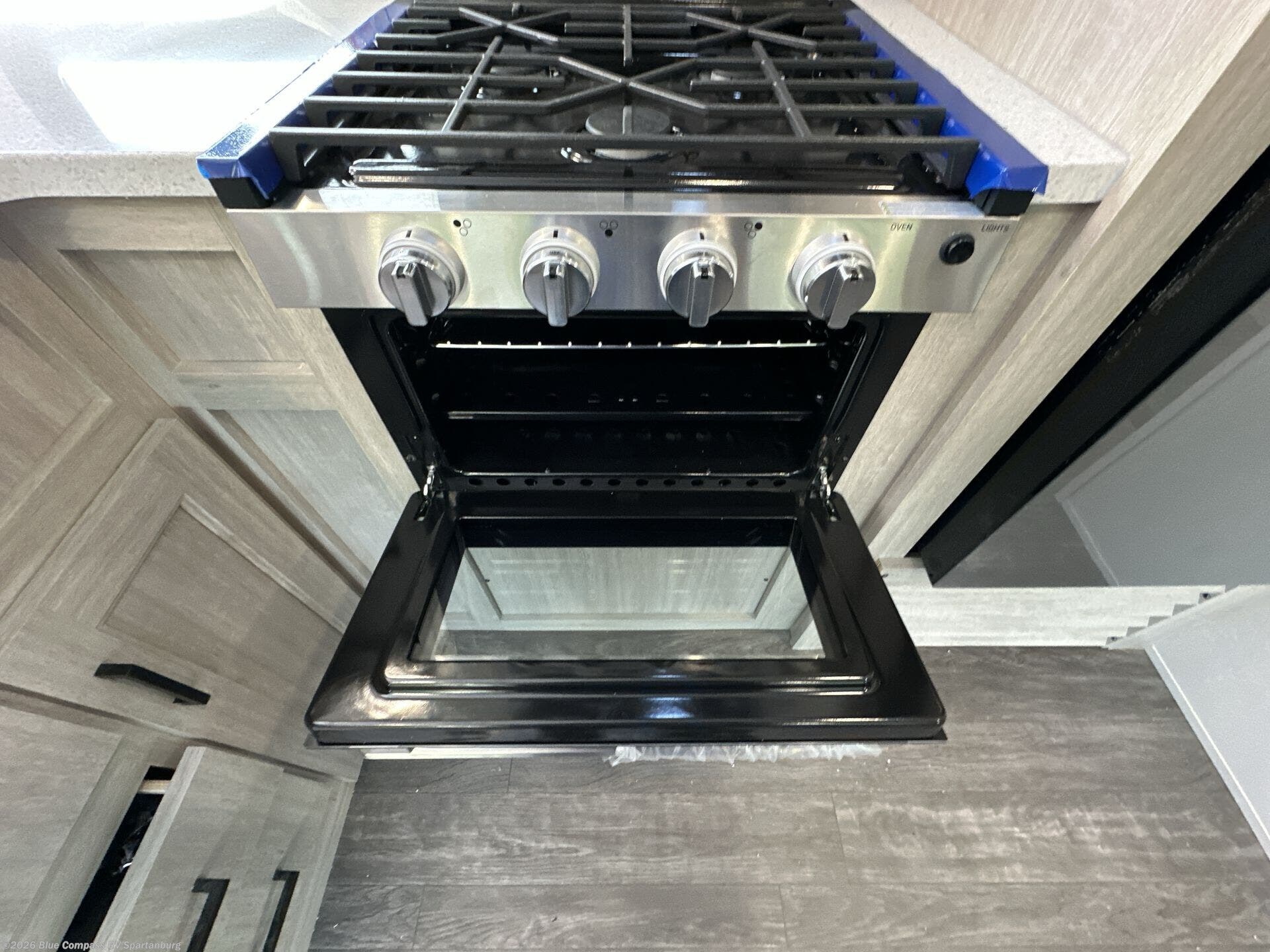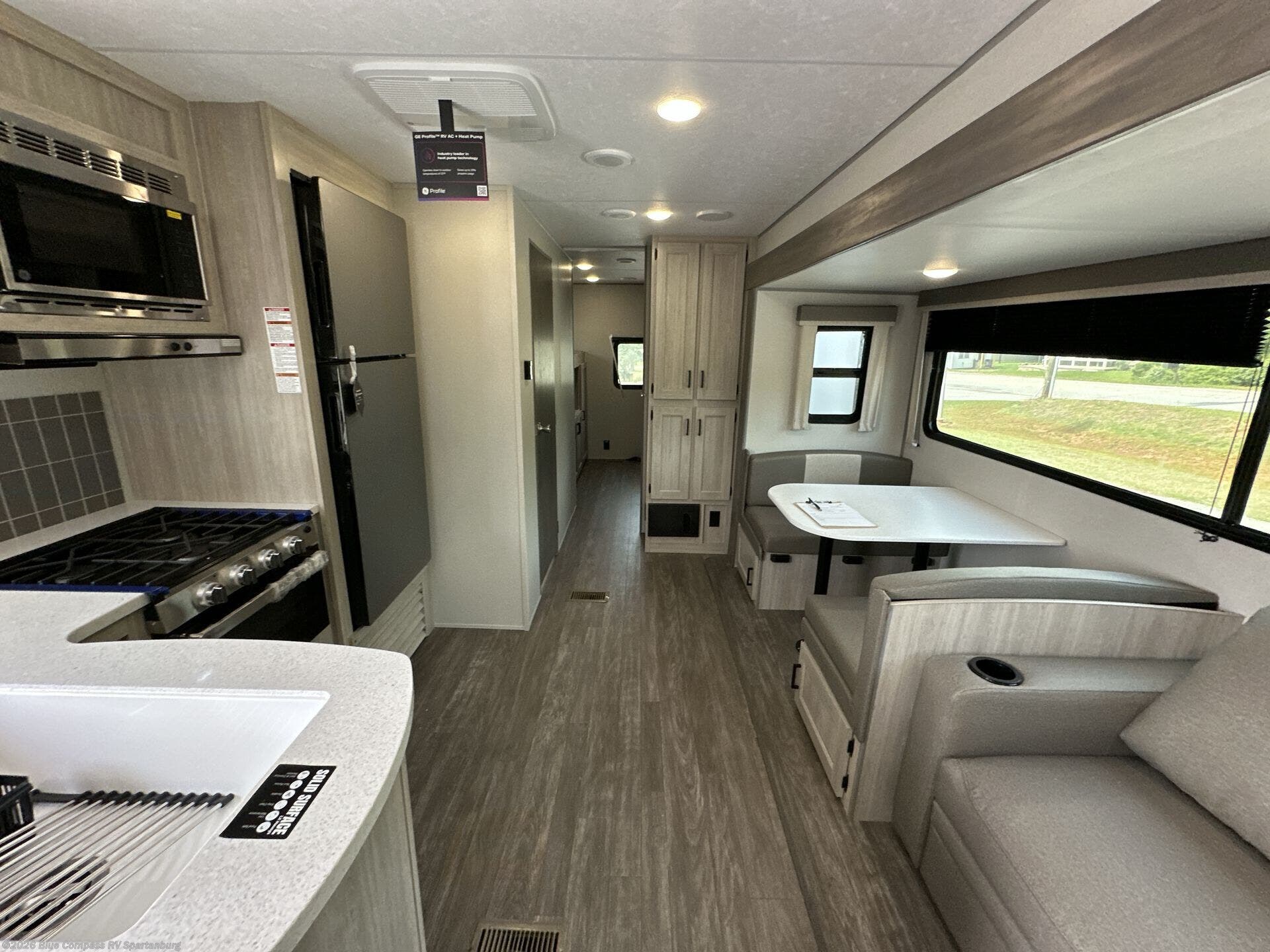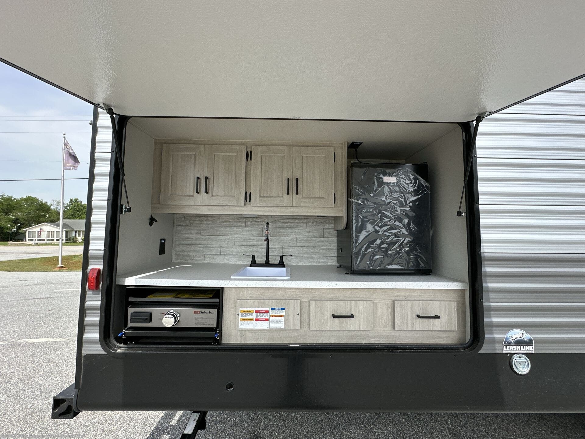 The whole gang will have a good time camping in this travel trailer! There is a place for everyone to sleep between the rear private bunkhouse with a 40" x 74" loft bed and a flip up bunk bed above a jackknife sofa, the 60" x 74" queen bed slide in the bedroom, plus the booth dinette and 60" trundle sofa in the main living area. The bedroom also has a dresser and a front closet that is big enough for your clothes and an area with washer and dryer prep. The chef can choose to either cook indoors with the three-burner cooktop or breathe in some fresh air while cooking at the outside camp kitchen with a refrigerator, a sink, overhead cabinets, and a grill with drawers next to it for your cooking utensils!