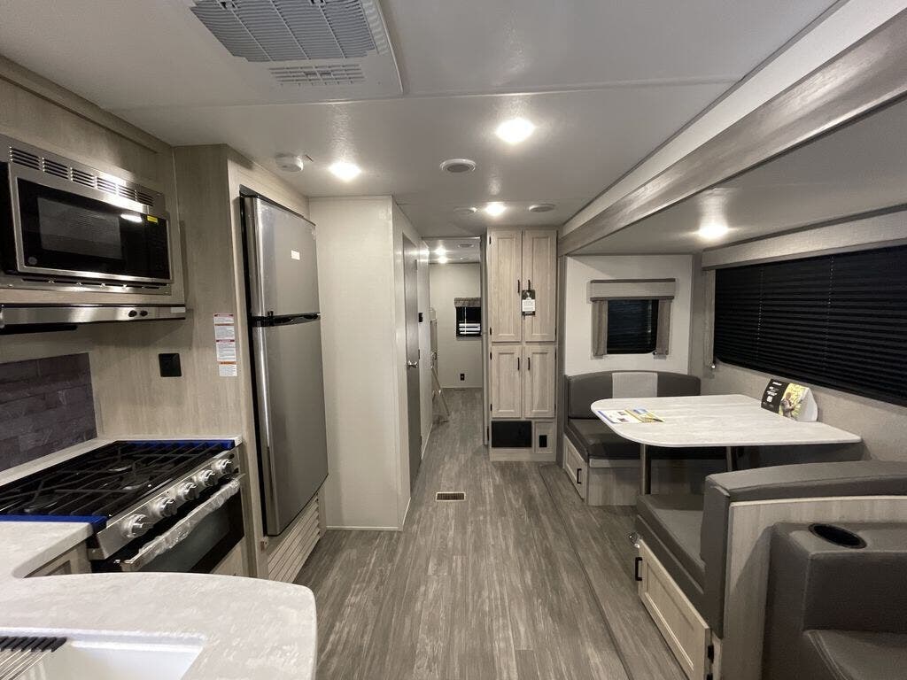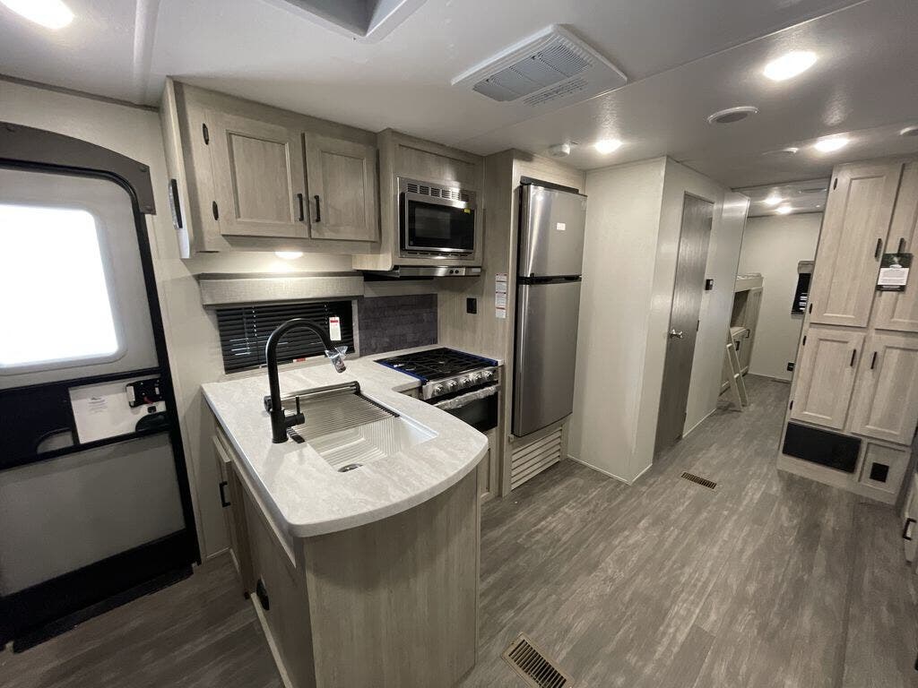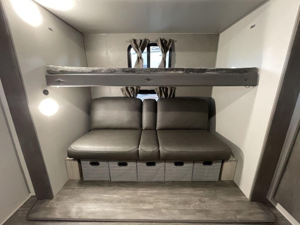 The whole gang will have a good time camping in this travel trailer! There is a place for everyone to sleep between the rear private bunkhouse with a 40" x 74" loft bed and a flip up bunk bed above a jackknife sofa, the 60" x 74" queen bed slide in the bedroom, plus the booth dinette and 60" trundle sofa in the main living area. The bedroom also has a dresser and a front closet that is big enough for your clothes and an area with washer and dryer prep. The chef can choose to either cook indoors with the three-burner cooktop or breathe in some fresh air while cooking at the outside camp kitchen with a refrigerator, a sink, overhead cabinets, and a grill with drawers next to it for your cooking utensils!