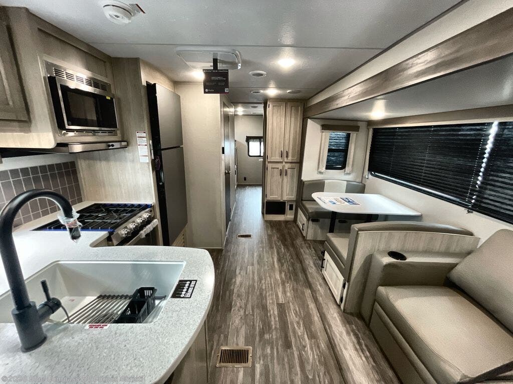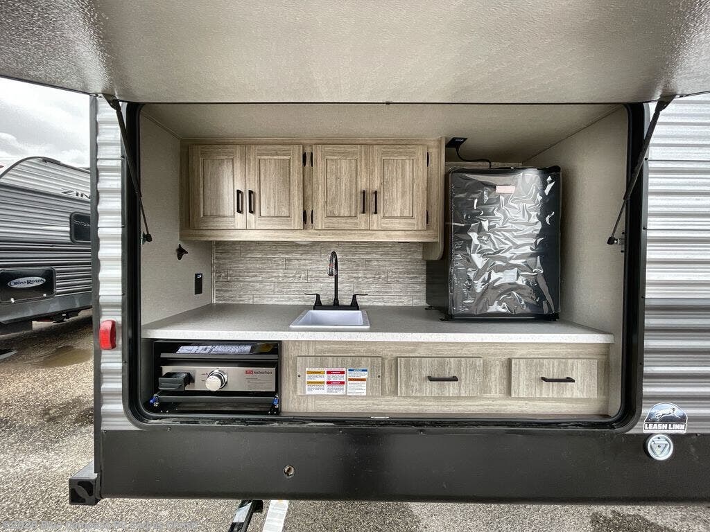 The whole gang will have a good time camping in this travel trailer! There is a place for everyone to sleep between the rear private bunkhouse with a 40" x 74" loft bed and a flip up bunk bed above a jackknife sofa, the 60" x 74" queen bed slide in the bedroom, plus the booth dinette and 60" trundle sofa in the main living area. The bedroom also has a dresser and a front closet that is big enough for your clothes and an area with washer and dryer prep. The chef can choose to either cook indoors with the three-burner cooktop or breathe in some fresh air while cooking at the outside camp kitchen with a refrigerator, a sink, overhead cabinets, and a grill with drawers next to it for your cooking utensils!