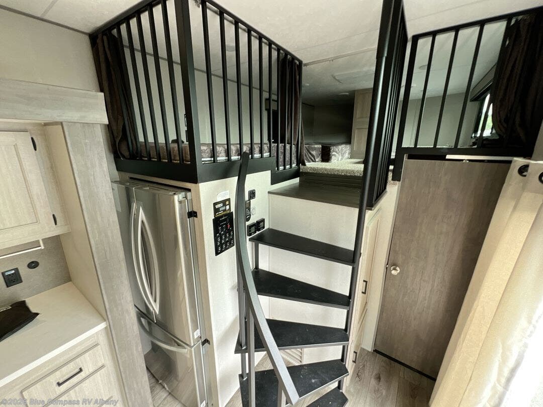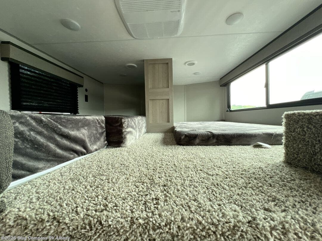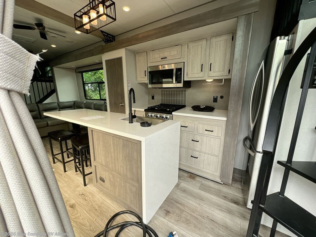 You won't believe the amount of comfort found throughout this destination trailer! The front private bedroom will provide you with your own space each night, and here you'll enjoy the RV queen bed slide out, wardrobe closets and a dresser, plus a bedroom fireplace for more comfort. The main living area is made spacious thanks to the large slide out, and the kitchen island with five bar stools will be the perfect place to dine together each day. There is also a hide-a-bed sectional sofa everyone is sure to enjoy relaxing on, and the power lift TV means you can make it a movie night! A spacious full rear bath includes a 48" x 30" shower with a seat and glass shower door and plenty of storage space to keep clean towels and bath necessities stocked. The feature you will really love on this trailer has to be the double loft areas, complete with five bunk mats in total and storage space for your guests' things; how convenient!