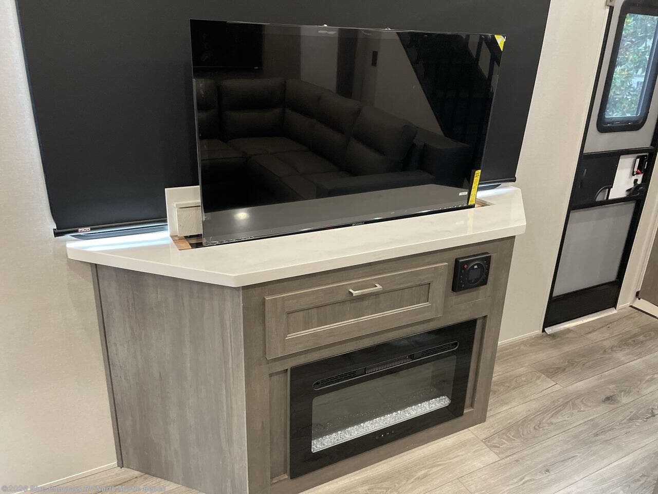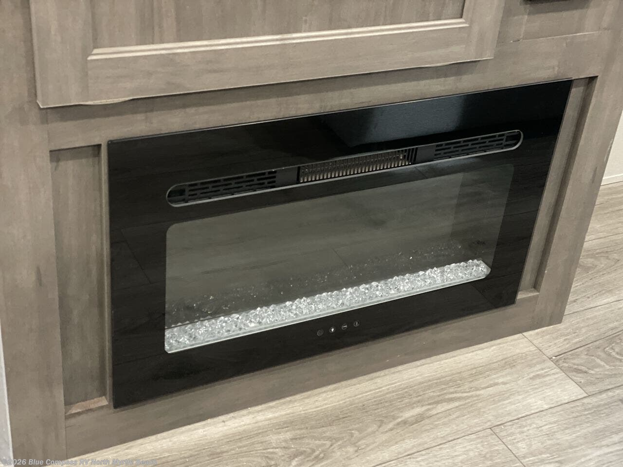 You won't believe the amount of comfort found throughout this destination trailer! The front private bedroom will provide you with your own space each night, and here you'll enjoy the RV queen bed slide out, wardrobe closets and a dresser, plus a bedroom fireplace for more comfort. The main living area is made spacious thanks to the large slide out, and the kitchen island with five bar stools will be the perfect place to dine together each day. There is also a hide-a-bed sectional sofa everyone is sure to enjoy relaxing on, and the power lift TV means you can make it a movie night! A spacious full rear bath includes a 48" x 30" shower with a seat and glass shower door and plenty of storage space to keep clean towels and bath necessities stocked. The feature you will really love on this trailer has to be the double loft areas, complete with five bunk mats in total and storage space for your guests' things; how convenient!
