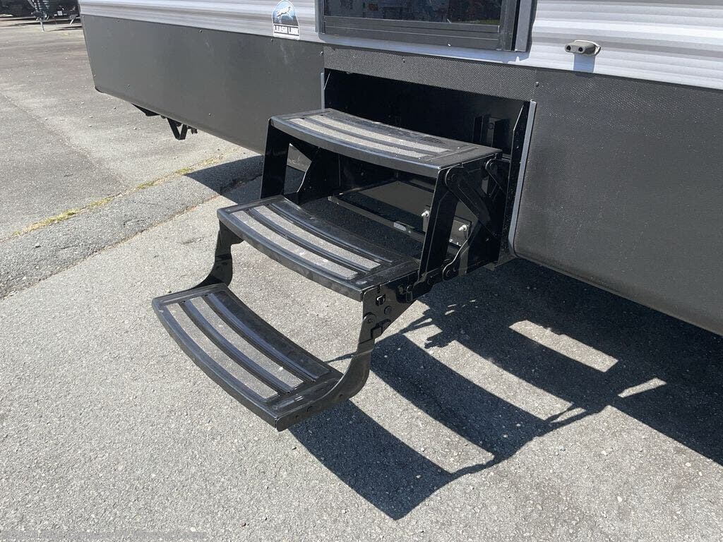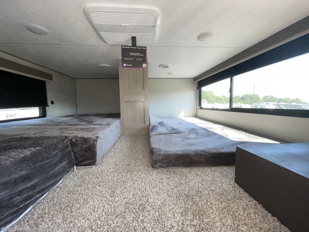 You won't believe the amount of comfort found throughout this destination trailer! The front private bedroom will provide you with your own space each night, and here you'll enjoy the RV queen bed slide out, wardrobe closets and a dresser, plus a bedroom fireplace for more comfort. The main living area is made spacious thanks to the large slide out, and the kitchen island with five bar stools will be the perfect place to dine together each day. There is also a hide-a-bed sectional sofa everyone is sure to enjoy relaxing on, and the power lift TV means you can make it a movie night! A spacious full rear bath includes a 48" x 30" shower with a seat and glass shower door and plenty of storage space to keep clean towels and bath necessities stocked. The feature you will really love on this trailer has to be the double loft areas, complete with five bunk mats in total and storage space for your guests' things; how convenient!