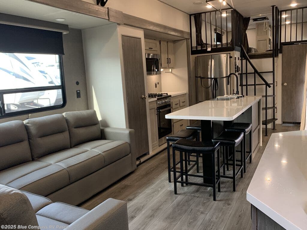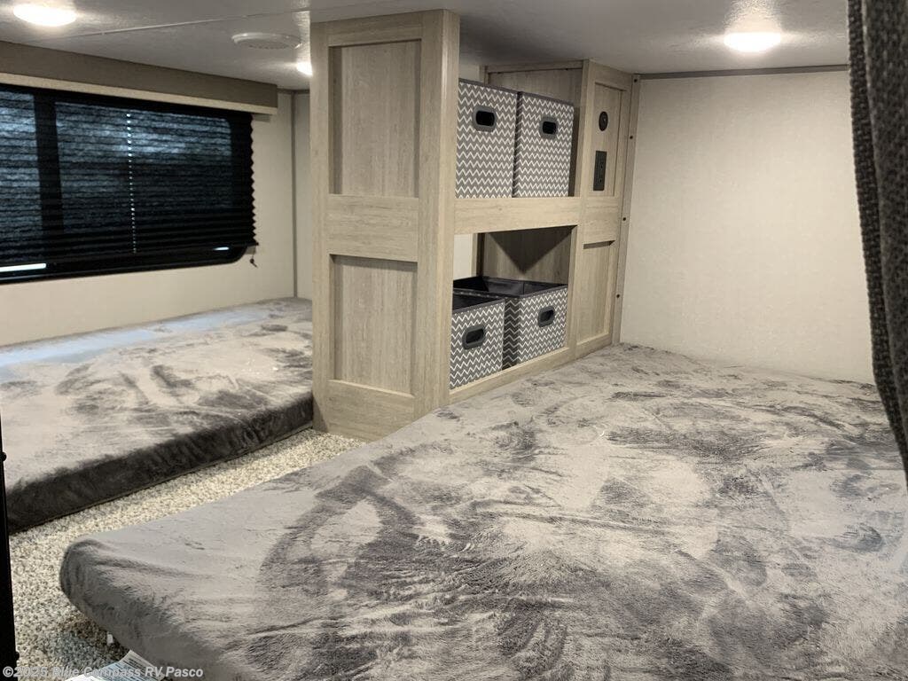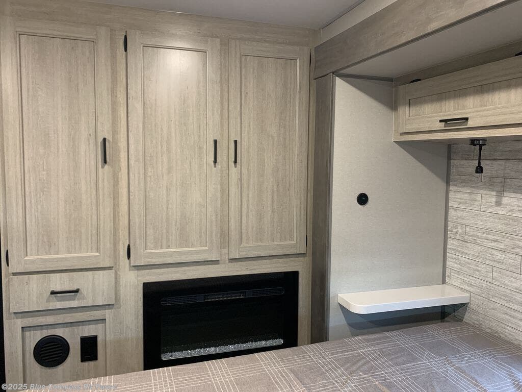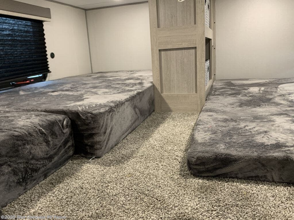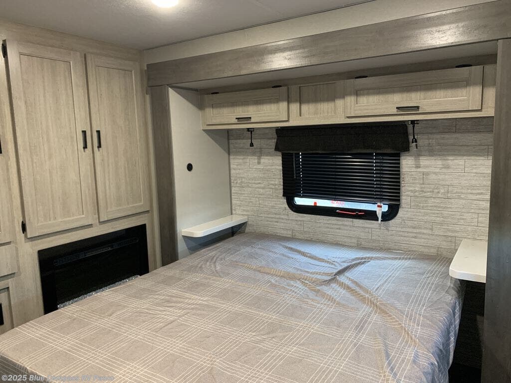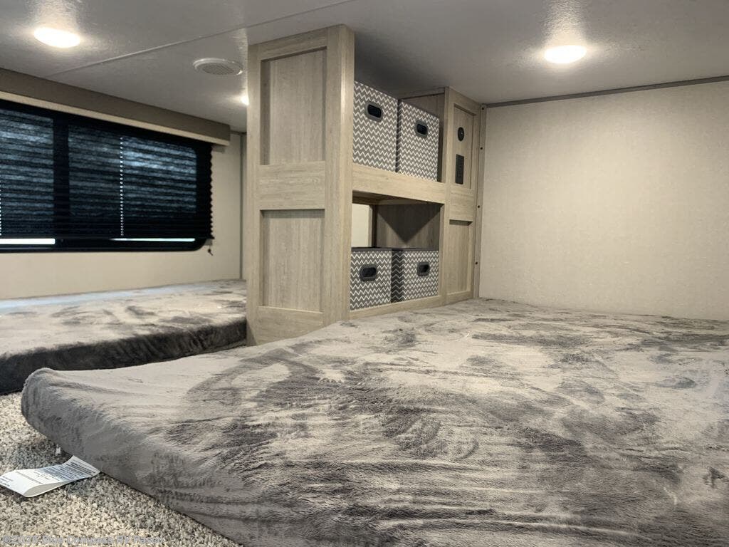 You won't believe the amount of comfort found throughout this destination trailer! The front private bedroom will provide you with your own space each night, and here you'll enjoy the RV queen bed slide out, wardrobe closets and a dresser, plus a bedroom fireplace for more comfort. The main living area is made spacious thanks to the large slide out, and the kitchen island with five bar stools will be the perfect place to dine together each day. There is also a hide-a-bed sectional sofa everyone is sure to enjoy relaxing on, and the power lift TV means you can make it a movie night! A spacious full rear bath includes a 48" x 30" shower with a seat and glass shower door and plenty of storage space to keep clean towels and bath necessities stocked. The feature you will really love on this trailer has to be the double loft areas, complete with five bunk mats in total and storage space for your guests' things; how convenient!