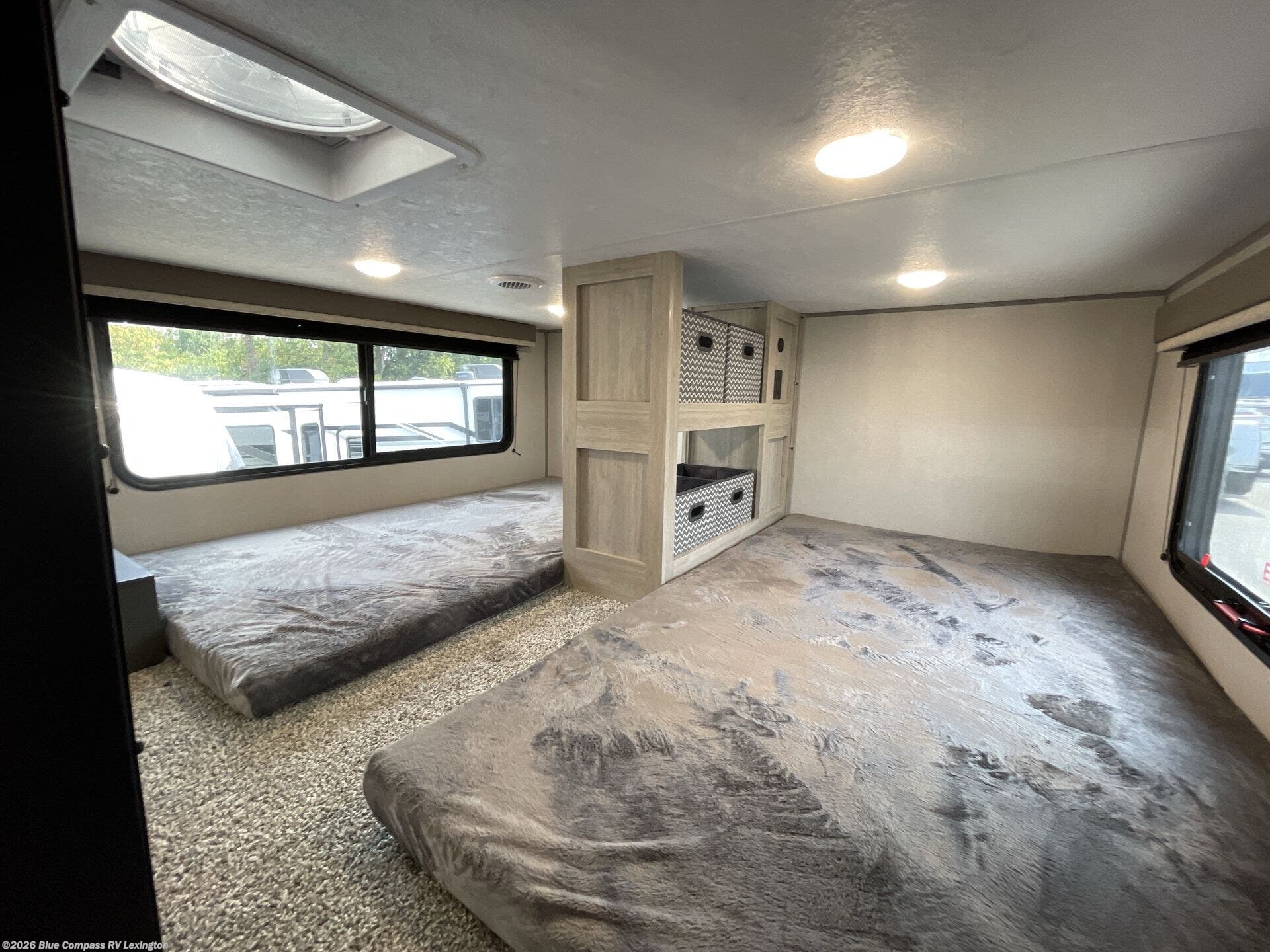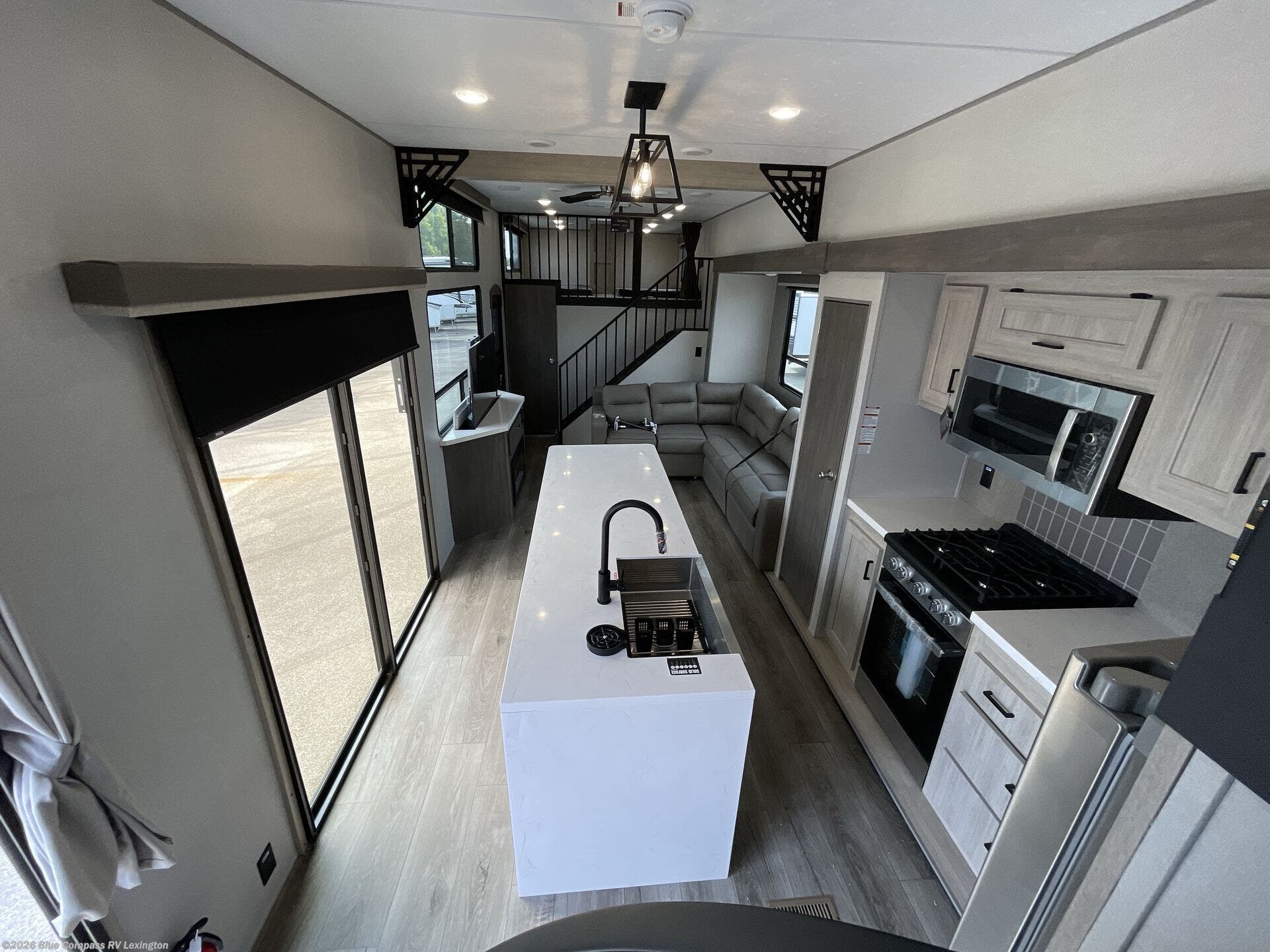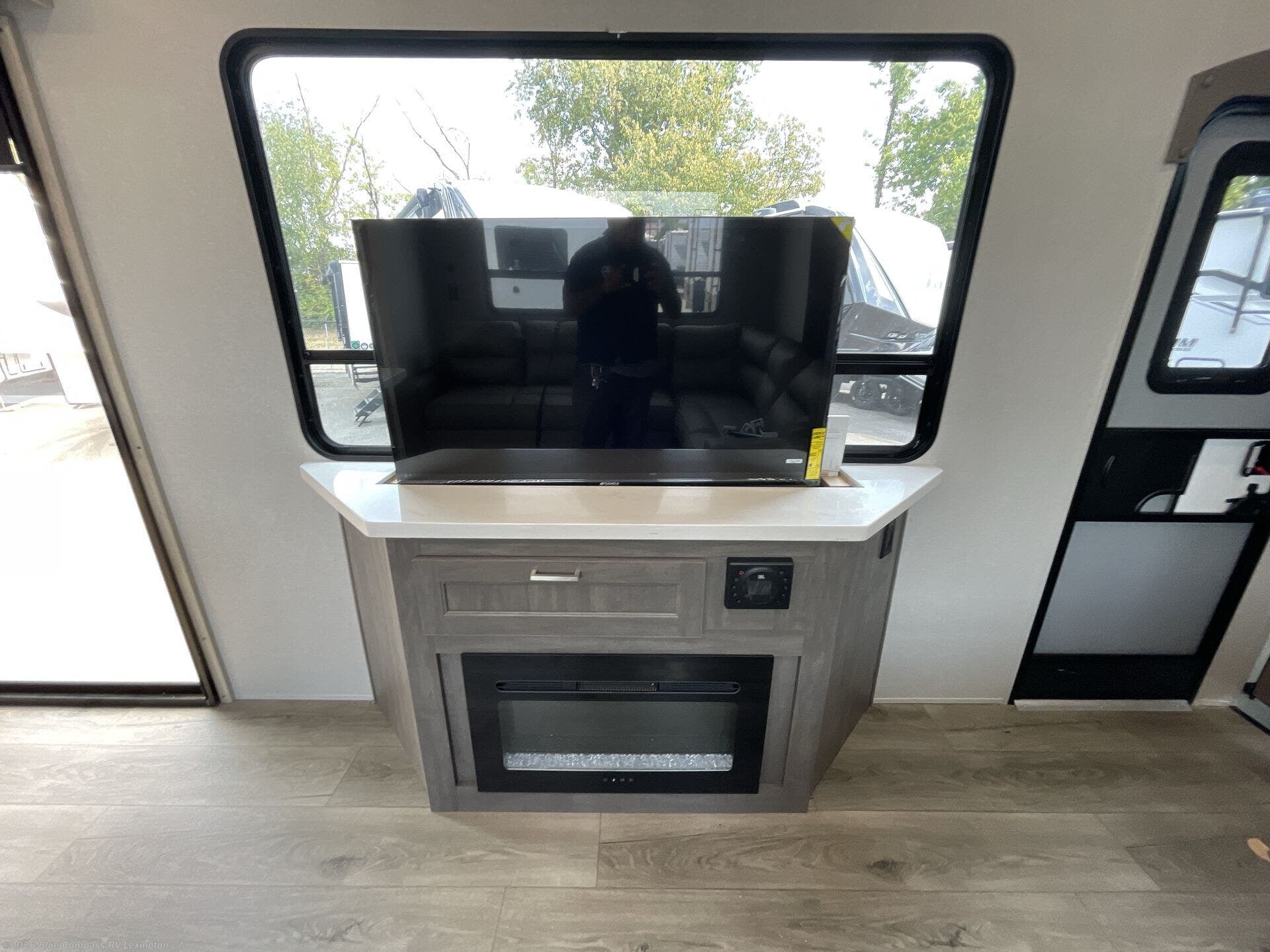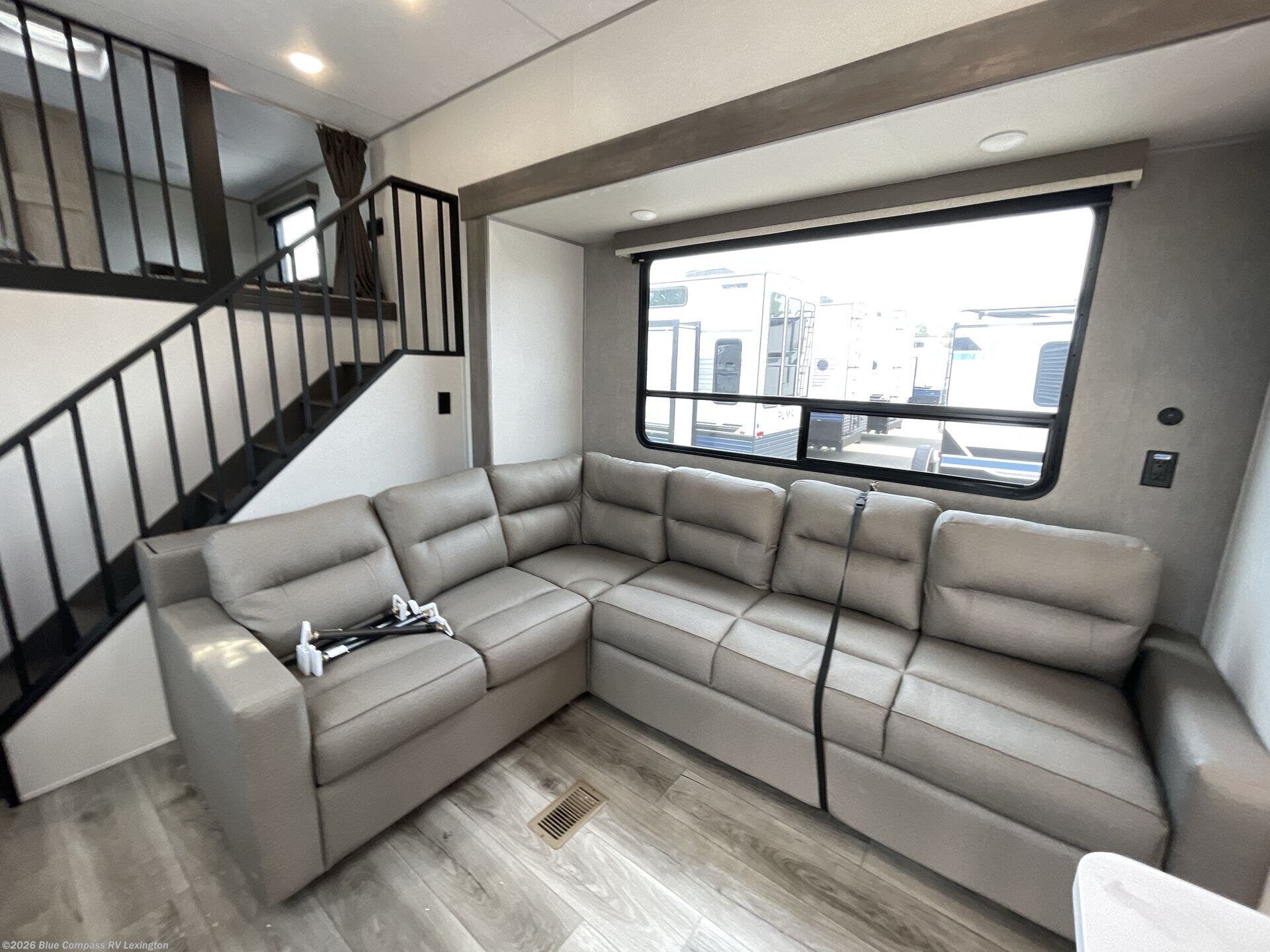 You won't believe the amount of comfort found throughout this destination trailer! The front private bedroom will provide you with your own space each night, and here you'll enjoy the RV queen bed slide out, wardrobe closets and a dresser, plus a bedroom fireplace for more comfort. The main living area is made spacious thanks to the large slide out, and the kitchen island with five bar stools will be the perfect place to dine together each day. There is also a hide-a-bed sectional sofa everyone is sure to enjoy relaxing on, and the power lift TV means you can make it a movie night! A spacious full rear bath includes a 48" x 30" shower with a seat and glass shower door and plenty of storage space to keep clean towels and bath necessities stocked. The feature you will really love on this trailer has to be the double loft areas, complete with five bunk mats in total and storage space for your guests' things; how convenient!