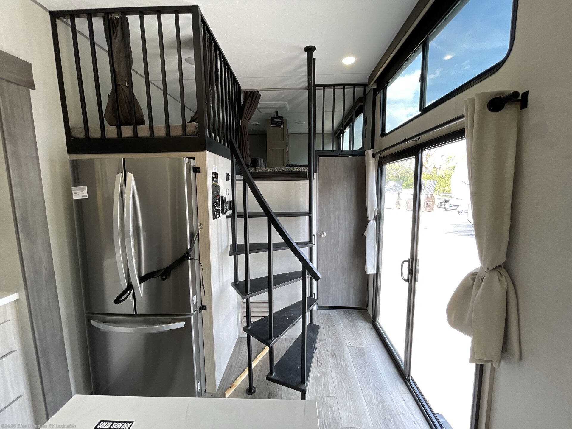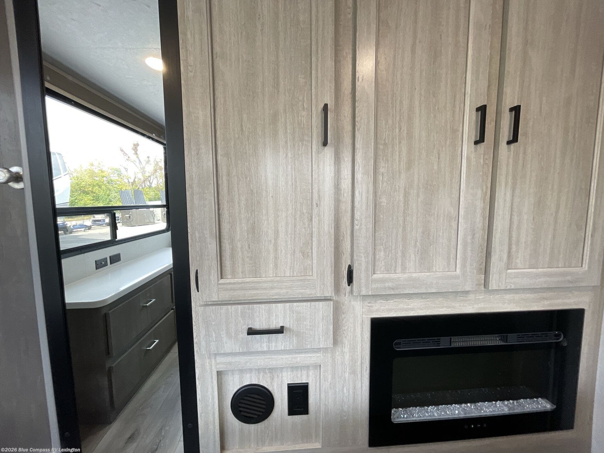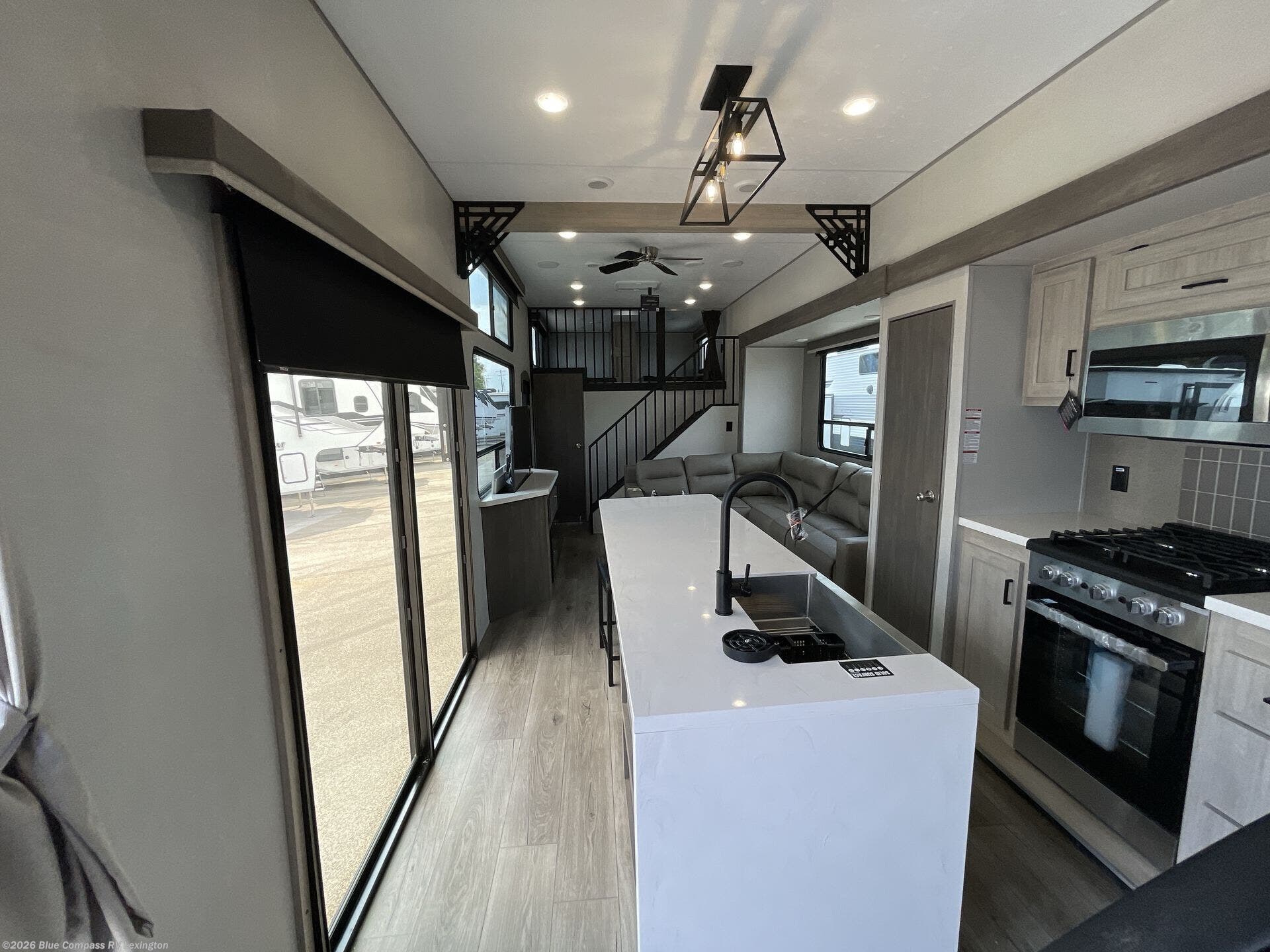 You won't believe the amount of comfort found throughout this destination trailer! The front private bedroom will provide you with your own space each night, and here you'll enjoy the RV queen bed slide out, wardrobe closets and a dresser, plus a bedroom fireplace for more comfort. The main living area is made spacious thanks to the large slide out, and the kitchen island with five bar stools will be the perfect place to dine together each day. There is also a hide-a-bed sectional sofa everyone is sure to enjoy relaxing on, and the power lift TV means you can make it a movie night! A spacious full rear bath includes a 48" x 30" shower with a seat and glass shower door and plenty of storage space to keep clean towels and bath necessities stocked. The feature you will really love on this trailer has to be the double loft areas, complete with five bunk mats in total and storage space for your guests' things; how convenient!