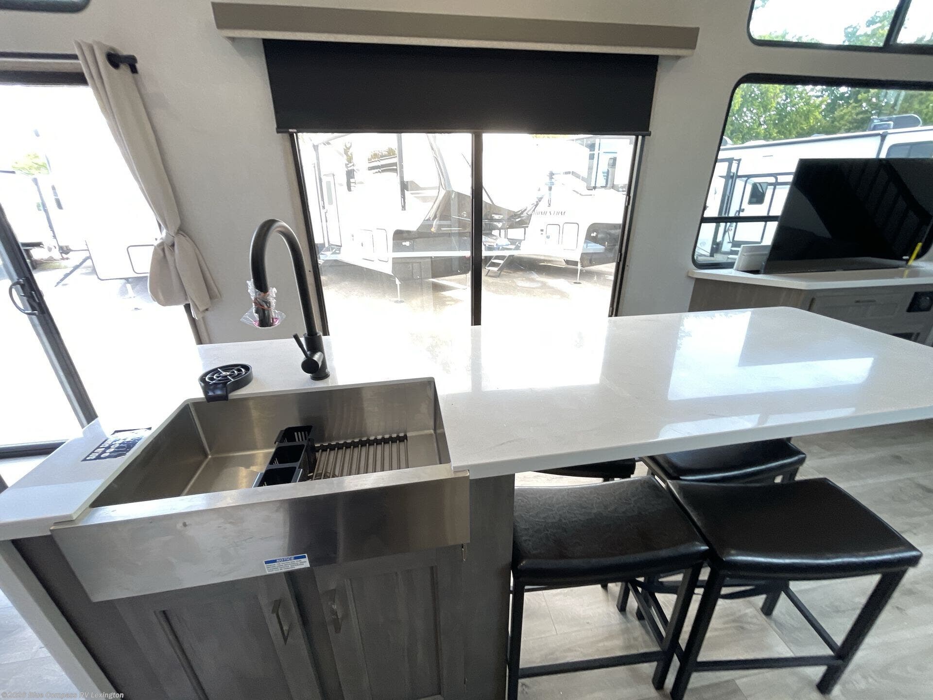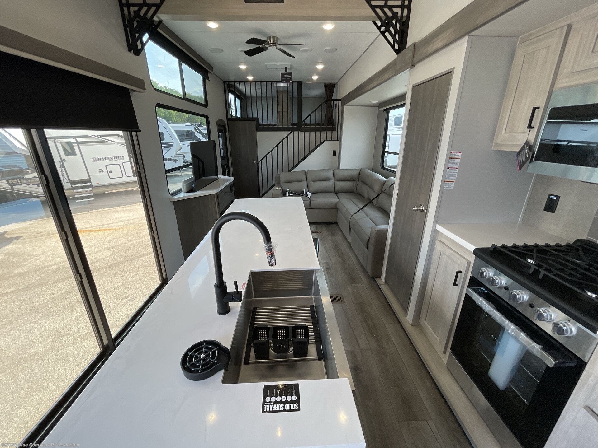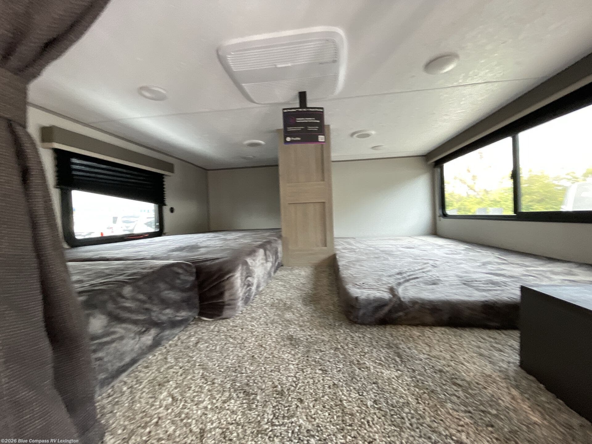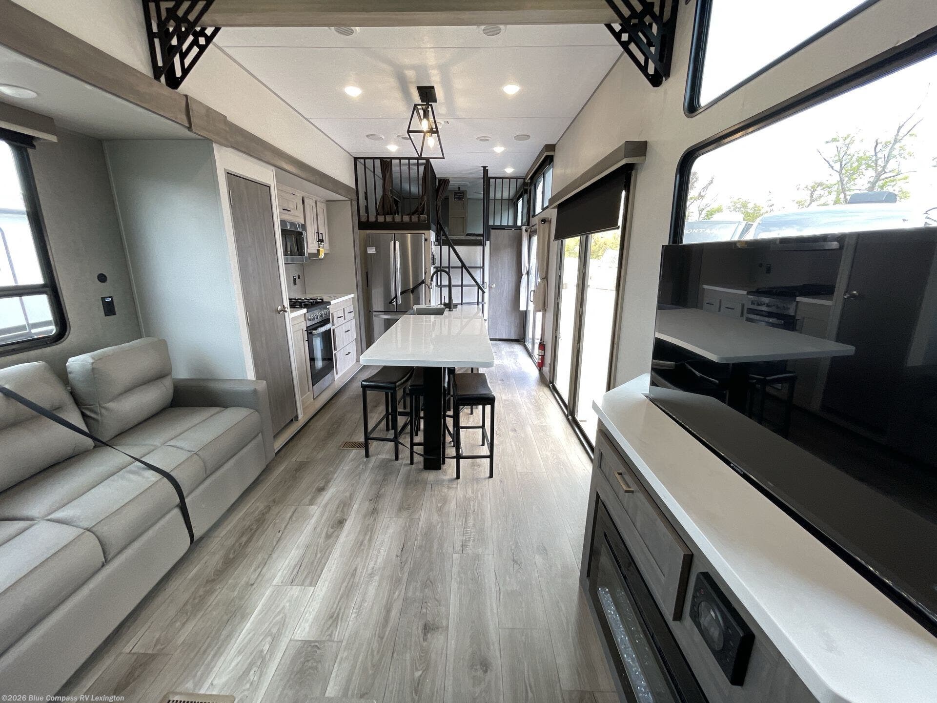 You won't believe the amount of comfort found throughout this destination trailer! The front private bedroom will provide you with your own space each night, and here you'll enjoy the RV queen bed slide out, wardrobe closets and a dresser, plus a bedroom fireplace for more comfort. The main living area is made spacious thanks to the large slide out, and the kitchen island with five bar stools will be the perfect place to dine together each day. There is also a hide-a-bed sectional sofa everyone is sure to enjoy relaxing on, and the power lift TV means you can make it a movie night! A spacious full rear bath includes a 48" x 30" shower with a seat and glass shower door and plenty of storage space to keep clean towels and bath necessities stocked. The feature you will really love on this trailer has to be the double loft areas, complete with five bunk mats in total and storage space for your guests' things; how convenient!