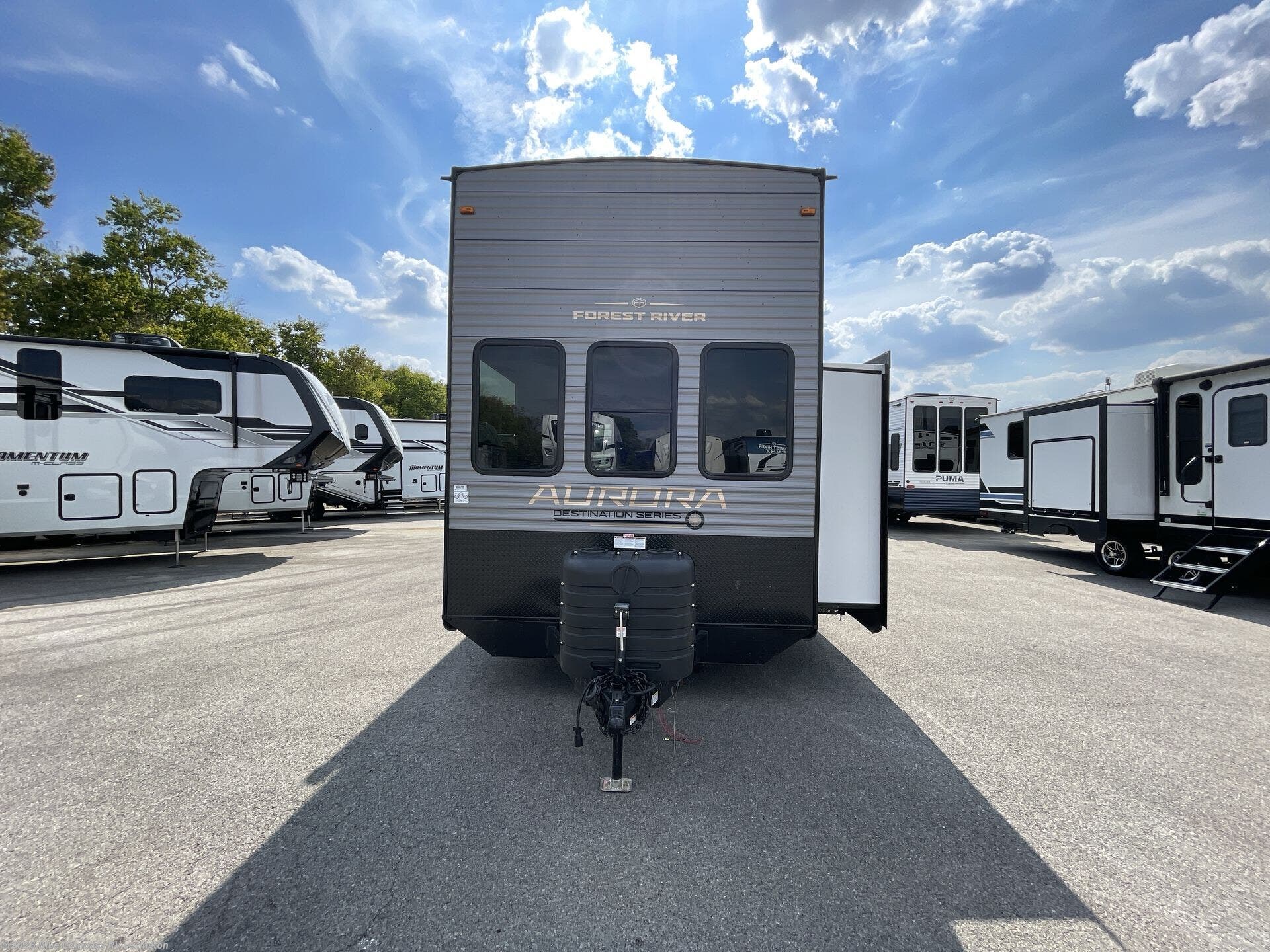 Comfortability, usability, and quality is what you will find in each one of these Forest River Aurora travel trailers, toy haulers or destination trailers! They are designed with a superior build and packed full with industry leading, functional, and distinctive standard features. SolidStep entrance steps and a Safe-T rail door assist on main entry door to help you safely enter and exit the unit. The diamond plate rock guard will protect your unit from road debris and the nitrogen filled radial tires, which keep their pressure longer, offer better fuel economy. You will also find upgraded JBL Elite exterior speakers outside, an electric awning with multicolor lights and remote, plus flush mount baggage doors for easy packing. The interiors are beautifully designed with a deep undermount farm style sink, stainless steel appliances, and linoleum flooring in the slide outs which will be easy to clean. Come find your favorite model today!