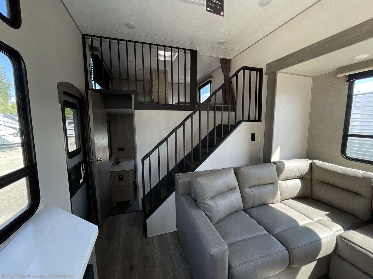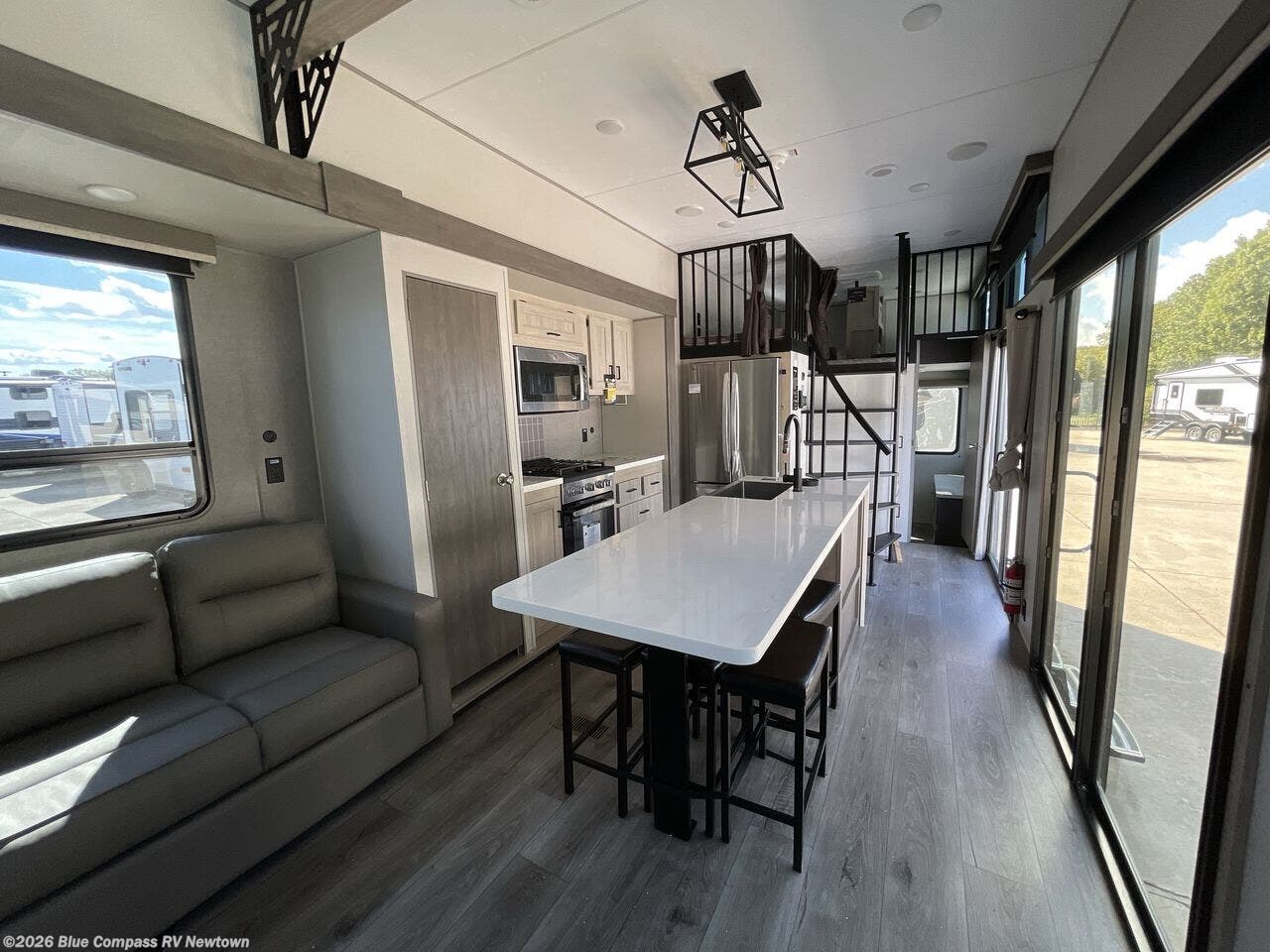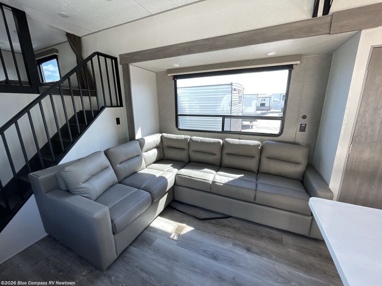 You won't believe the amount of comfort found throughout this destination trailer! The front private bedroom will provide you with your own space each night, and here you'll enjoy the RV queen bed slide out, wardrobe closets and a dresser, plus a bedroom fireplace for more comfort. The main living area is made spacious thanks to the large slide out, and the kitchen island with five bar stools will be the perfect place to dine together each day. There is also a hide-a-bed sectional sofa everyone is sure to enjoy relaxing on, and the power lift TV means you can make it a movie night! A spacious full rear bath includes a 48" x 30" shower with a seat and glass shower door and plenty of storage space to keep clean towels and bath necessities stocked. The feature you will really love on this trailer has to be the double loft areas, complete with five bunk mats in total and storage space for your guests' things; how convenient!