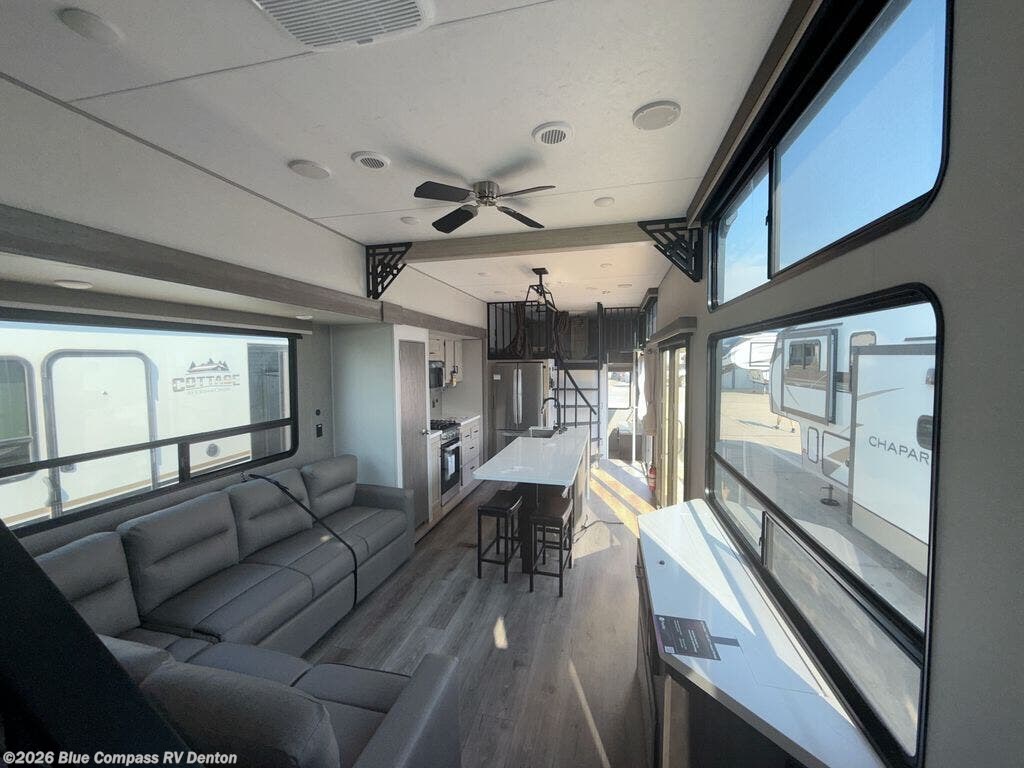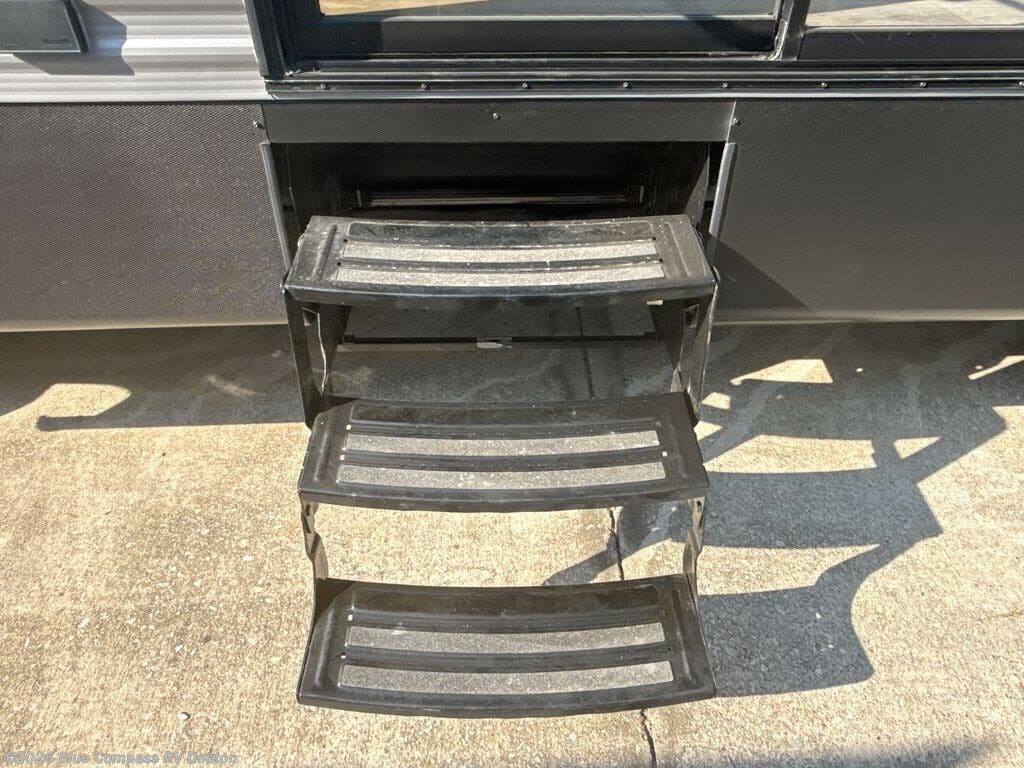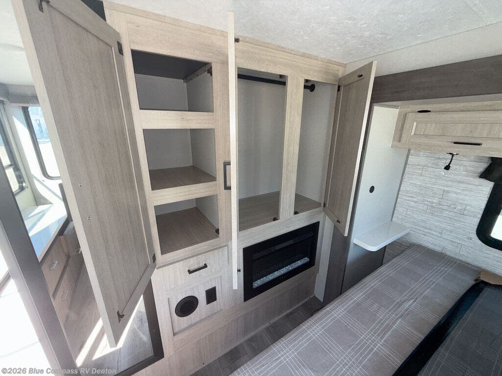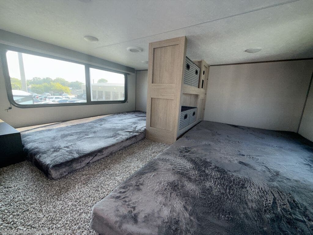 You won't believe the amount of comfort found throughout this destination trailer! The front private bedroom will provide you with your own space each night, and here you'll enjoy the RV queen bed slide out, wardrobe closets and a dresser, plus a bedroom fireplace for more comfort. The main living area is made spacious thanks to the large slide out, and the kitchen island with five bar stools will be the perfect place to dine together each day. There is also a hide-a-bed sectional sofa everyone is sure to enjoy relaxing on, and the power lift TV means you can make it a movie night! A spacious full rear bath includes a 48" x 30" shower with a seat and glass shower door and plenty of storage space to keep clean towels and bath necessities stocked. The feature you will really love on this trailer has to be the double loft areas, complete with five bunk mats in total and storage space for your guests' things; how convenient!