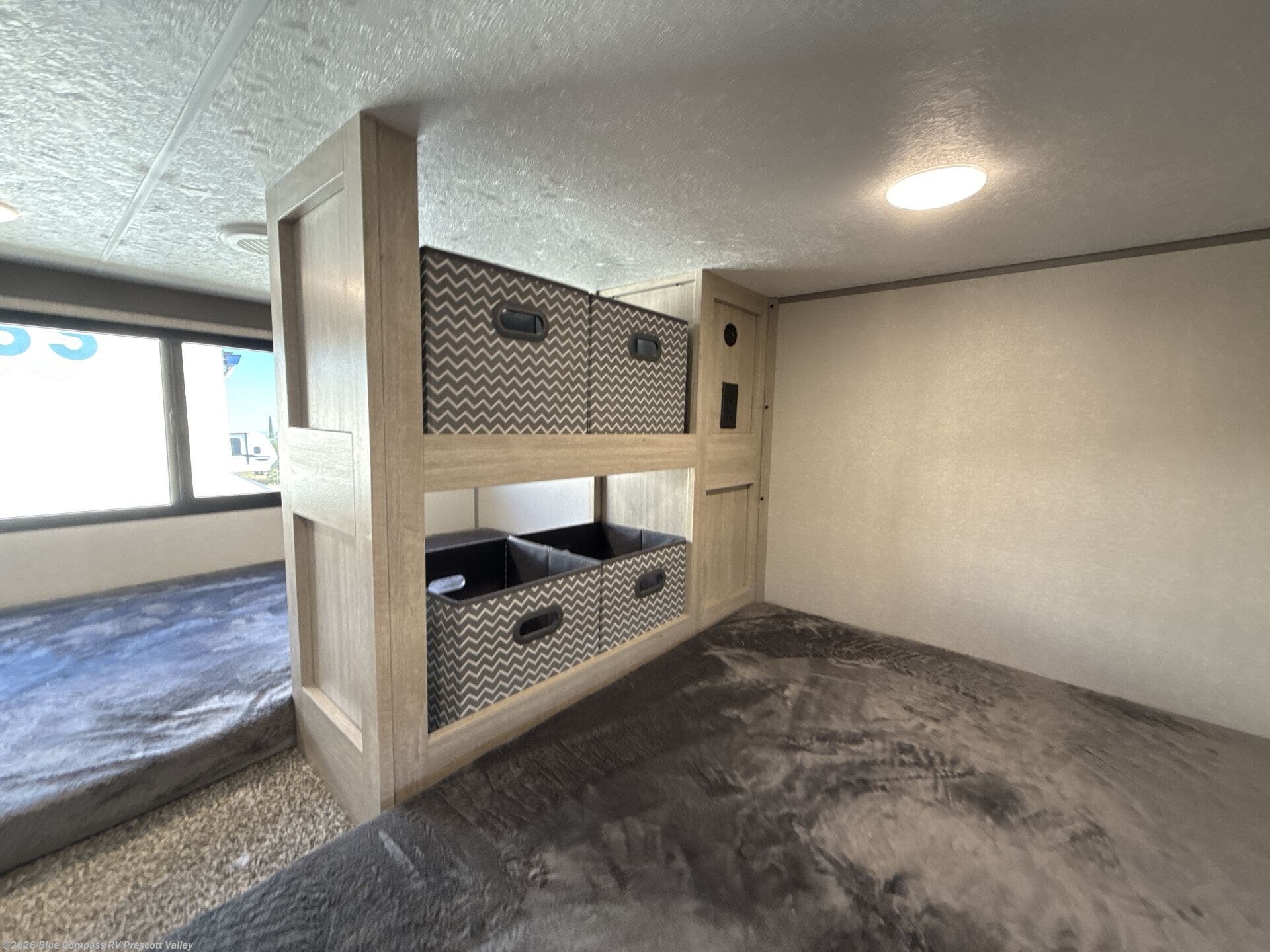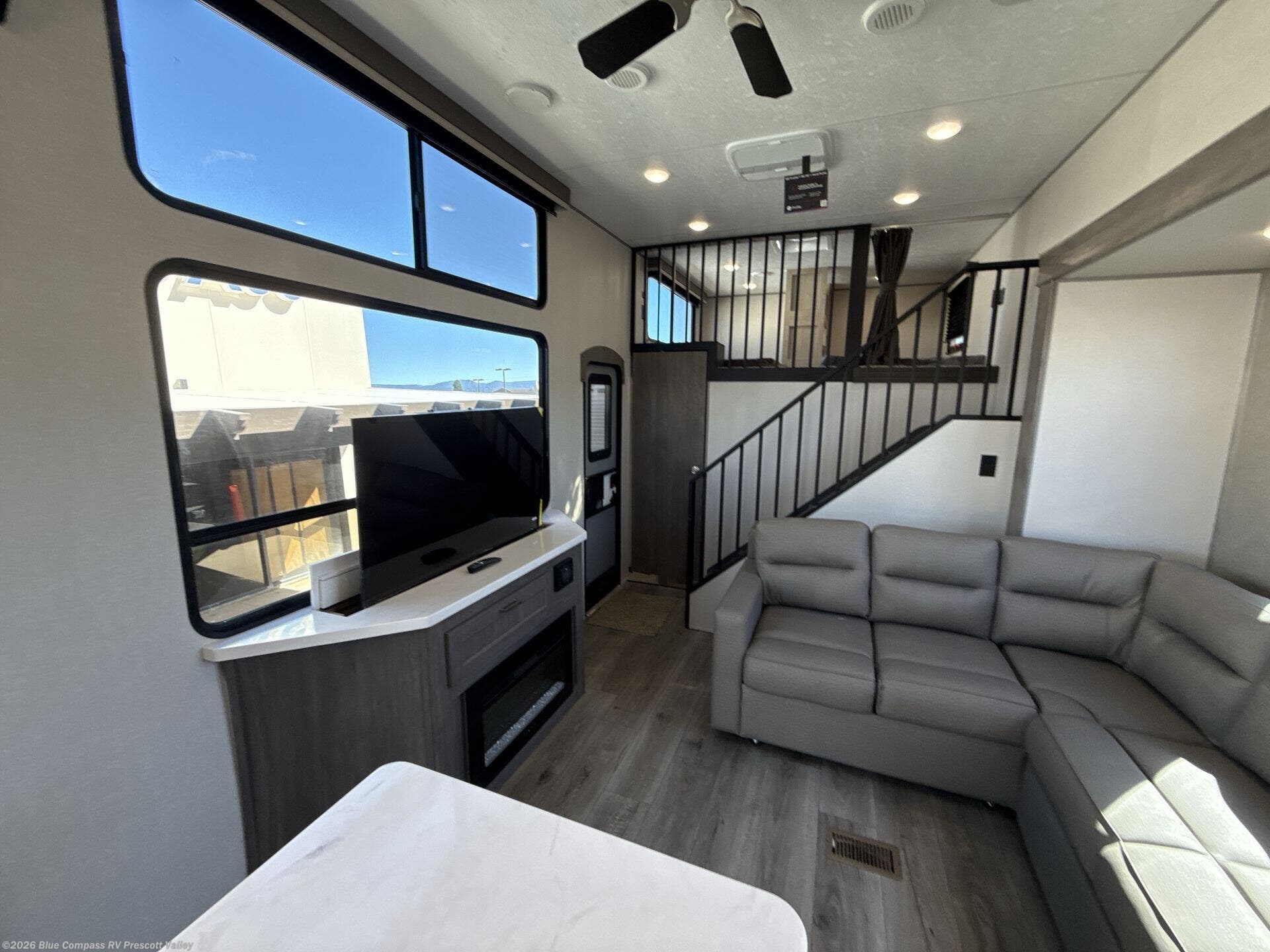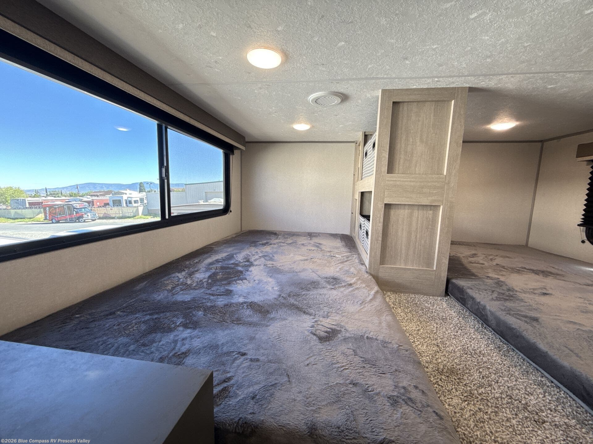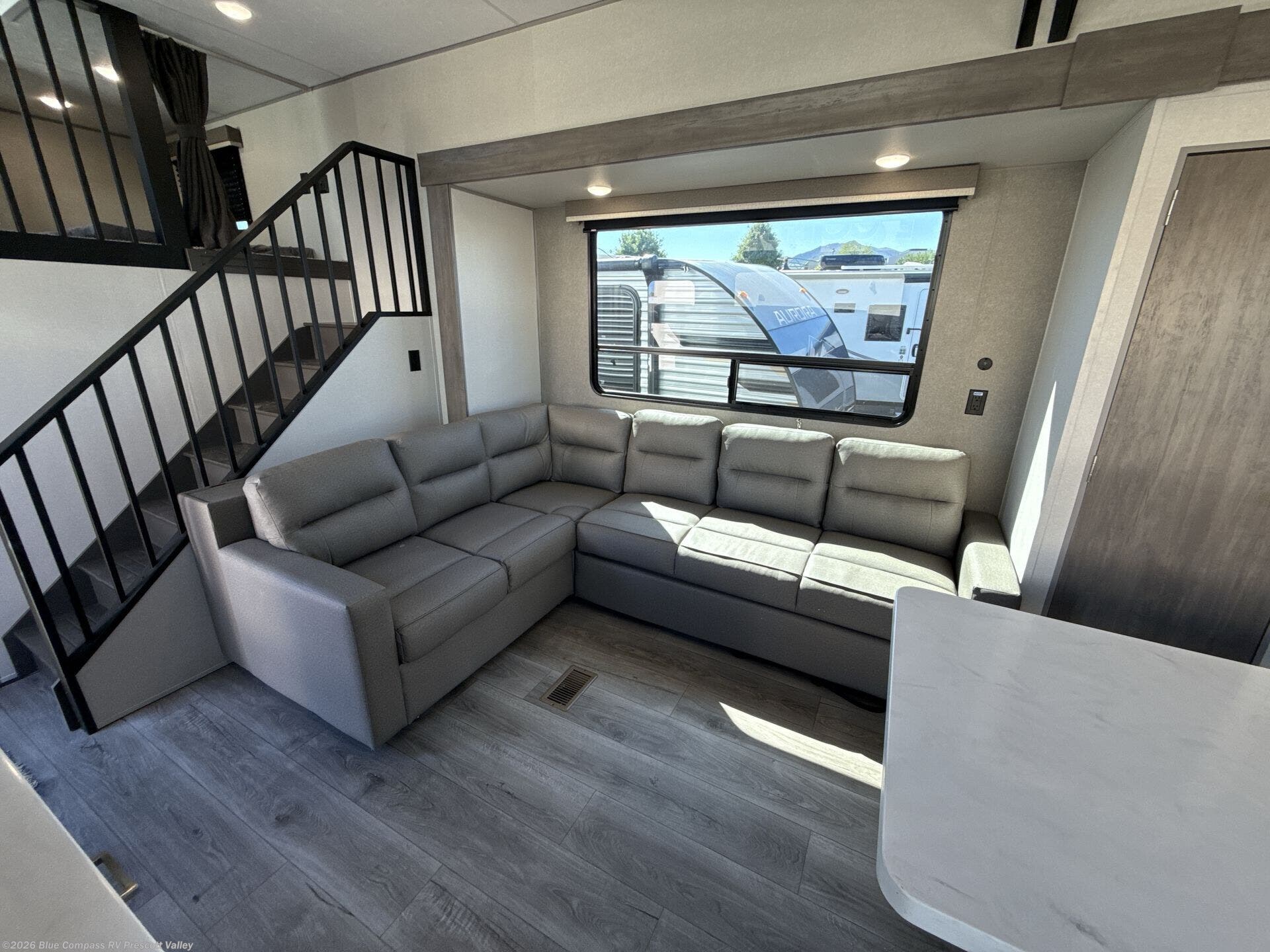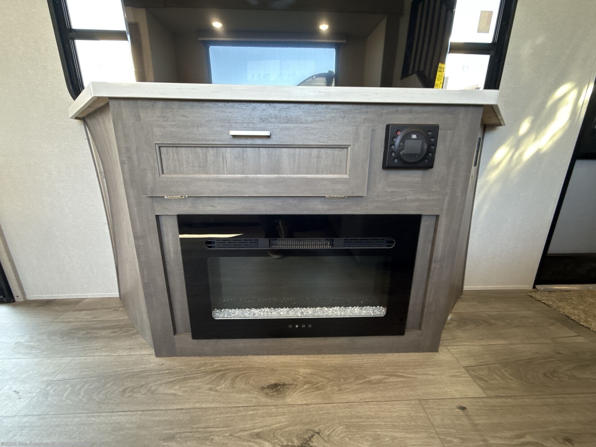 You won't believe the amount of comfort found throughout this destination trailer! The front private bedroom will provide you with your own space each night, and here you'll enjoy the RV queen bed slide out, wardrobe closets and a dresser, plus a bedroom fireplace for more comfort. The main living area is made spacious thanks to the large slide out, and the kitchen island with five bar stools will be the perfect place to dine together each day. There is also a hide-a-bed sectional sofa everyone is sure to enjoy relaxing on, and the power lift TV means you can make it a movie night! A spacious full rear bath includes a 48" x 30" shower with a seat and glass shower door and plenty of storage space to keep clean towels and bath necessities stocked. The feature you will really love on this trailer has to be the double loft areas, complete with five bunk mats in total and storage space for your guests' things; how convenient!