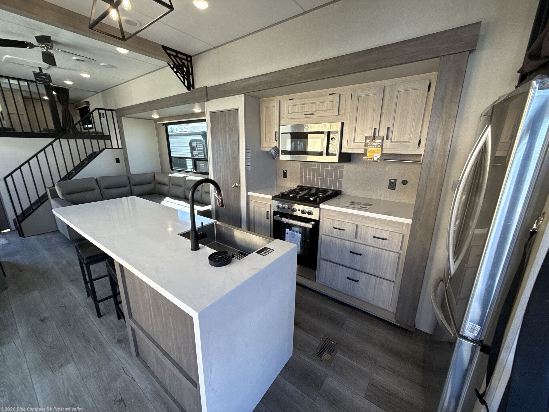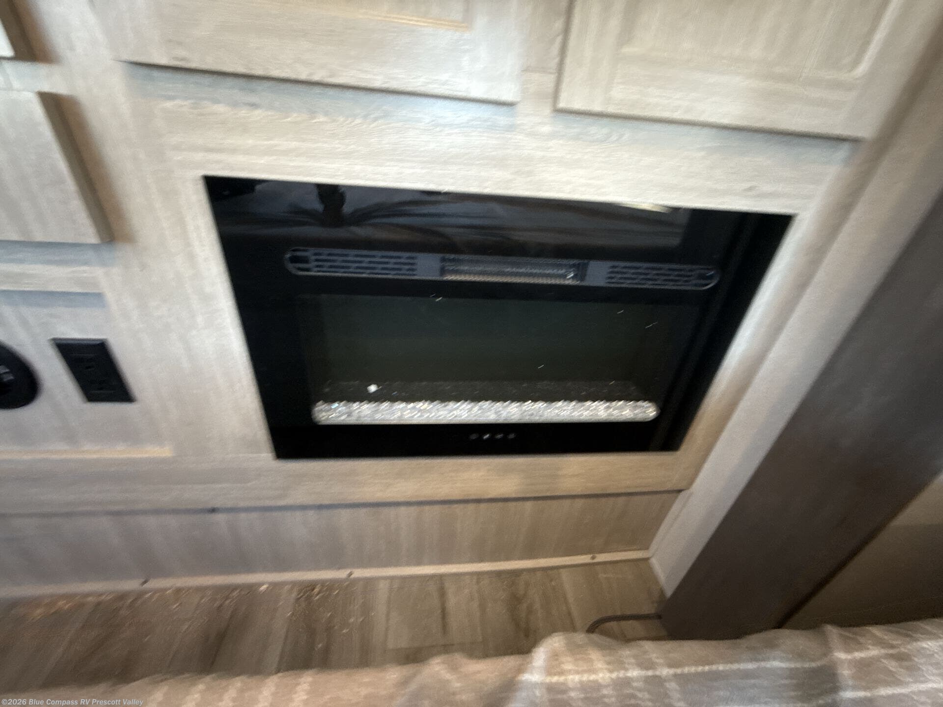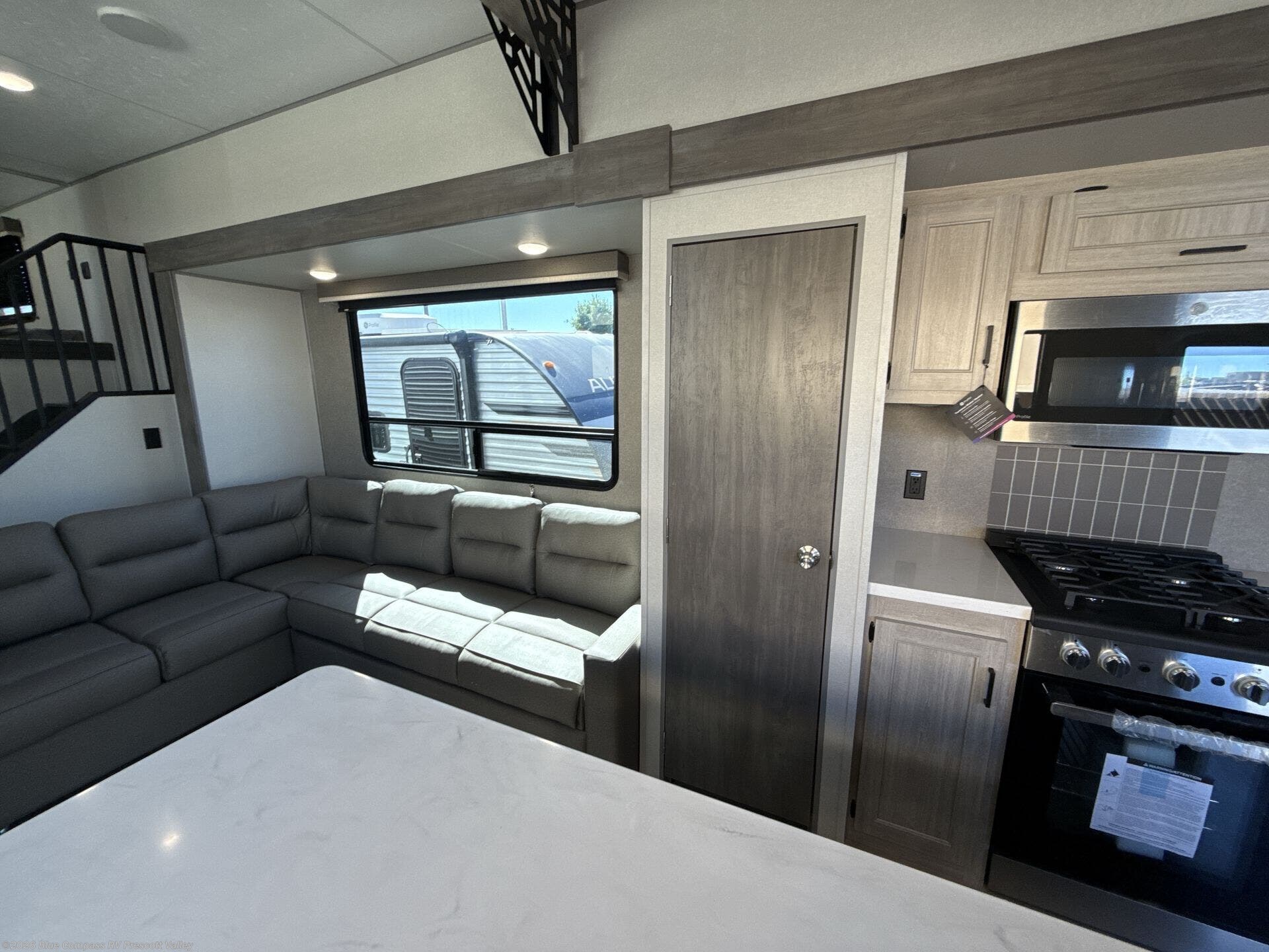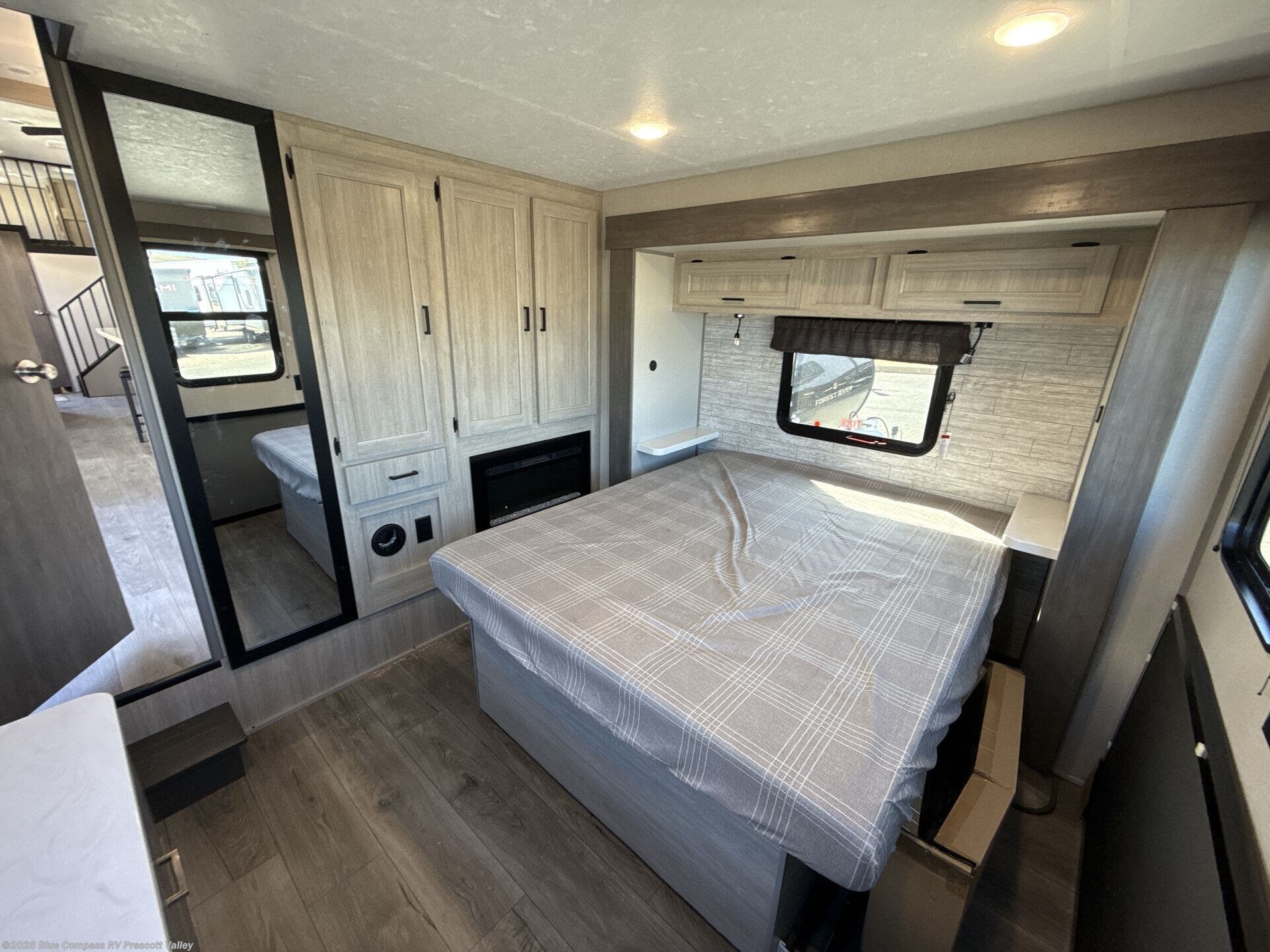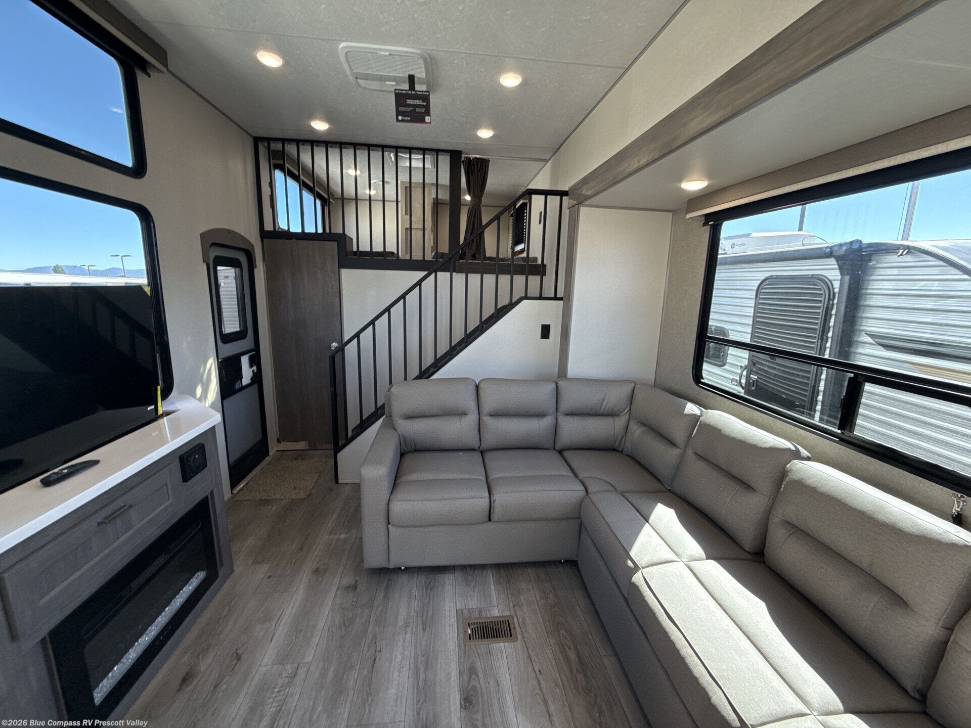 You won't believe the amount of comfort found throughout this destination trailer! The front private bedroom will provide you with your own space each night, and here you'll enjoy the RV queen bed slide out, wardrobe closets and a dresser, plus a bedroom fireplace for more comfort. The main living area is made spacious thanks to the large slide out, and the kitchen island with five bar stools will be the perfect place to dine together each day. There is also a hide-a-bed sectional sofa everyone is sure to enjoy relaxing on, and the power lift TV means you can make it a movie night! A spacious full rear bath includes a 48" x 30" shower with a seat and glass shower door and plenty of storage space to keep clean towels and bath necessities stocked. The feature you will really love on this trailer has to be the double loft areas, complete with five bunk mats in total and storage space for your guests' things; how convenient!