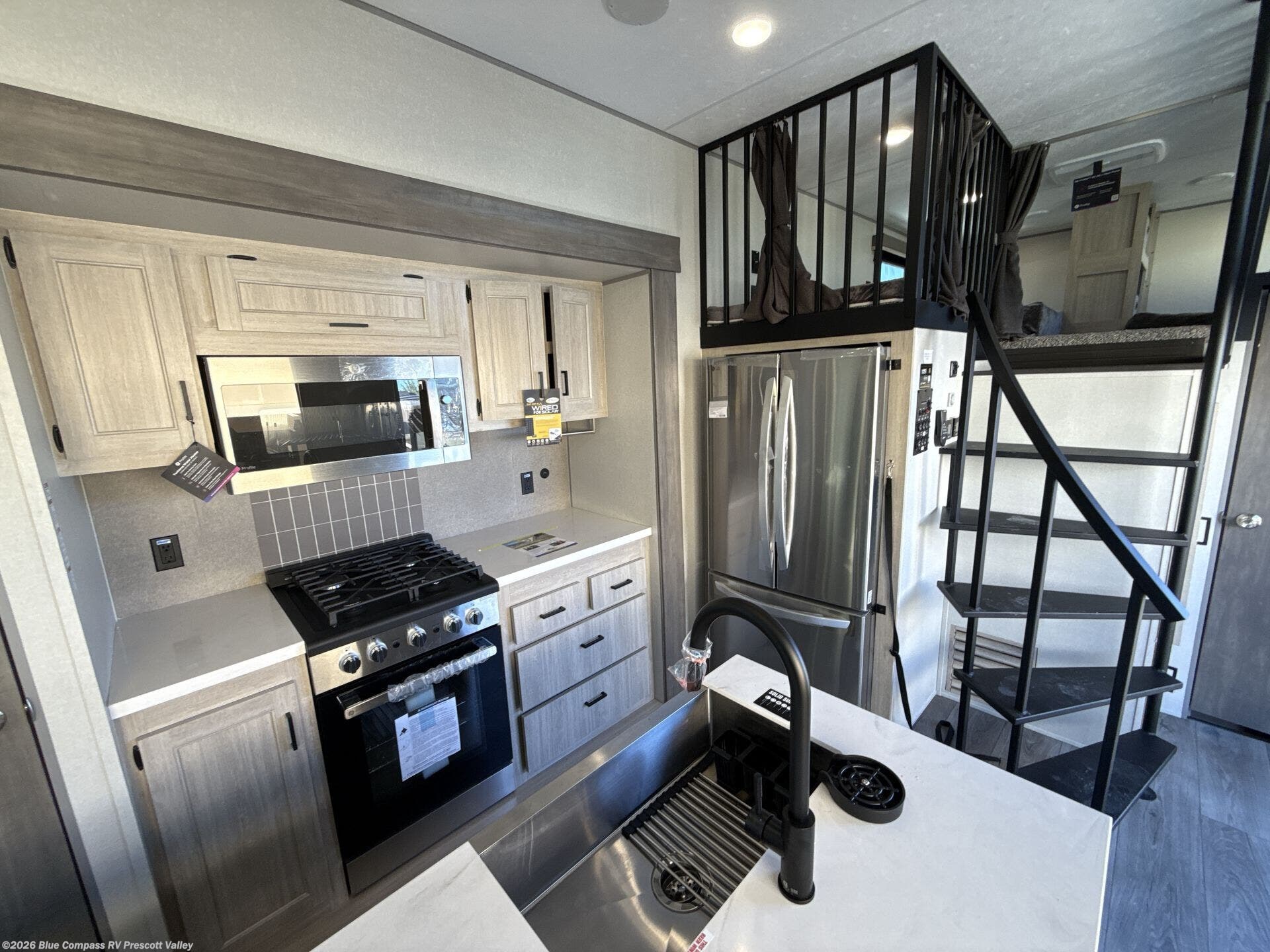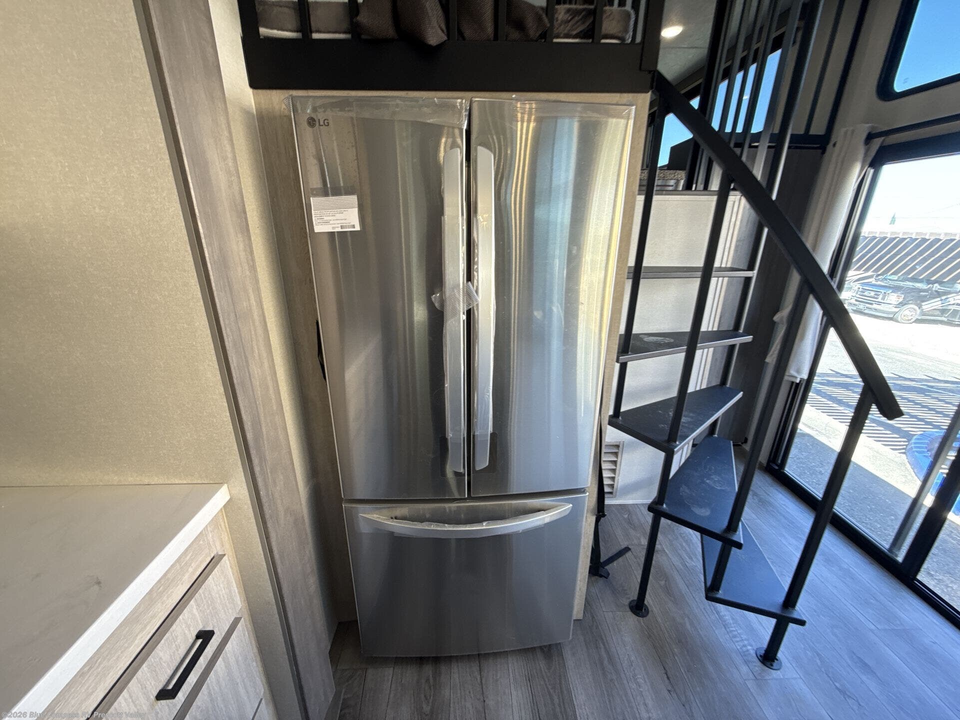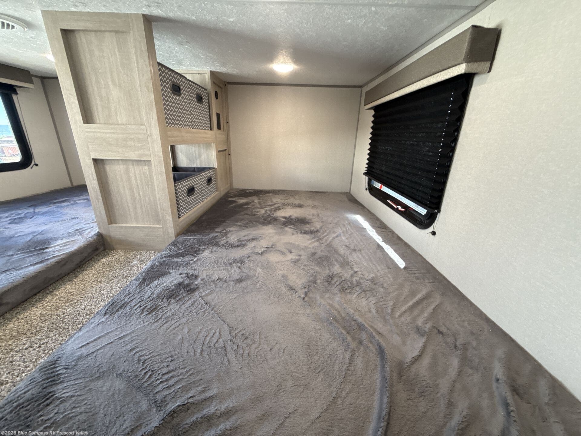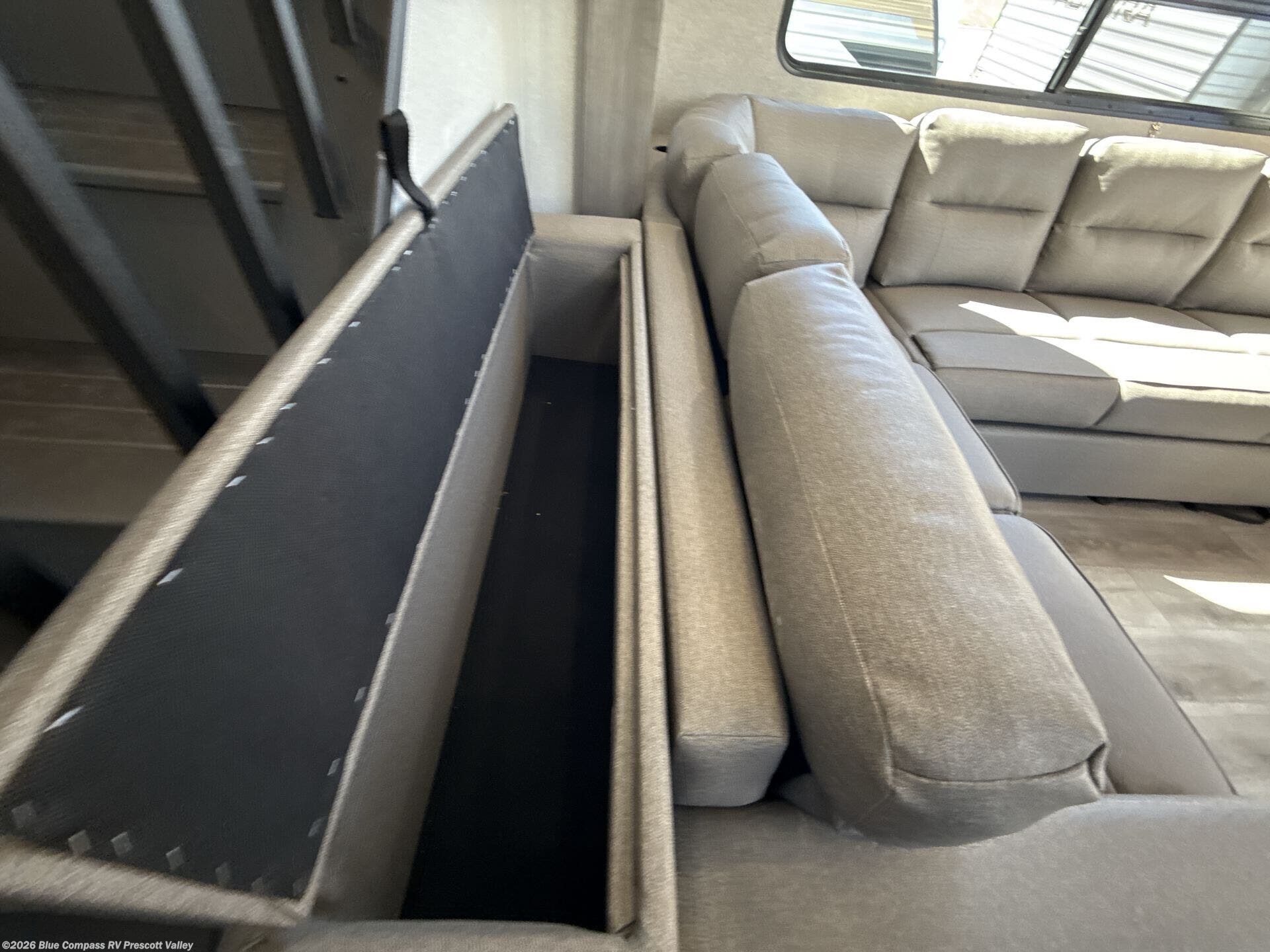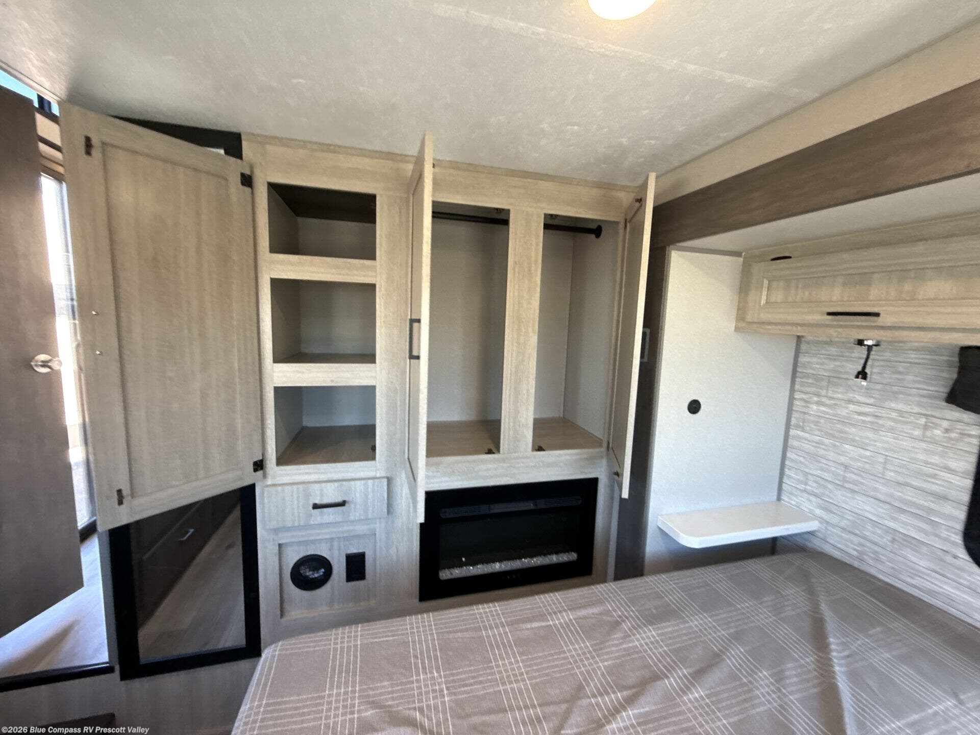 You won't believe the amount of comfort found throughout this destination trailer! The front private bedroom will provide you with your own space each night, and here you'll enjoy the RV queen bed slide out, wardrobe closets and a dresser, plus a bedroom fireplace for more comfort. The main living area is made spacious thanks to the large slide out, and the kitchen island with five bar stools will be the perfect place to dine together each day. There is also a hide-a-bed sectional sofa everyone is sure to enjoy relaxing on, and the power lift TV means you can make it a movie night! A spacious full rear bath includes a 48" x 30" shower with a seat and glass shower door and plenty of storage space to keep clean towels and bath necessities stocked. The feature you will really love on this trailer has to be the double loft areas, complete with five bunk mats in total and storage space for your guests' things; how convenient!