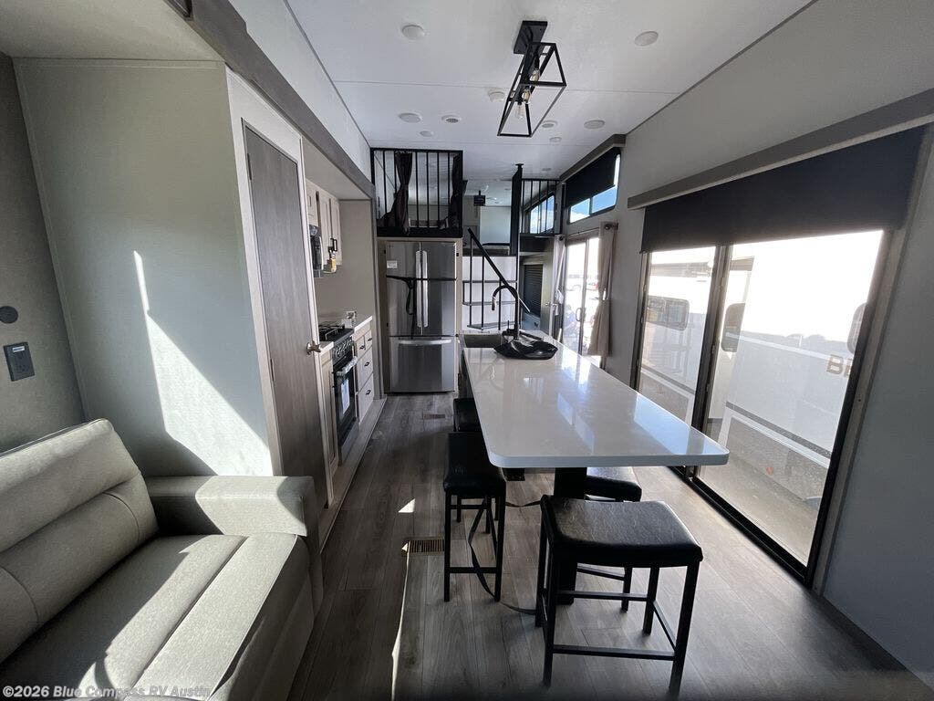 You won't believe the amount of comfort found throughout this destination trailer! The front private bedroom will provide you with your own space each night, and here you'll enjoy the RV queen bed slide out, wardrobe closets and a dresser, plus a bedroom fireplace for more comfort. The main living area is made spacious thanks to the large slide out, and the kitchen island with five bar stools will be the perfect place to dine together each day. There is also a hide-a-bed sectional sofa everyone is sure to enjoy relaxing on, and the power lift TV means you can make it a movie night! A spacious full rear bath includes a 48" x 30" shower with a seat and glass shower door and plenty of storage space to keep clean towels and bath necessities stocked. The feature you will really love on this trailer has to be the double loft areas, complete with five bunk mats in total and storage space for your guests' things; how convenient!