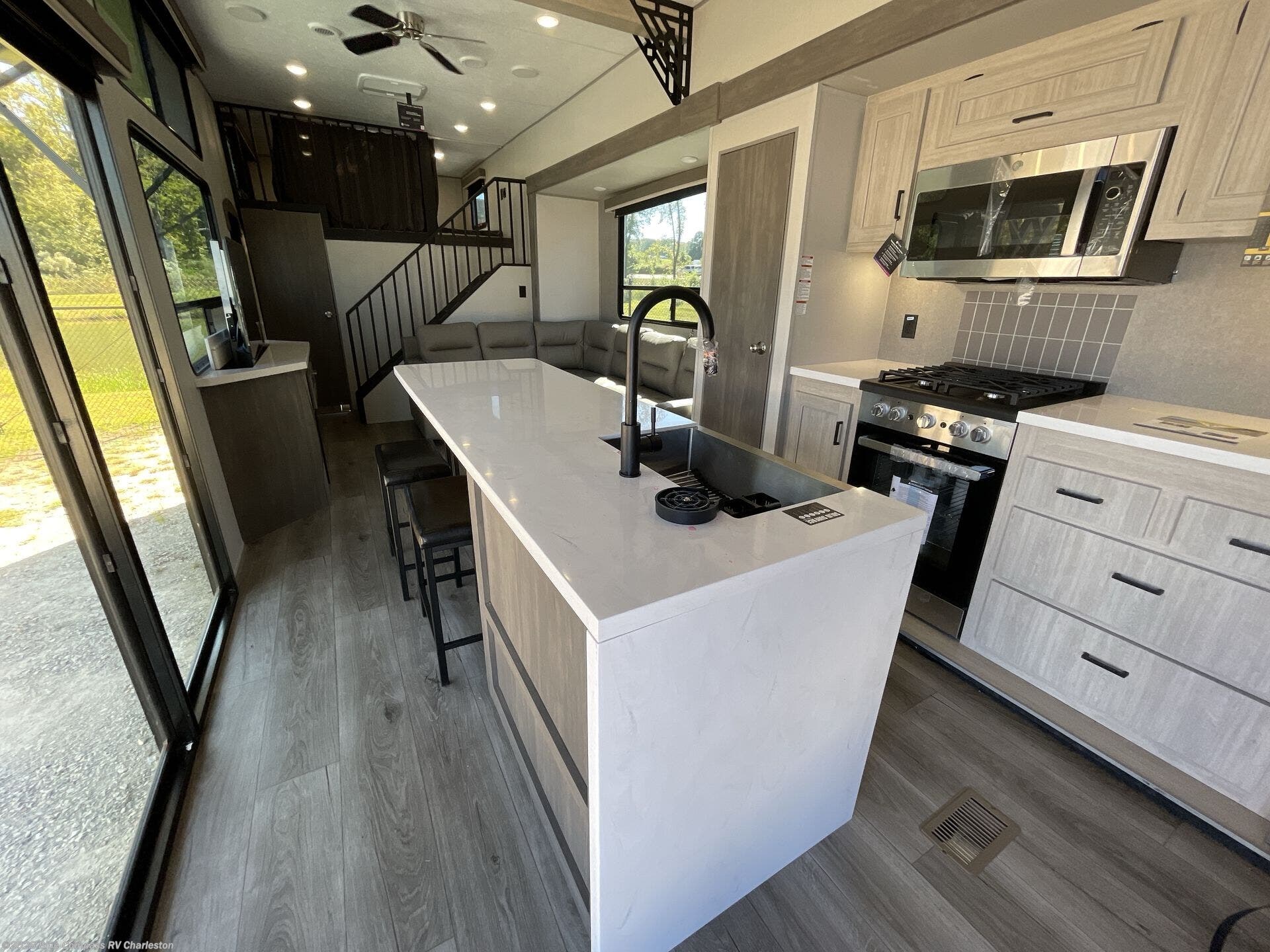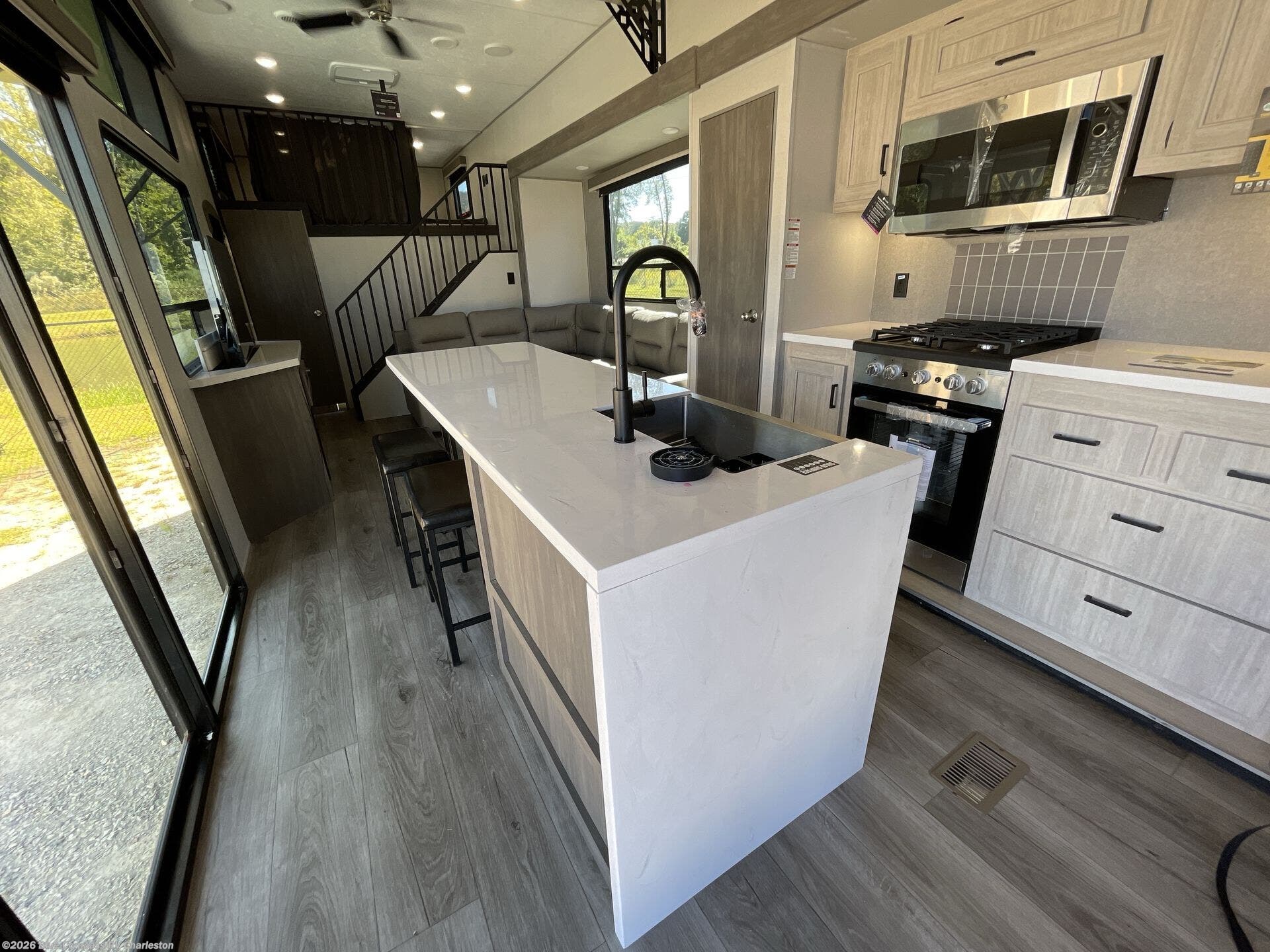 You won't believe the amount of comfort found throughout this destination trailer! The front private bedroom will provide you with your own space each night, and here you'll enjoy the RV queen bed slide out, wardrobe closets and a dresser, plus a bedroom fireplace for more comfort. The main living area is made spacious thanks to the large slide out, and the kitchen island with five bar stools will be the perfect place to dine together each day. There is also a hide-a-bed sectional sofa everyone is sure to enjoy relaxing on, and the power lift TV means you can make it a movie night! A spacious full rear bath includes a 48" x 30" shower with a seat and glass shower door and plenty of storage space to keep clean towels and bath necessities stocked. The feature you will really love on this trailer has to be the double loft areas, complete with five bunk mats in total and storage space for your guests' things; how convenient!