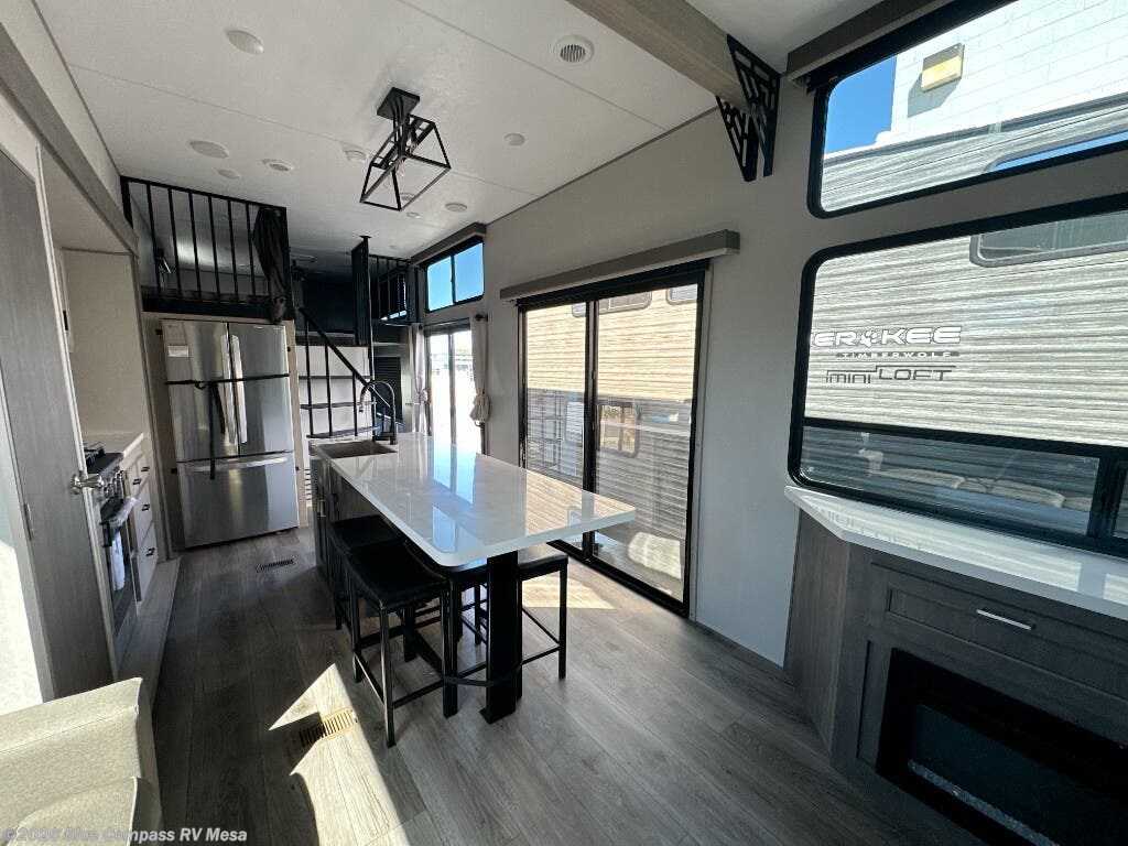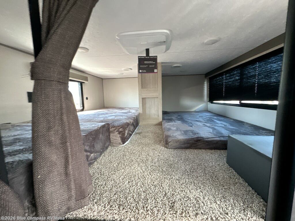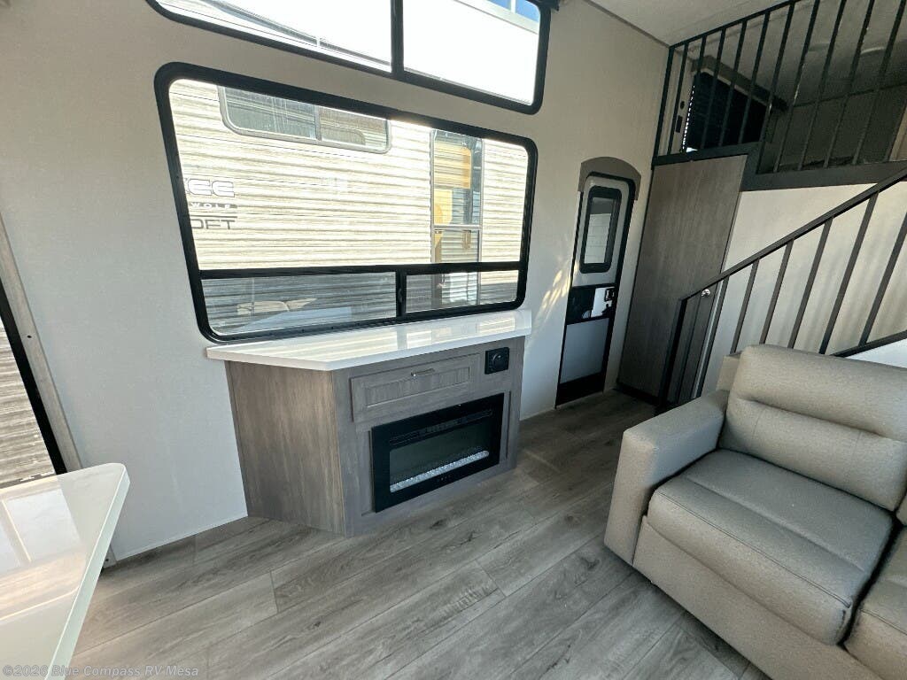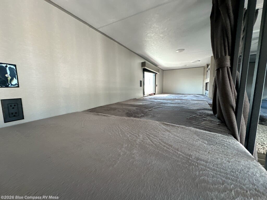 You won't believe the amount of comfort found throughout this destination trailer! The front private bedroom will provide you with your own space each night, and here you'll enjoy the RV queen bed slide out, wardrobe closets and a dresser, plus a bedroom fireplace for more comfort. The main living area is made spacious thanks to the large slide out, and the kitchen island with five bar stools will be the perfect place to dine together each day. There is also a hide-a-bed sectional sofa everyone is sure to enjoy relaxing on, and the power lift TV means you can make it a movie night! A spacious full rear bath includes a 48" x 30" shower with a seat and glass shower door and plenty of storage space to keep clean towels and bath necessities stocked. The feature you will really love on this trailer has to be the double loft areas, complete with five bunk mats in total and storage space for your guests' things; how convenient!