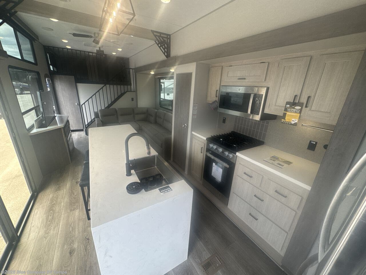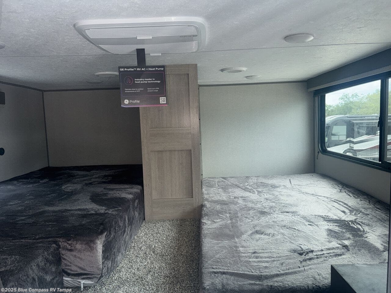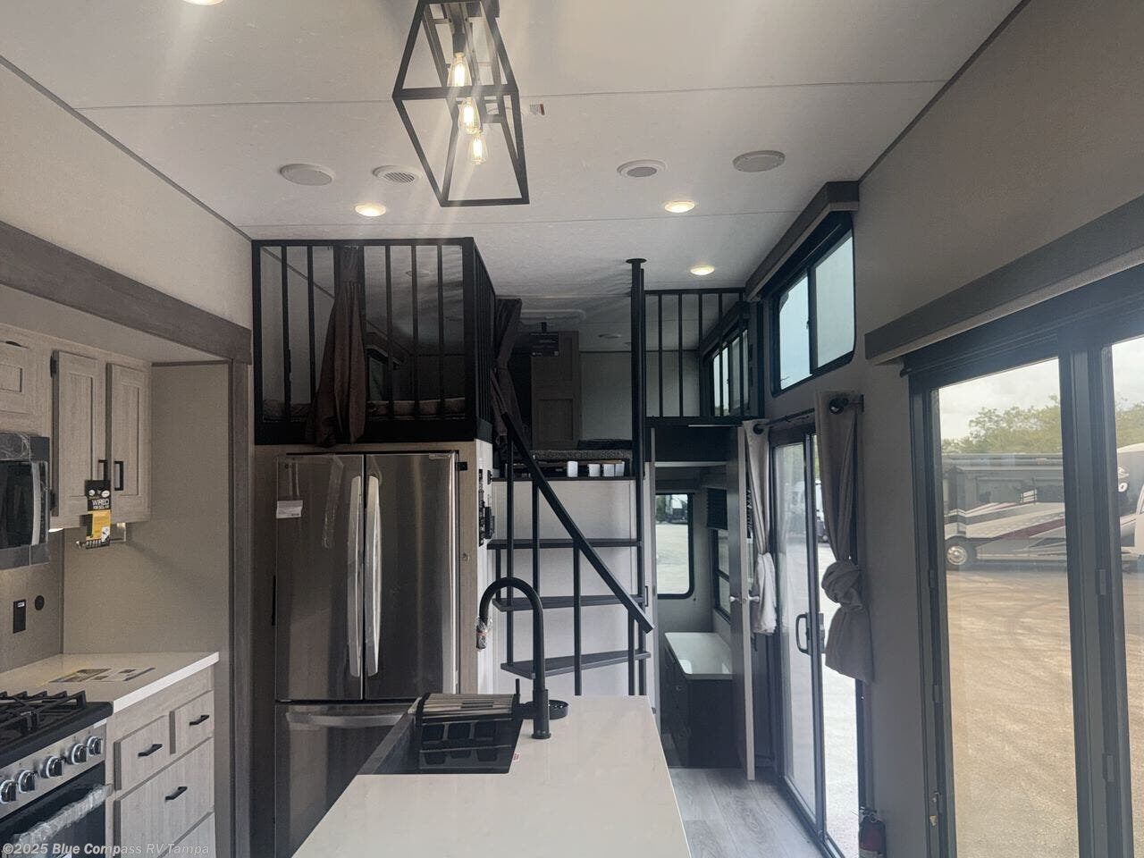 You won't believe the amount of comfort found throughout this destination trailer! The front private bedroom will provide you with your own space each night, and here you'll enjoy the RV queen bed slide out, wardrobe closets and a dresser, plus a bedroom fireplace for more comfort. The main living area is made spacious thanks to the large slide out, and the kitchen island with five bar stools will be the perfect place to dine together each day. There is also a hide-a-bed sectional sofa everyone is sure to enjoy relaxing on, and the power lift TV means you can make it a movie night! A spacious full rear bath includes a 48" x 30" shower with a seat and glass shower door and plenty of storage space to keep clean towels and bath necessities stocked. The feature you will really love on this trailer has to be the double loft areas, complete with five bunk mats in total and storage space for your guests' things; how convenient!