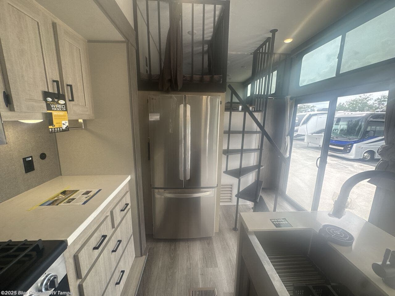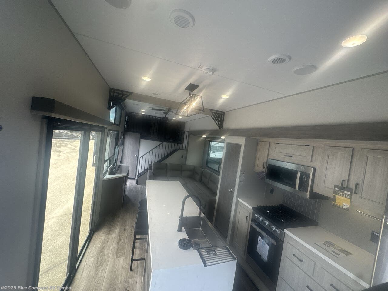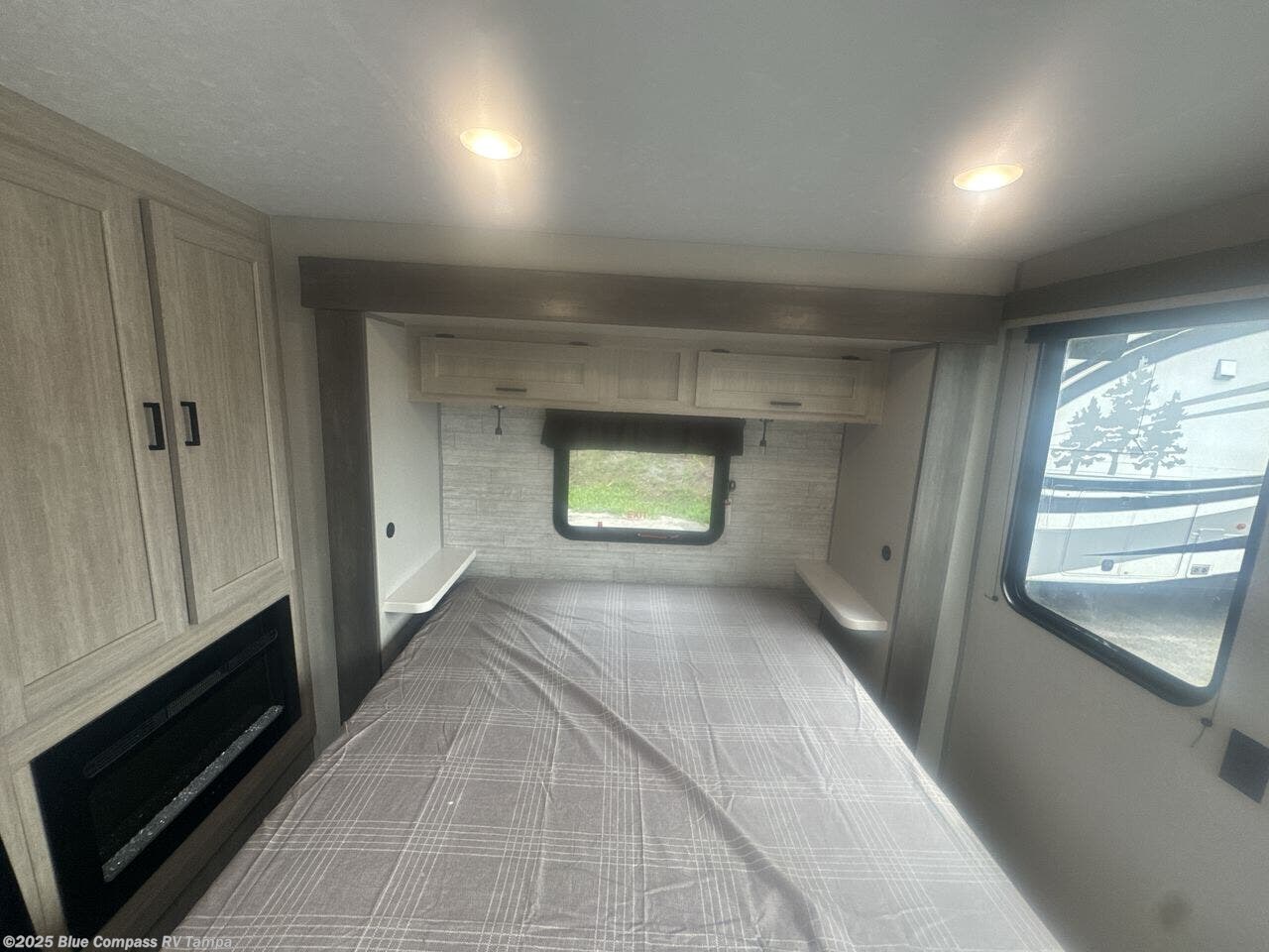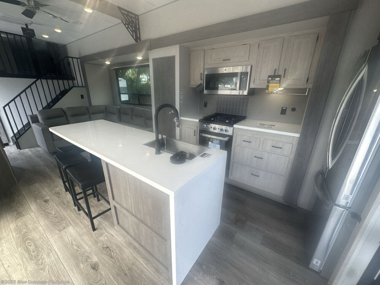 You won't believe the amount of comfort found throughout this destination trailer! The front private bedroom will provide you with your own space each night, and here you'll enjoy the RV queen bed slide out, wardrobe closets and a dresser, plus a bedroom fireplace for more comfort. The main living area is made spacious thanks to the large slide out, and the kitchen island with five bar stools will be the perfect place to dine together each day. There is also a hide-a-bed sectional sofa everyone is sure to enjoy relaxing on, and the power lift TV means you can make it a movie night! A spacious full rear bath includes a 48" x 30" shower with a seat and glass shower door and plenty of storage space to keep clean towels and bath necessities stocked. The feature you will really love on this trailer has to be the double loft areas, complete with five bunk mats in total and storage space for your guests' things; how convenient!