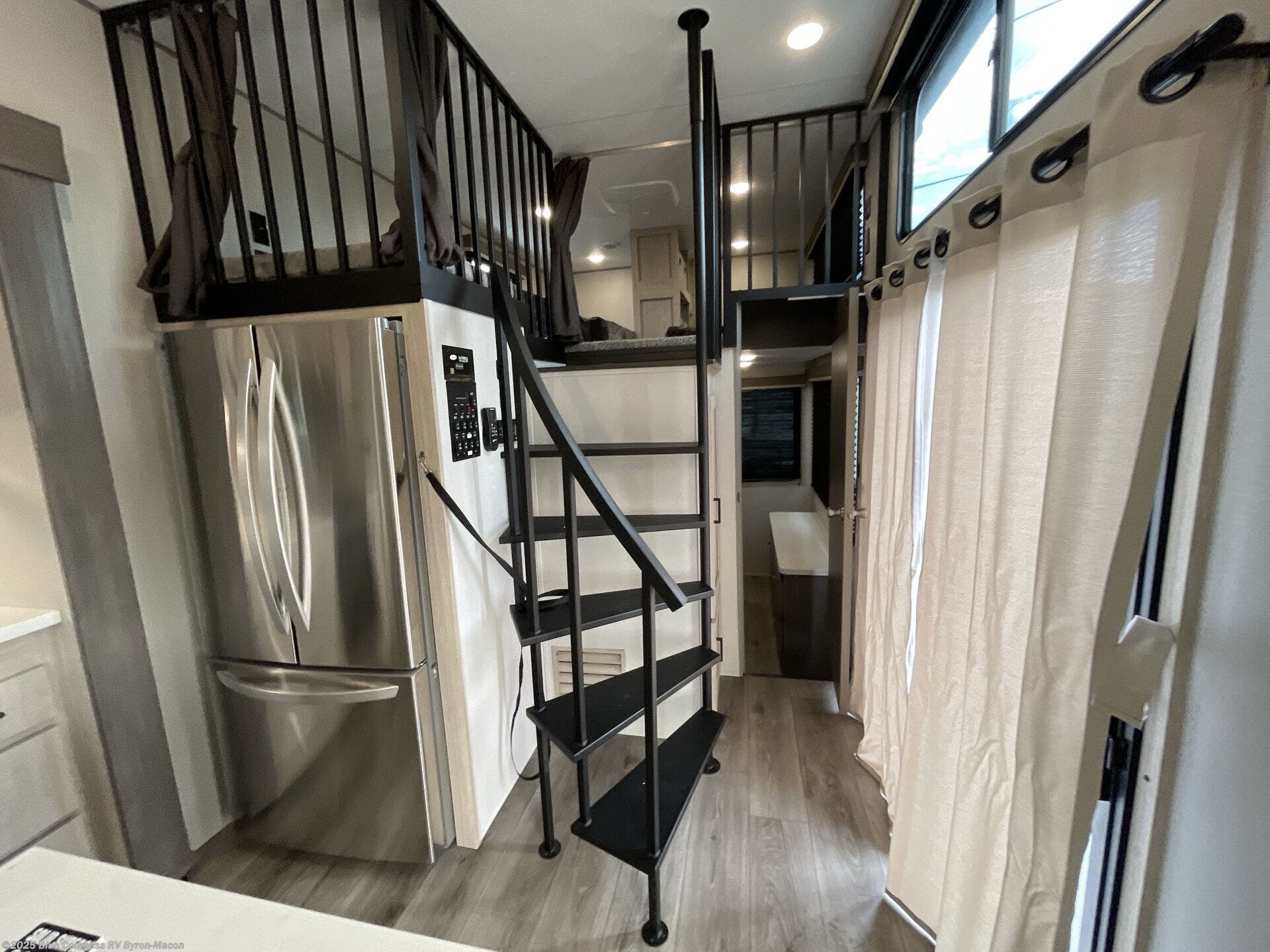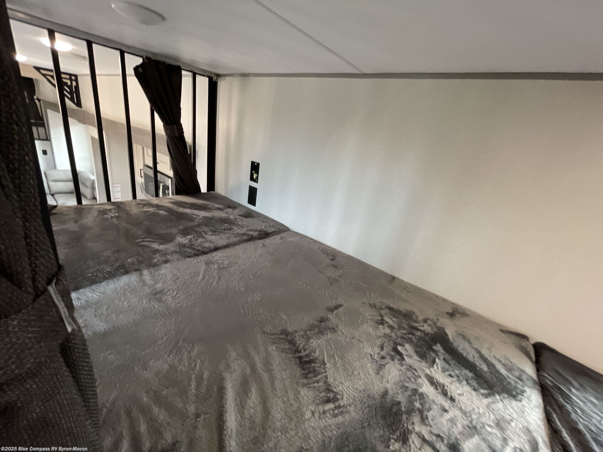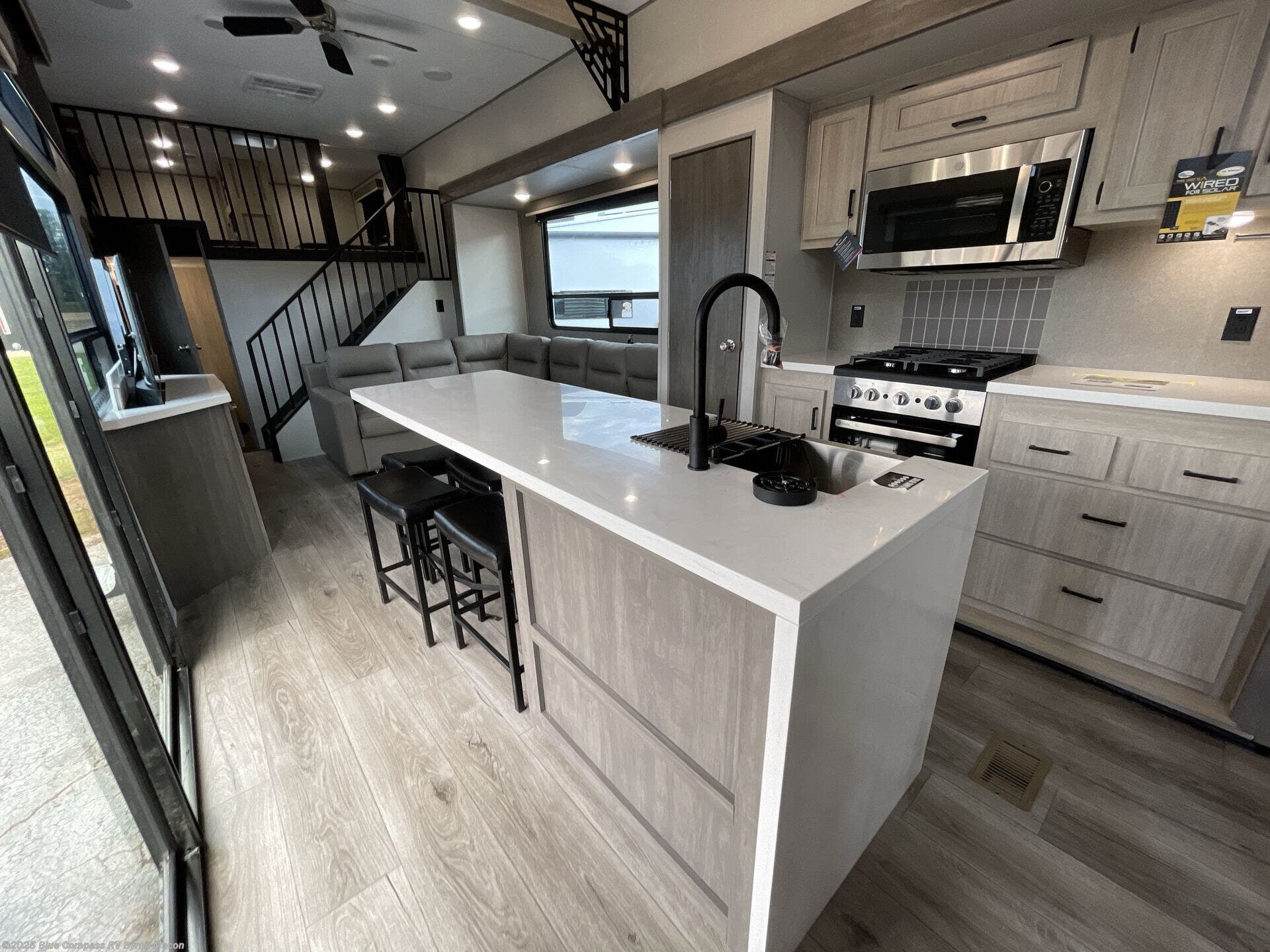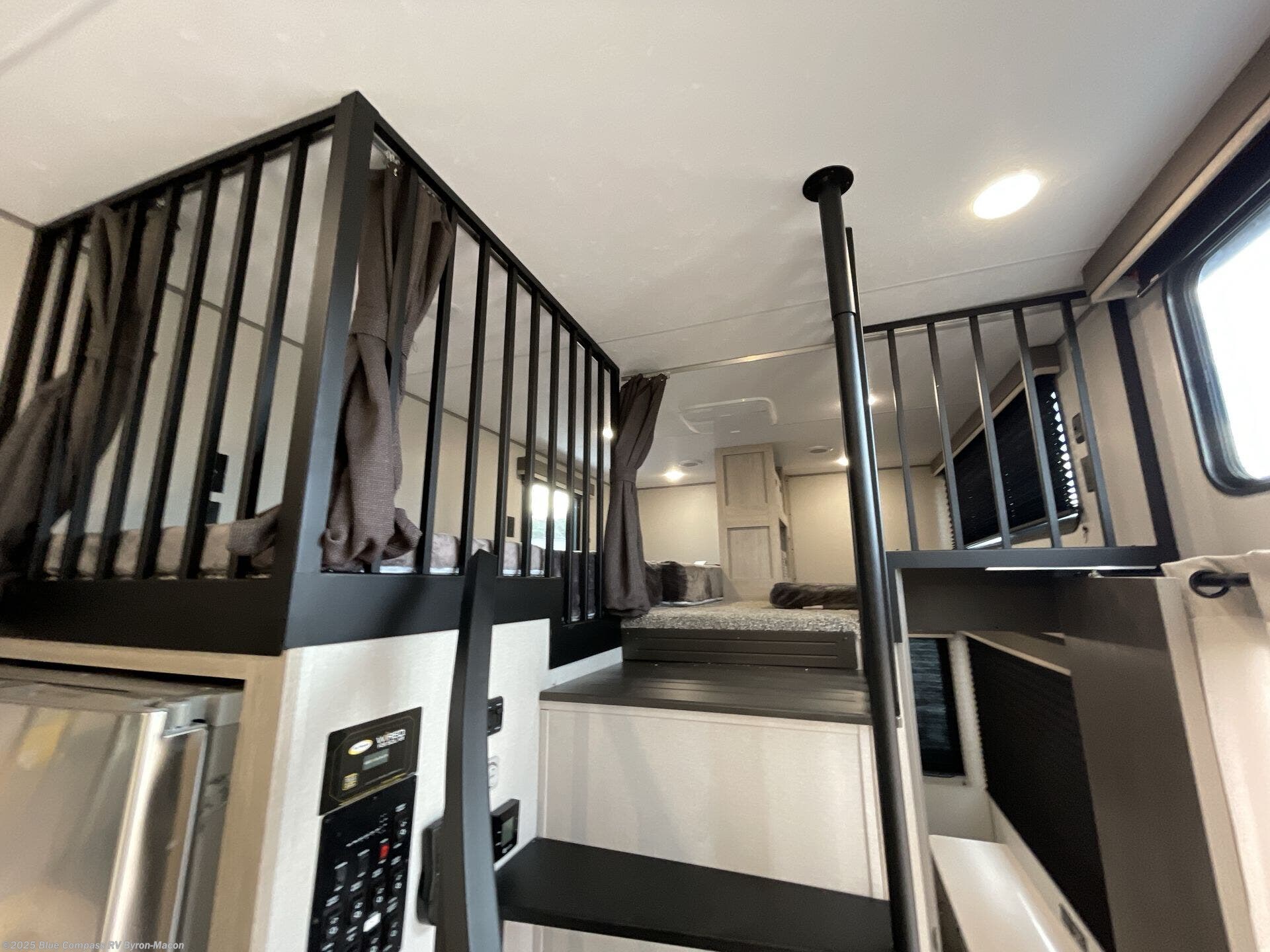 You won't believe the amount of comfort found throughout this destination trailer! The front private bedroom will provide you with your own space each night, and here you'll enjoy the RV queen bed slide out, wardrobe closets and a dresser, plus a bedroom fireplace for more comfort. The main living area is made spacious thanks to the large slide out, and the kitchen island with five bar stools will be the perfect place to dine together each day. There is also a hide-a-bed sectional sofa everyone is sure to enjoy relaxing on, and the power lift TV means you can make it a movie night! A spacious full rear bath includes a 48" x 30" shower with a seat and glass shower door and plenty of storage space to keep clean towels and bath necessities stocked. The feature you will really love on this trailer has to be the double loft areas, complete with five bunk mats in total and storage space for your guests' things; how convenient!