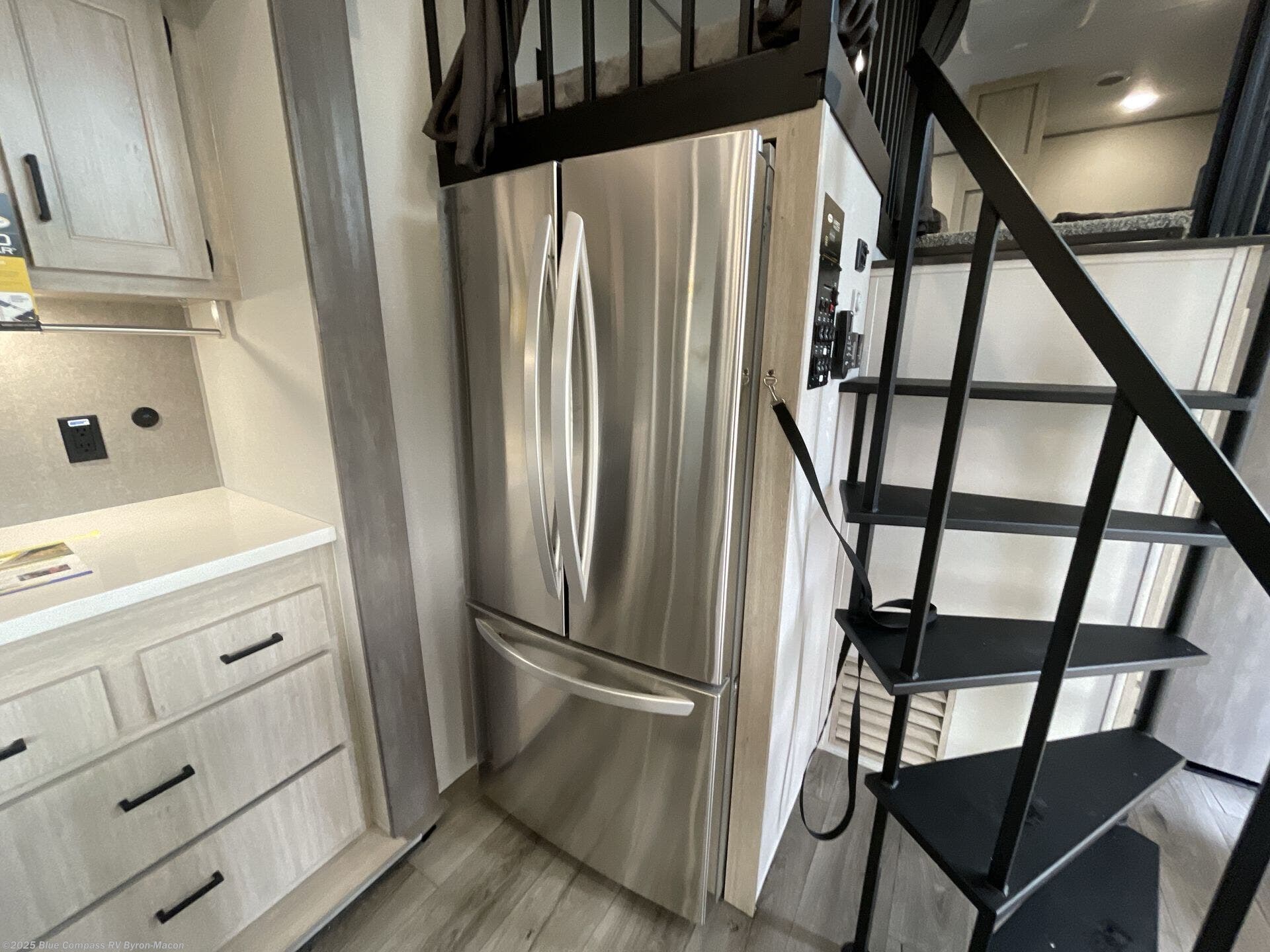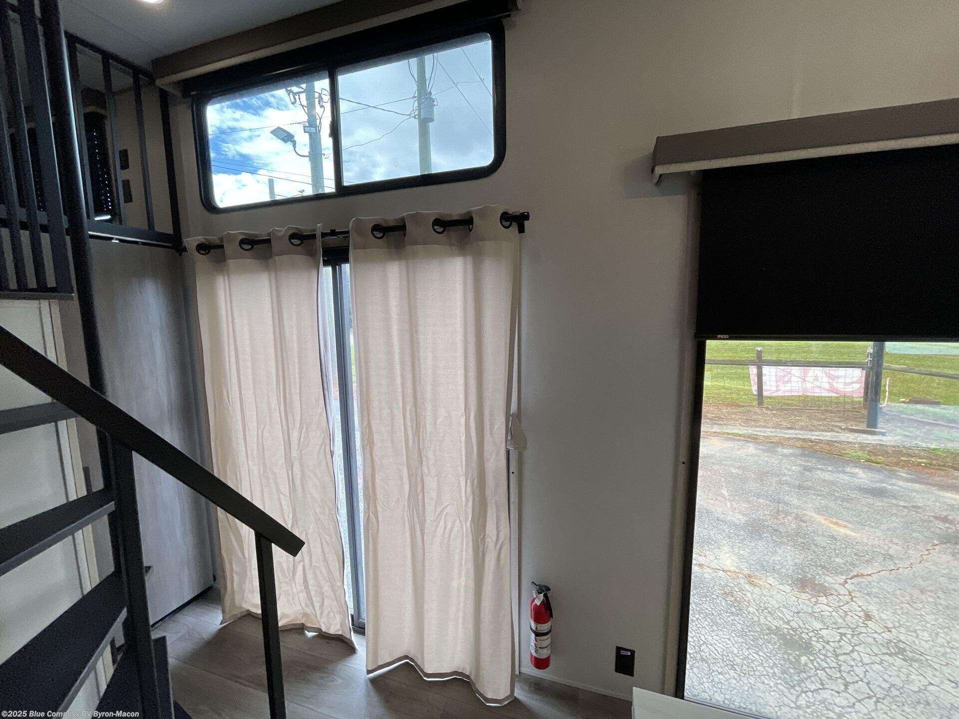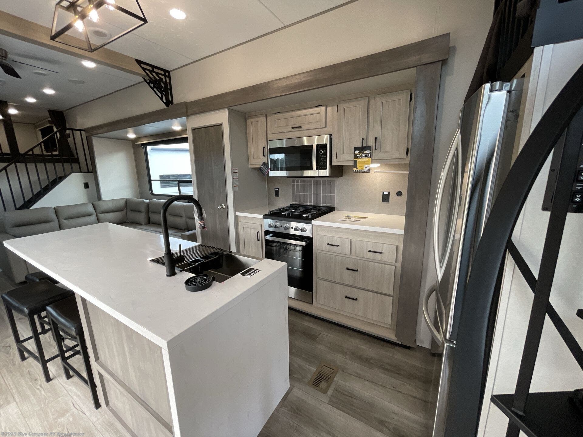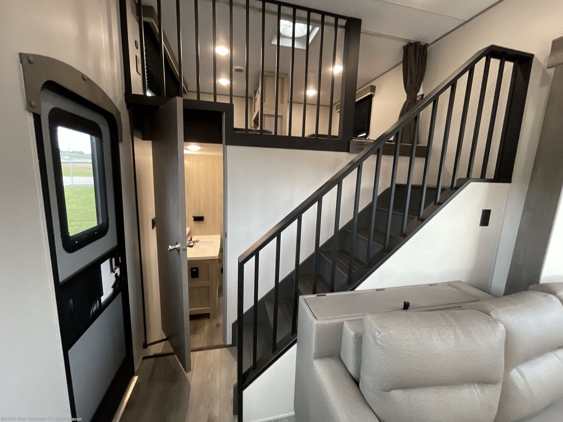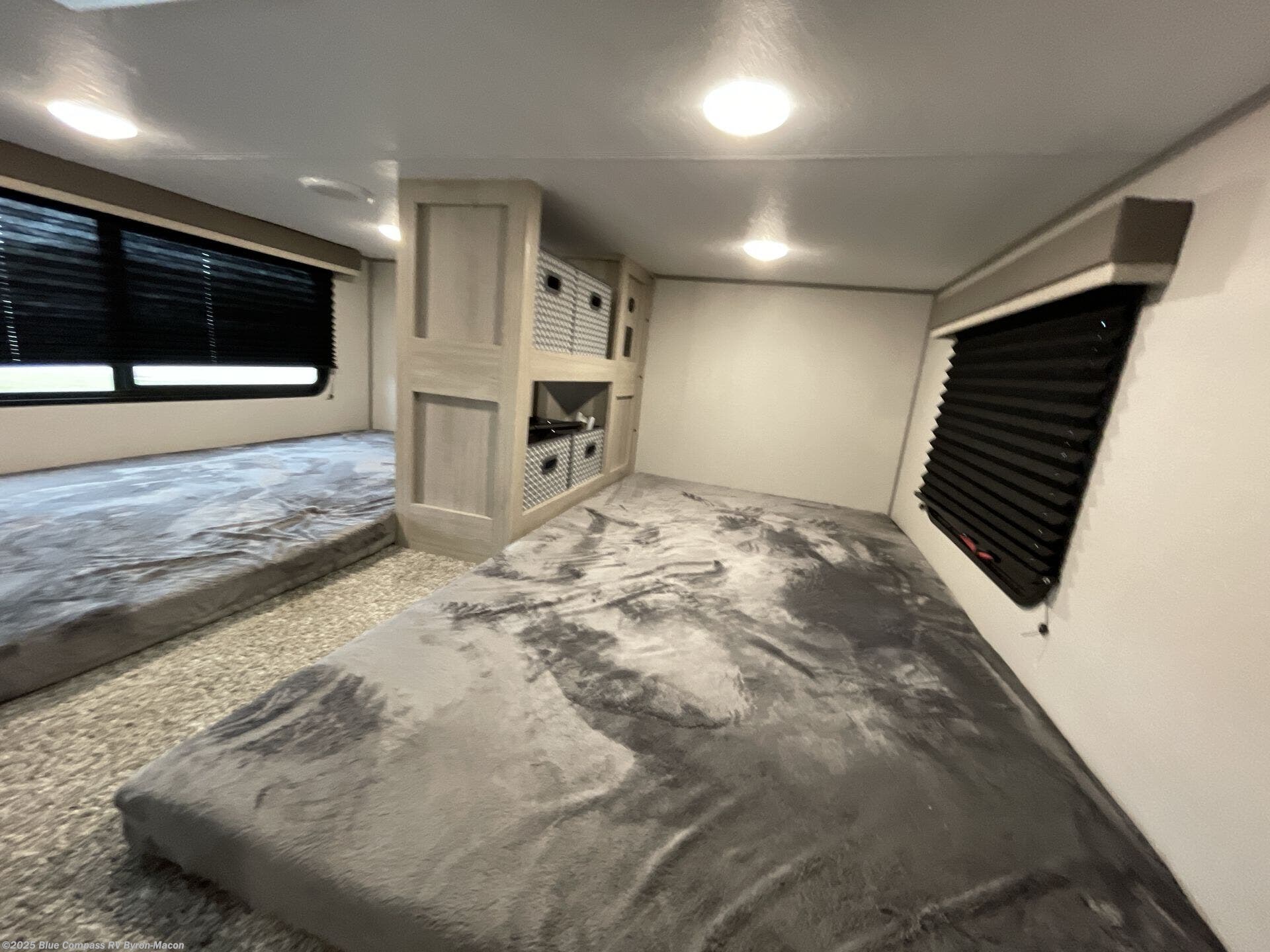 You won't believe the amount of comfort found throughout this destination trailer! The front private bedroom will provide you with your own space each night, and here you'll enjoy the RV queen bed slide out, wardrobe closets and a dresser, plus a bedroom fireplace for more comfort. The main living area is made spacious thanks to the large slide out, and the kitchen island with five bar stools will be the perfect place to dine together each day. There is also a hide-a-bed sectional sofa everyone is sure to enjoy relaxing on, and the power lift TV means you can make it a movie night! A spacious full rear bath includes a 48" x 30" shower with a seat and glass shower door and plenty of storage space to keep clean towels and bath necessities stocked. The feature you will really love on this trailer has to be the double loft areas, complete with five bunk mats in total and storage space for your guests' things; how convenient!