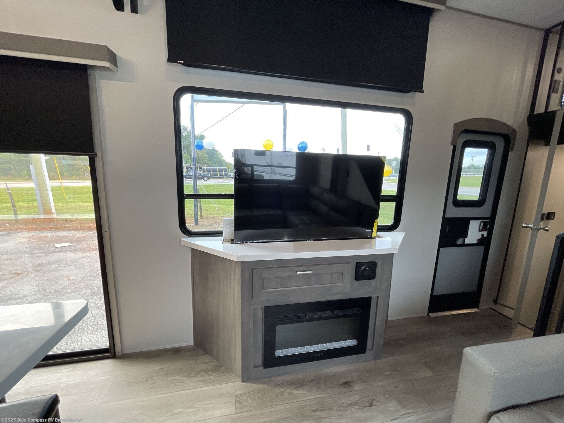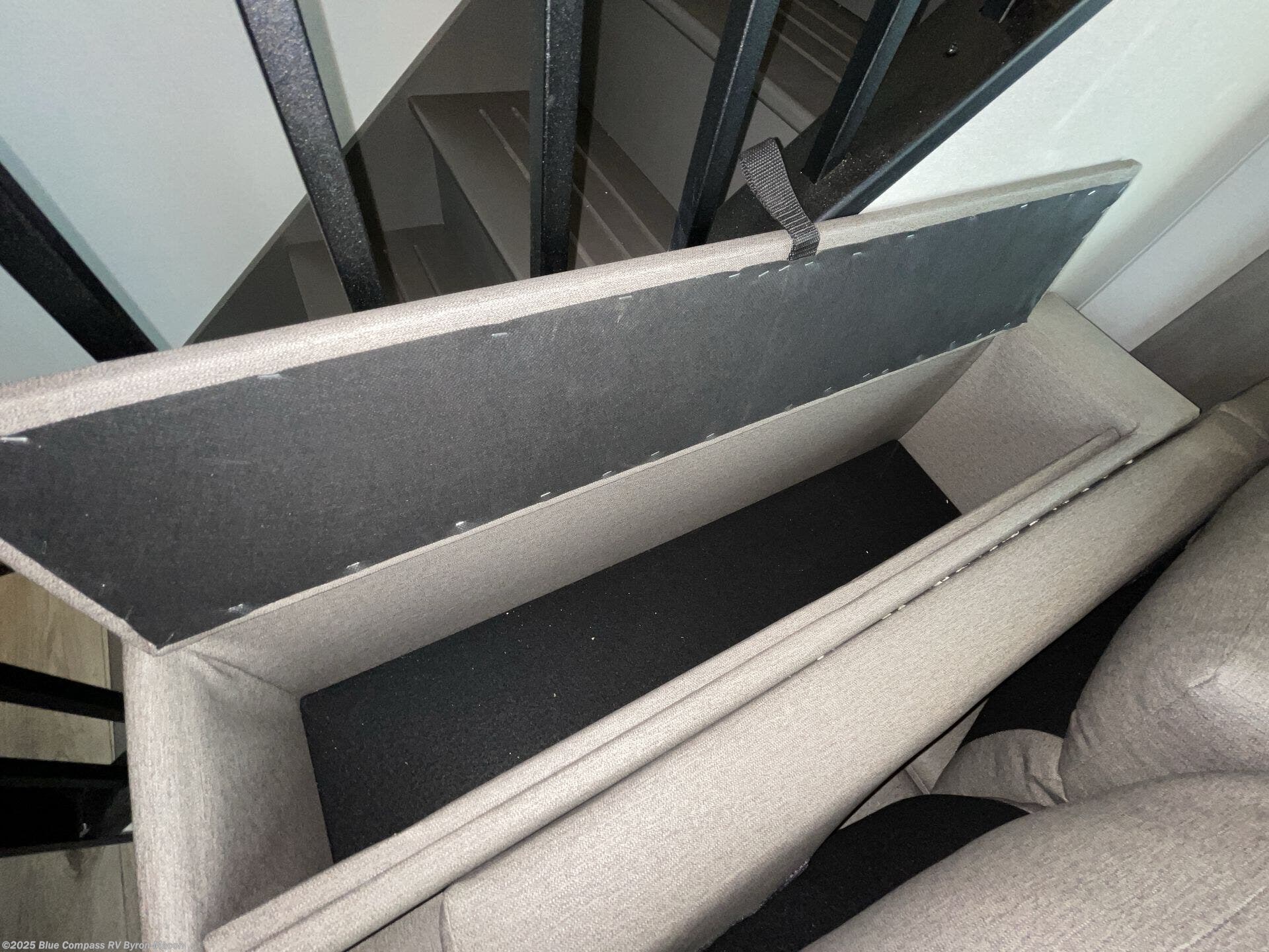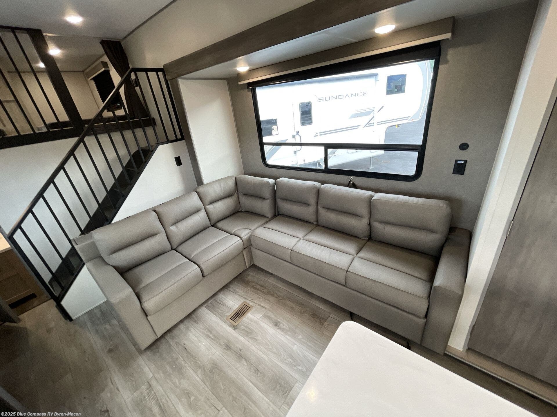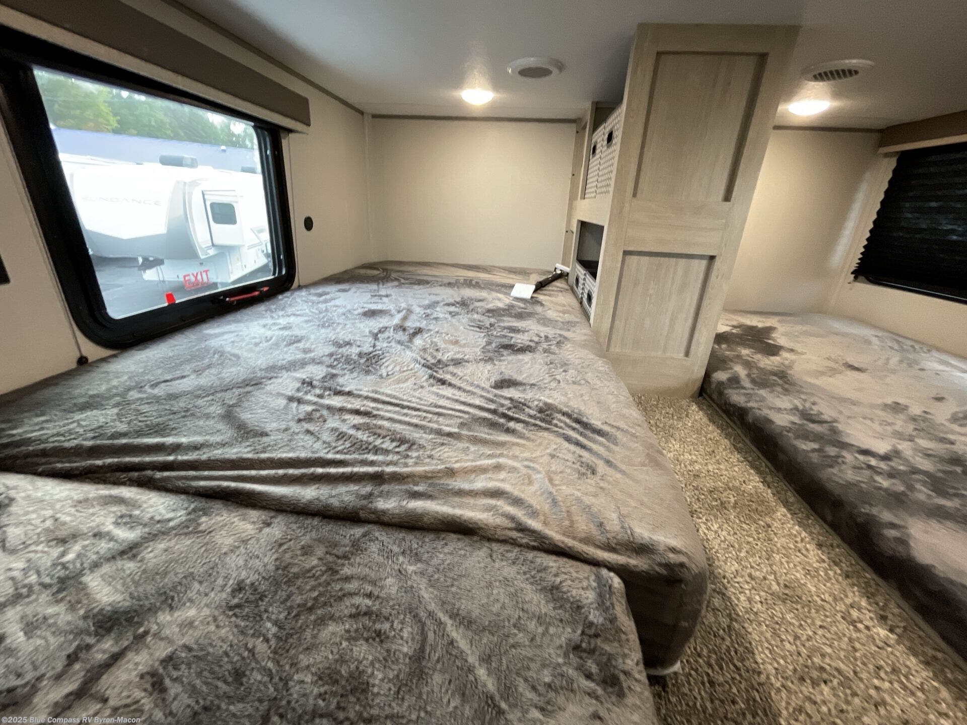 You won't believe the amount of comfort found throughout this destination trailer! The front private bedroom will provide you with your own space each night, and here you'll enjoy the RV queen bed slide out, wardrobe closets and a dresser, plus a bedroom fireplace for more comfort. The main living area is made spacious thanks to the large slide out, and the kitchen island with five bar stools will be the perfect place to dine together each day. There is also a hide-a-bed sectional sofa everyone is sure to enjoy relaxing on, and the power lift TV means you can make it a movie night! A spacious full rear bath includes a 48" x 30" shower with a seat and glass shower door and plenty of storage space to keep clean towels and bath necessities stocked. The feature you will really love on this trailer has to be the double loft areas, complete with five bunk mats in total and storage space for your guests' things; how convenient!