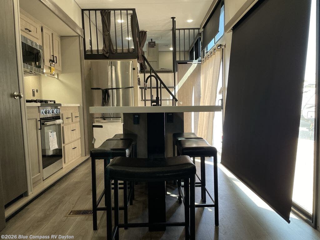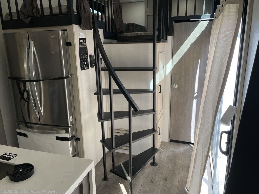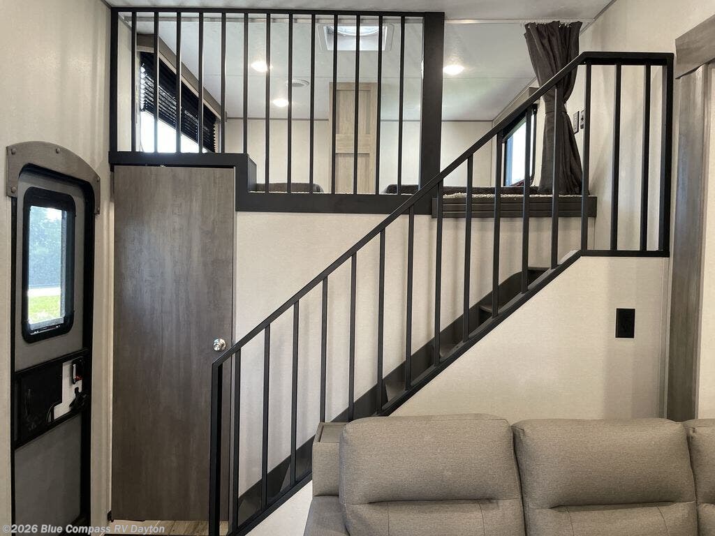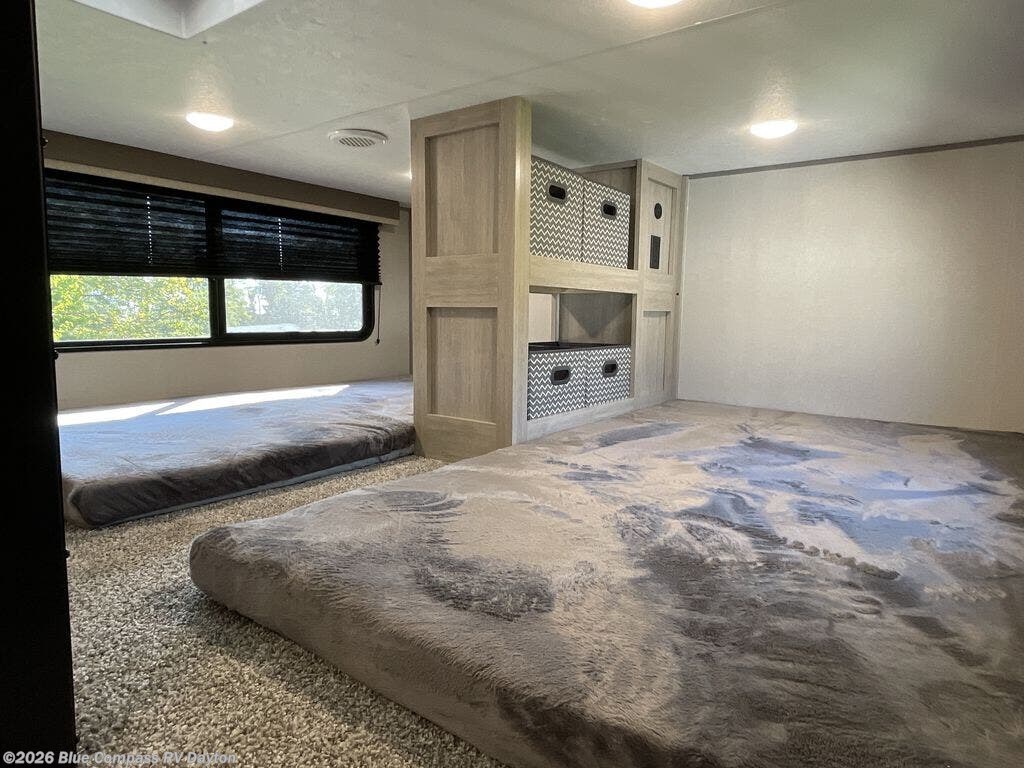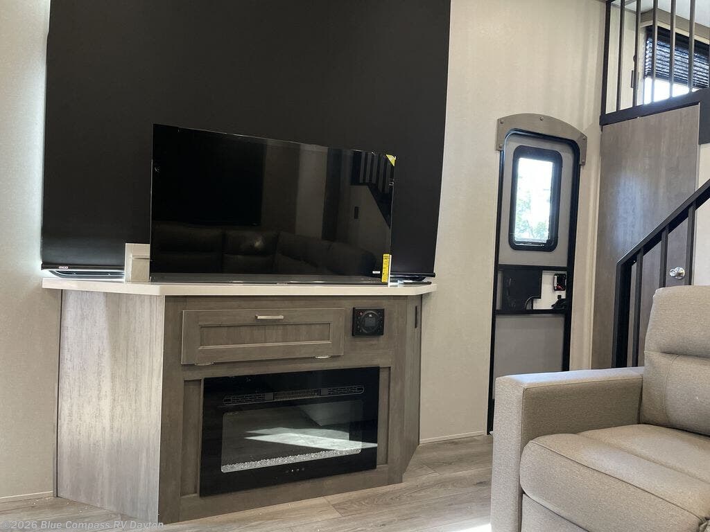 You won't believe the amount of comfort found throughout this destination trailer! The front private bedroom will provide you with your own space each night, and here you'll enjoy the RV queen bed slide out, wardrobe closets and a dresser, plus a bedroom fireplace for more comfort. The main living area is made spacious thanks to the large slide out, and the kitchen island with five bar stools will be the perfect place to dine together each day. There is also a hide-a-bed sectional sofa everyone is sure to enjoy relaxing on, and the power lift TV means you can make it a movie night! A spacious full rear bath includes a 48" x 30" shower with a seat and glass shower door and plenty of storage space to keep clean towels and bath necessities stocked. The feature you will really love on this trailer has to be the double loft areas, complete with five bunk mats in total and storage space for your guests' things; how convenient!