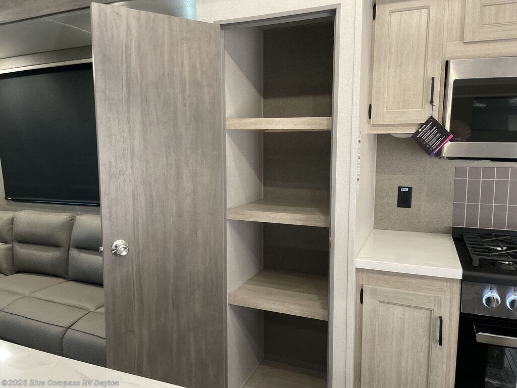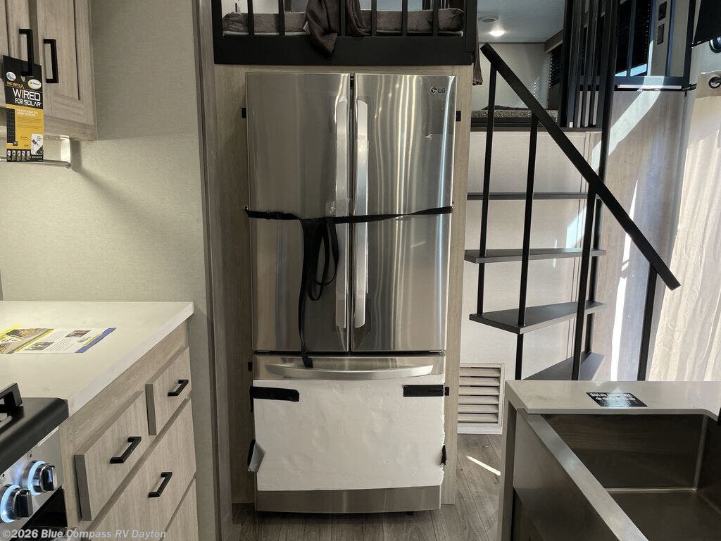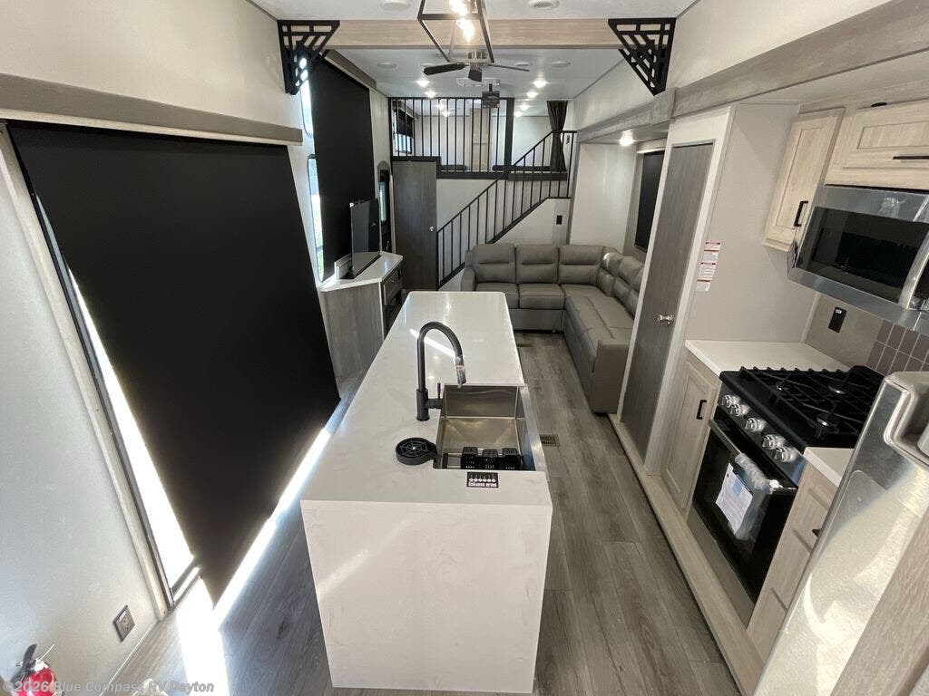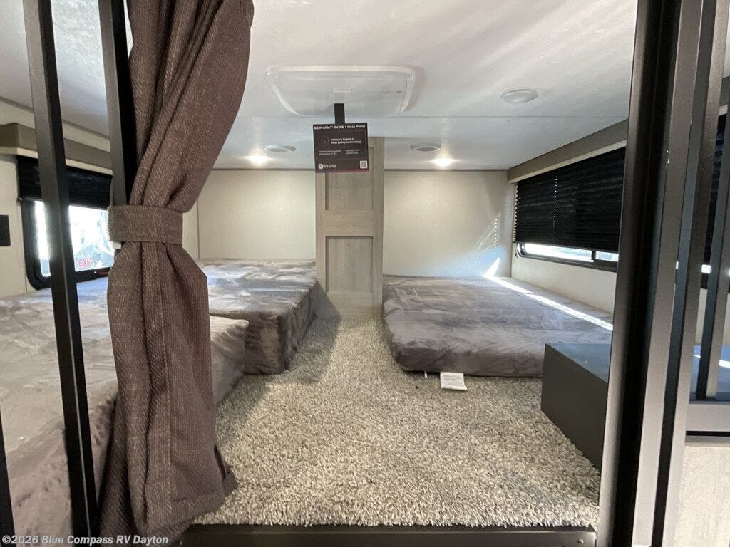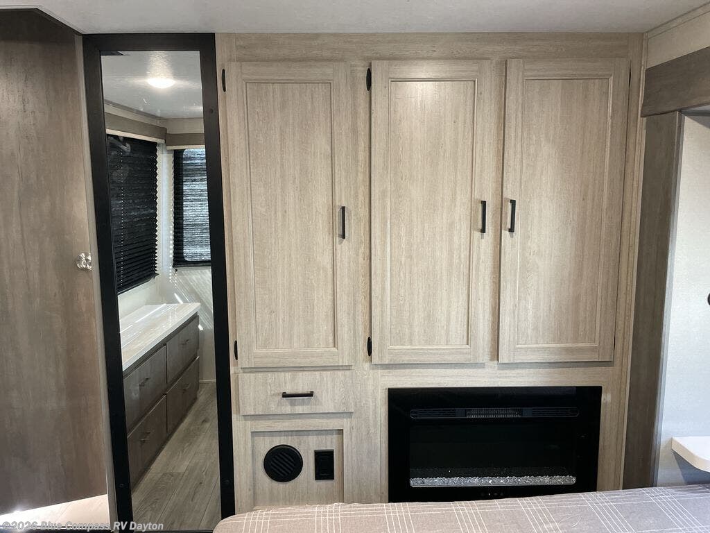 You won't believe the amount of comfort found throughout this destination trailer! The front private bedroom will provide you with your own space each night, and here you'll enjoy the RV queen bed slide out, wardrobe closets and a dresser, plus a bedroom fireplace for more comfort. The main living area is made spacious thanks to the large slide out, and the kitchen island with five bar stools will be the perfect place to dine together each day. There is also a hide-a-bed sectional sofa everyone is sure to enjoy relaxing on, and the power lift TV means you can make it a movie night! A spacious full rear bath includes a 48" x 30" shower with a seat and glass shower door and plenty of storage space to keep clean towels and bath necessities stocked. The feature you will really love on this trailer has to be the double loft areas, complete with five bunk mats in total and storage space for your guests' things; how convenient!