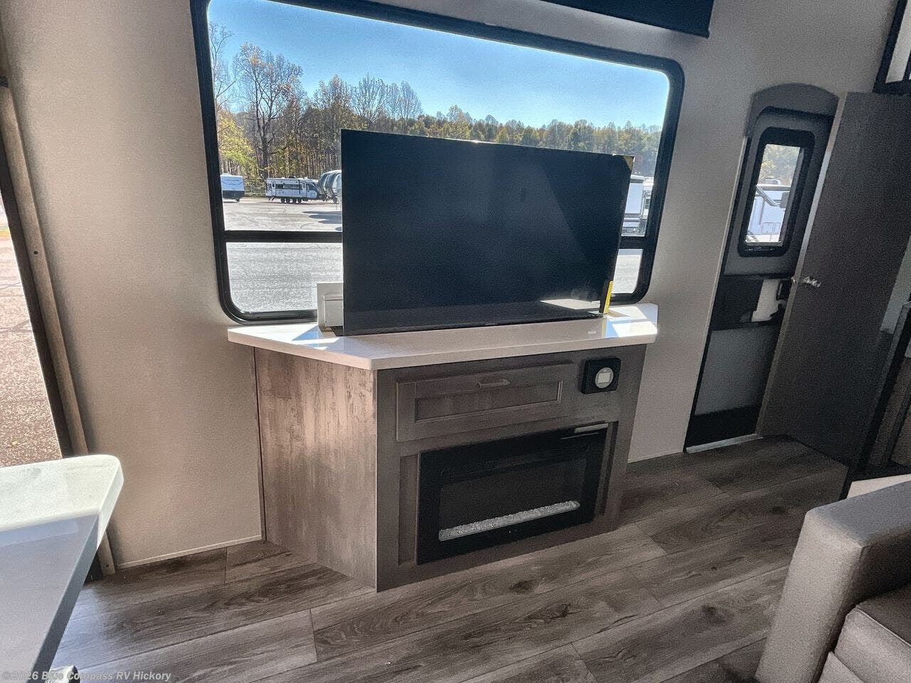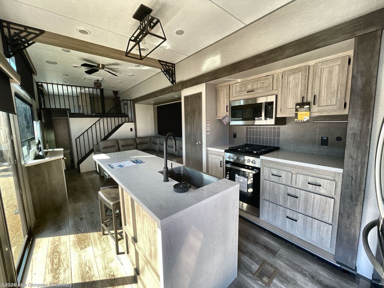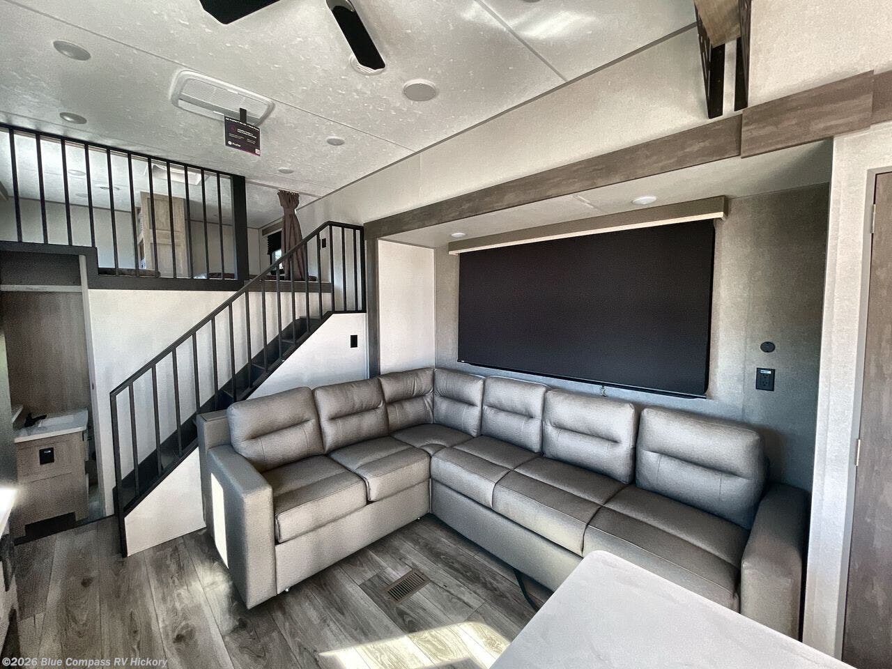 You won't believe the amount of comfort found throughout this destination trailer! The front private bedroom will provide you with your own space each night, and here you'll enjoy the RV queen bed slide out, wardrobe closets and a dresser, plus a bedroom fireplace for more comfort. The main living area is made spacious thanks to the large slide out, and the kitchen island with five bar stools will be the perfect place to dine together each day. There is also a hide-a-bed sectional sofa everyone is sure to enjoy relaxing on, and the power lift TV means you can make it a movie night! A spacious full rear bath includes a 48" x 30" shower with a seat and glass shower door and plenty of storage space to keep clean towels and bath necessities stocked. The feature you will really love on this trailer has to be the double loft areas, complete with five bunk mats in total and storage space for your guests' things; how convenient!
