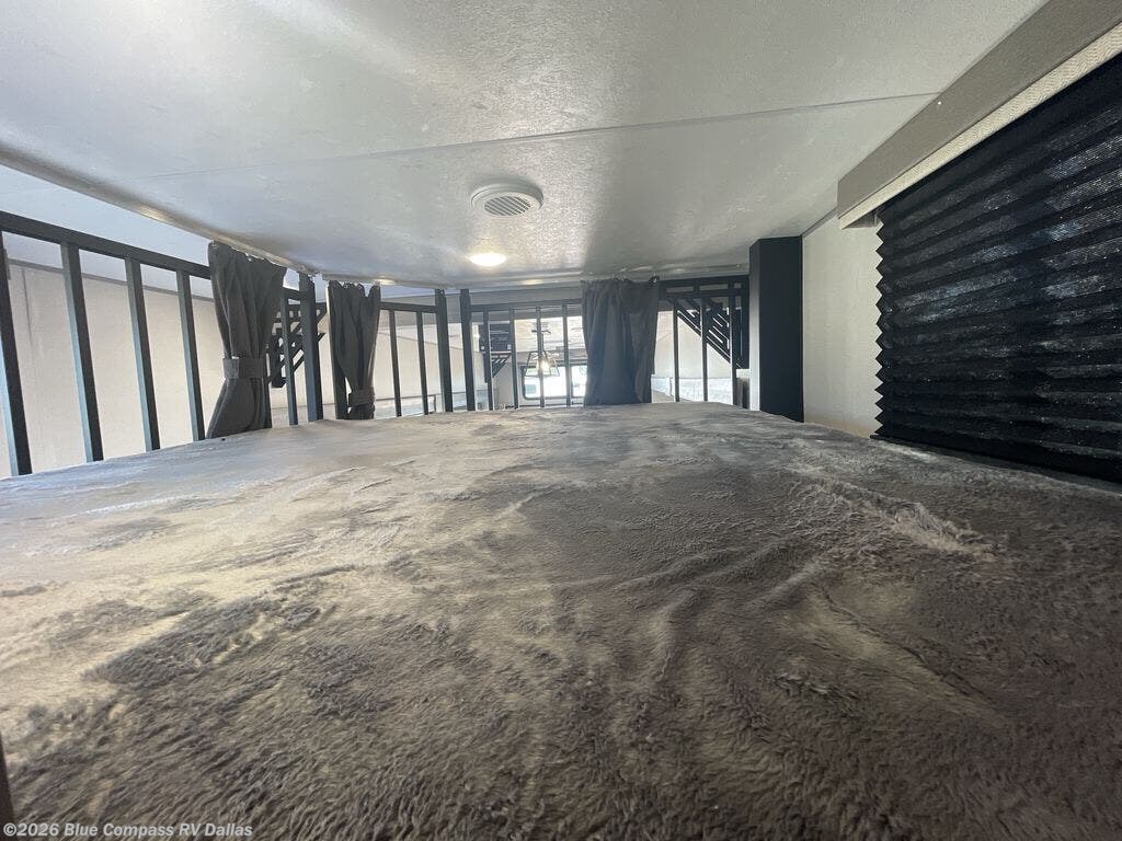 You won't believe the amount of comfort found throughout this destination trailer! The front private bedroom will provide you with your own space each night, and here you'll enjoy the RV queen bed slide out, wardrobe closets and a dresser, plus a bedroom fireplace for more comfort. The main living area is made spacious thanks to the large slide out, and the kitchen island with five bar stools will be the perfect place to dine together each day. There is also a hide-a-bed sectional sofa everyone is sure to enjoy relaxing on, and the power lift TV means you can make it a movie night! A spacious full rear bath includes a 48" x 30" shower with a seat and glass shower door and plenty of storage space to keep clean towels and bath necessities stocked. The feature you will really love on this trailer has to be the double loft areas, complete with five bunk mats in total and storage space for your guests' things; how convenient!