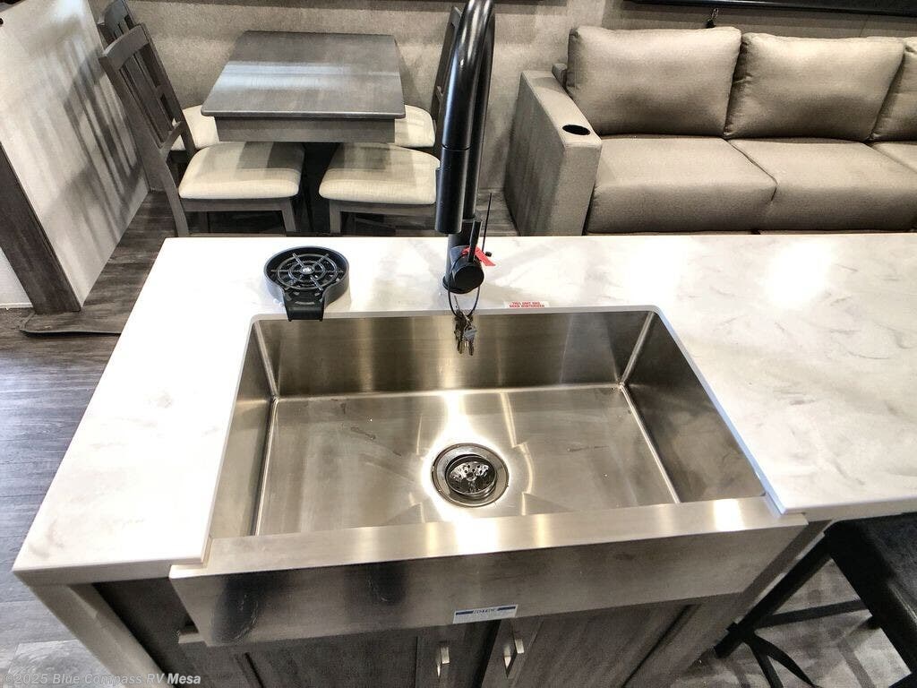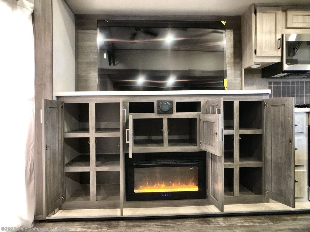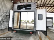 There is much to love about this destination trailer! Starting with the loft that has two queen beds, a wardrobe/storage, and a custom 58" x 71" bed. Downstairs there's a private bedroom with a king bed slide, a fireplace, and its very own private full bathroom complete with a dual sink vanity. The main living area has a huge bi-fold sleeper sectional sofa so you can fit even more guests, or just relax and watch the TV on the power lift in the entertainment center. The kitchen is well-equipped with a residential refrigerator, microwave, and pantry. The centerpiece here is a kitchen island with a deep basin farm-style sink and bar stool seating so your group can gather together and make new memories.