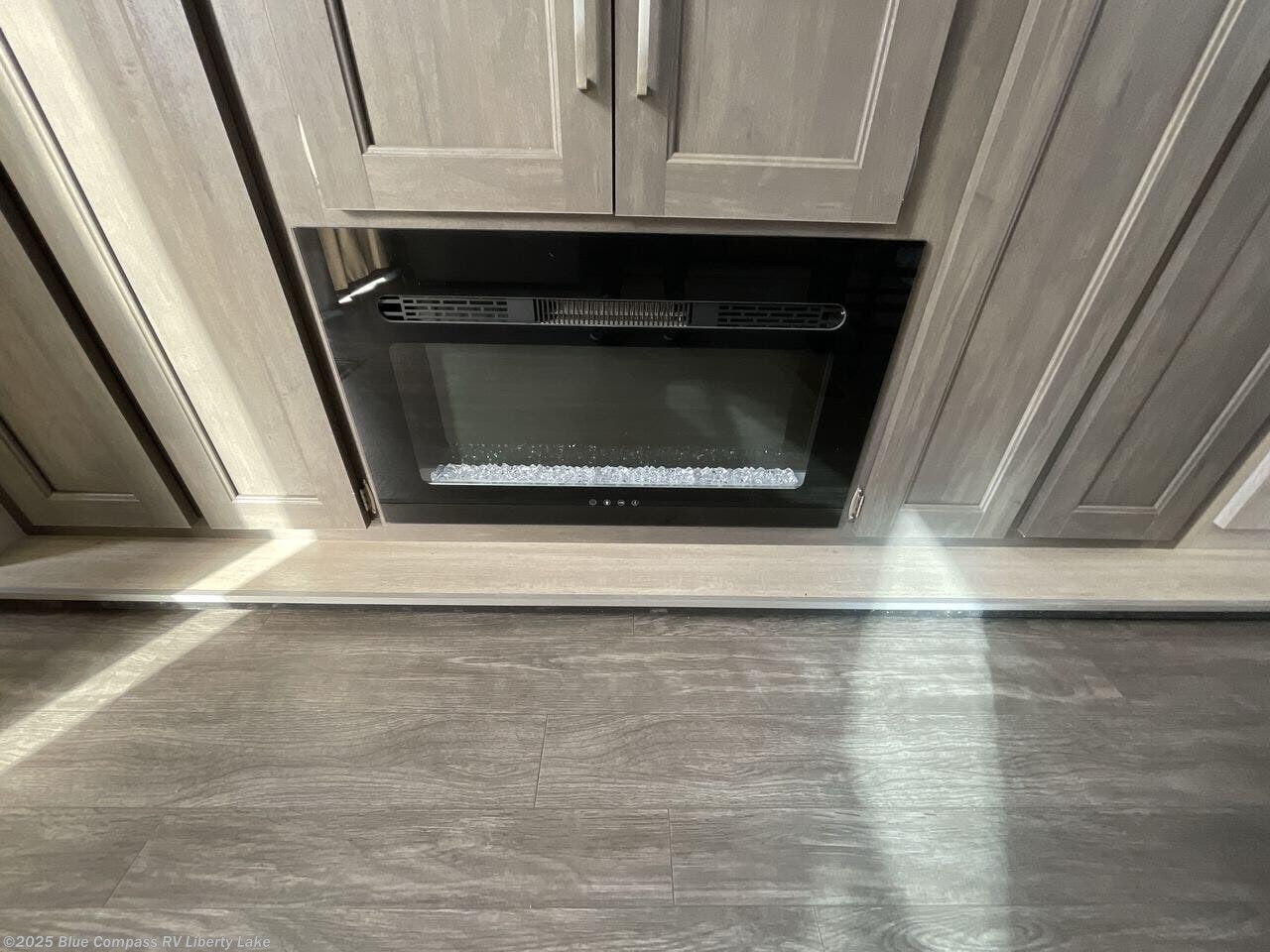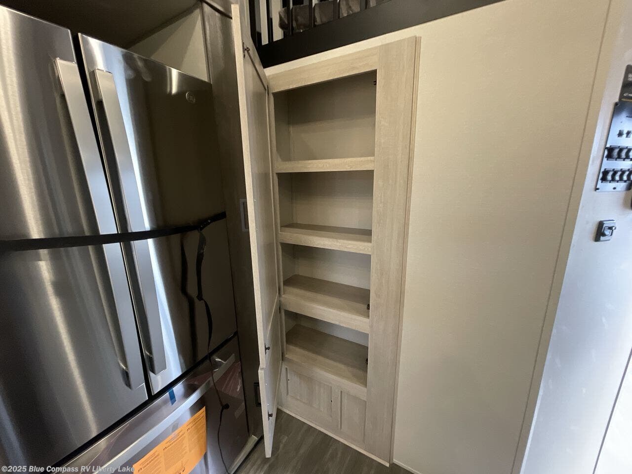 There is much to love about this destination trailer! Starting with the loft that has two queen beds, a wardrobe/storage, and a custom 58" x 71" bed. Downstairs there's a private bedroom with a king bed slide, a fireplace, and its very own private full bathroom complete with a dual sink vanity. The main living area has a huge bi-fold sleeper sectional sofa so you can fit even more guests, or just relax and watch the TV on the power lift in the entertainment center. The kitchen is well-equipped with a residential refrigerator, microwave, and pantry. The centerpiece here is a kitchen island with a deep basin farm-style sink and bar stool seating so your group can gather together and make new memories.