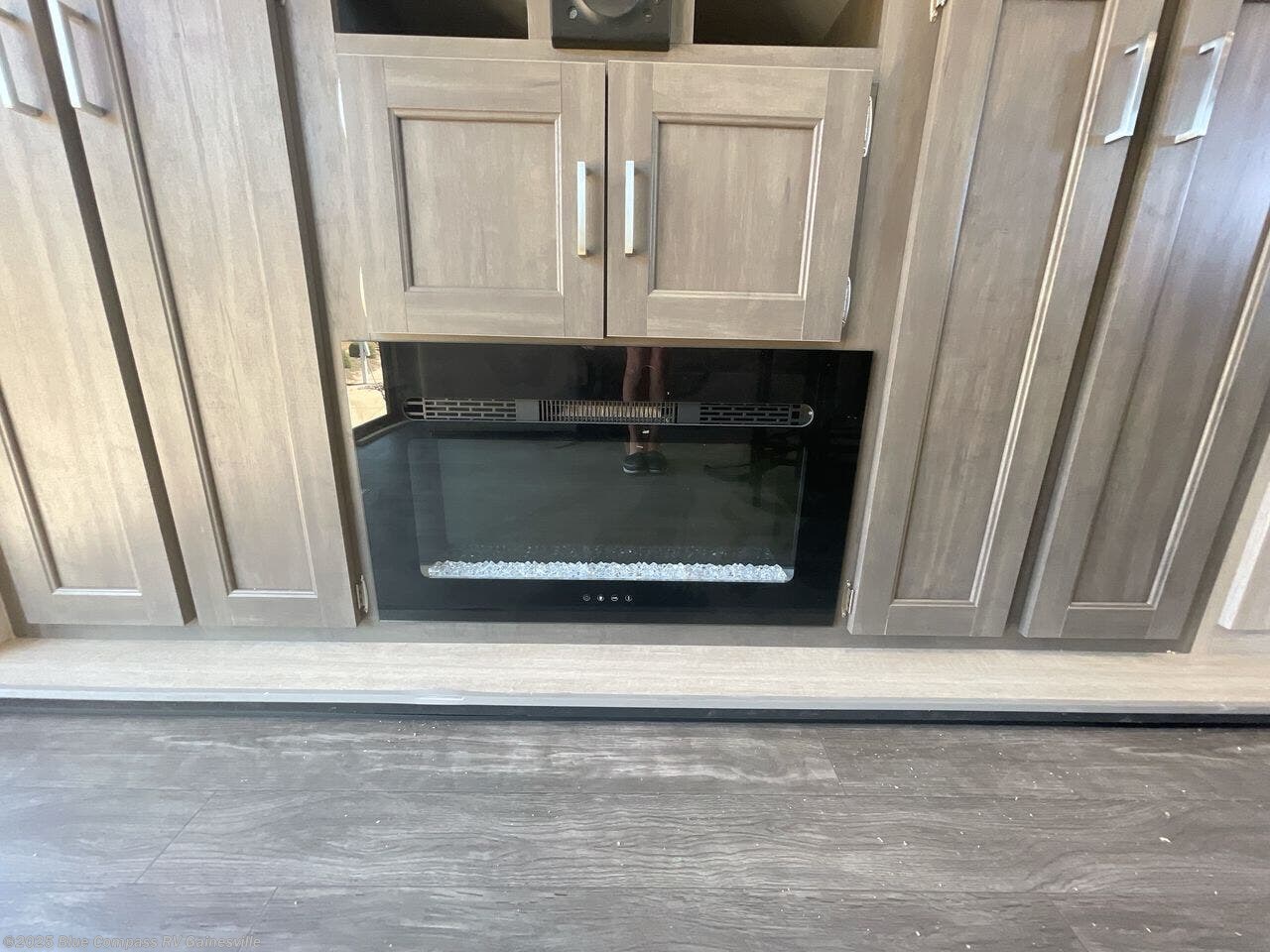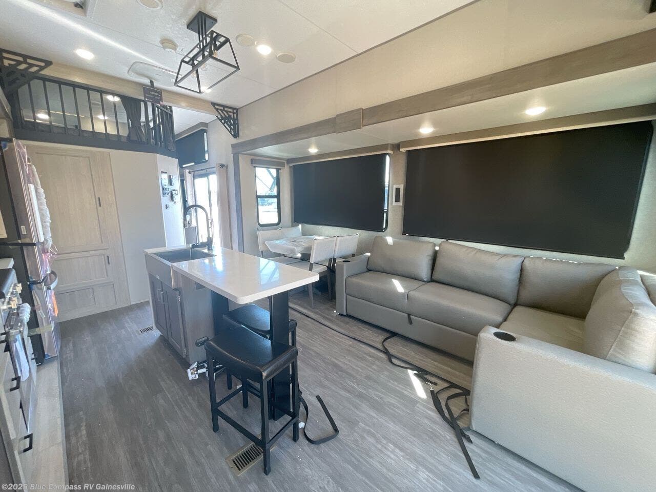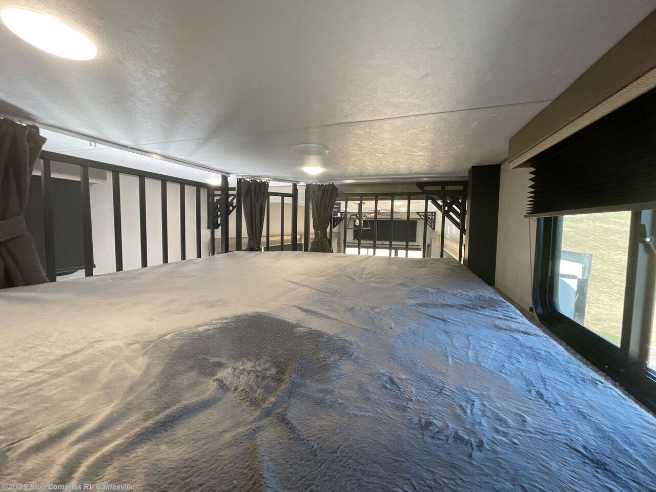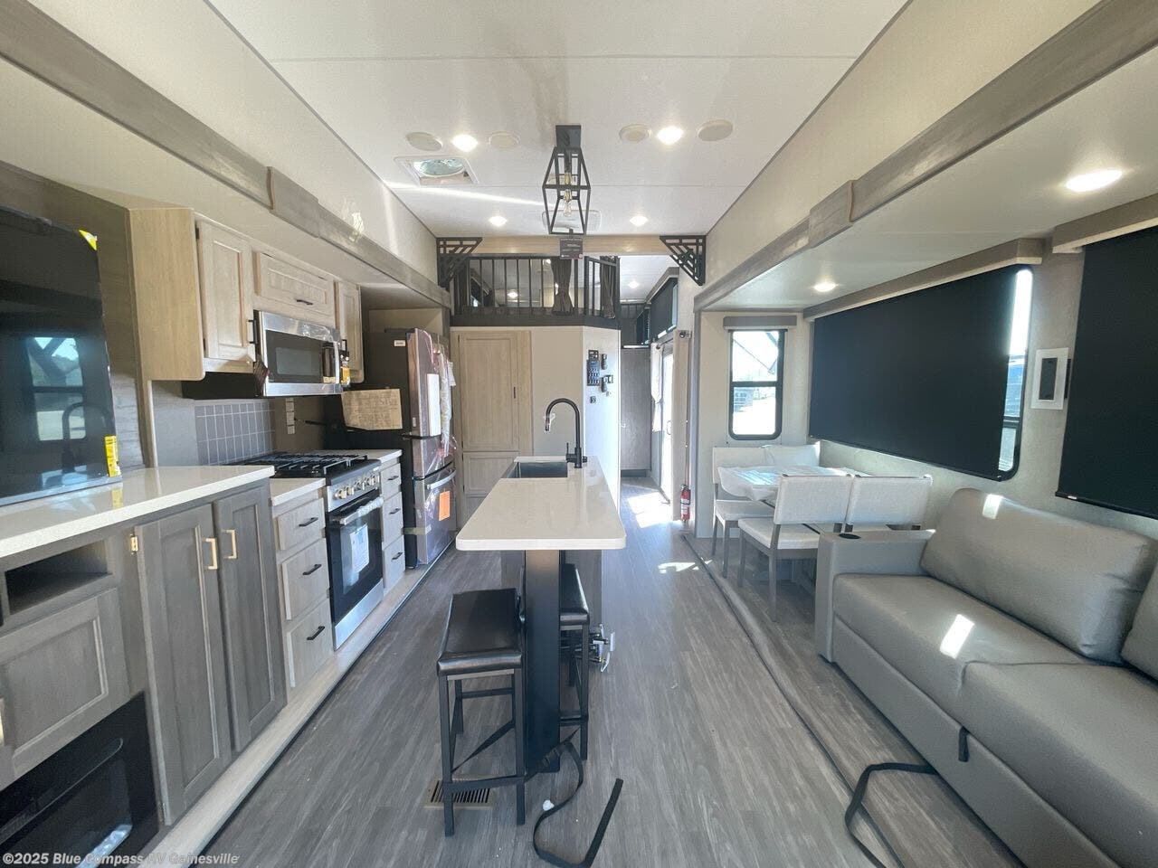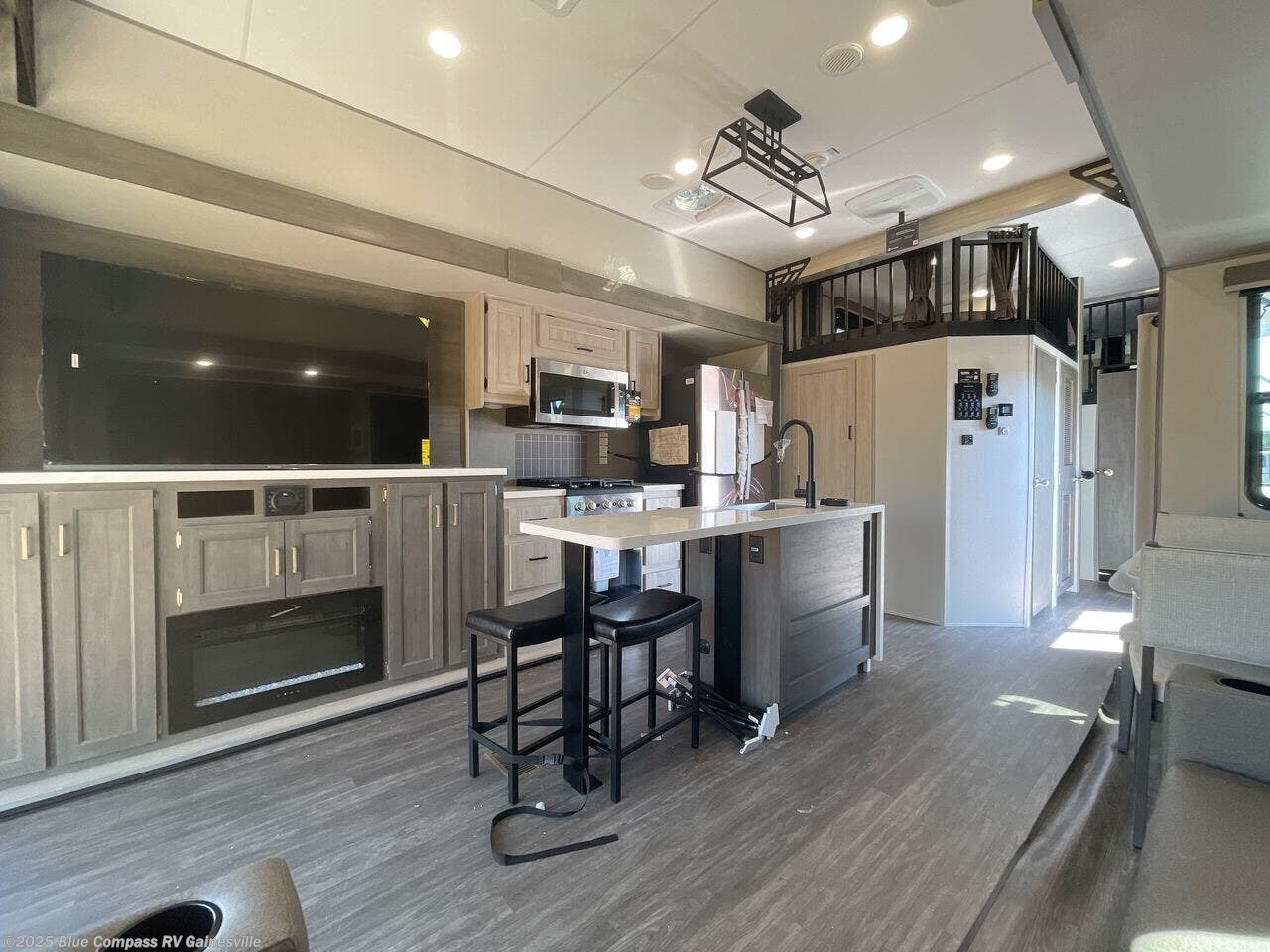 There is much to love about this destination trailer! Starting with the loft that has two queen beds, a wardrobe/storage, and a custom 58" x 71" bed. Downstairs there's a private bedroom with a king bed slide, a fireplace, and its very own private full bathroom complete with a dual sink vanity. The main living area has a huge bi-fold sleeper sectional sofa so you can fit even more guests, or just relax and watch the TV on the power lift in the entertainment center. The kitchen is well-equipped with a residential refrigerator, microwave, and pantry. The centerpiece here is a kitchen island with a deep basin farm-style sink and bar stool seating so your group can gather together and make new memories.